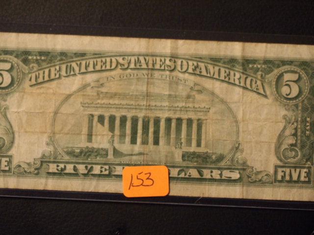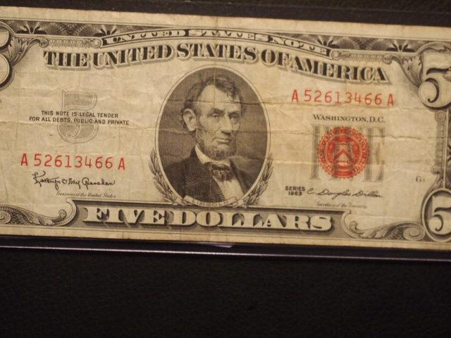 1963 Red Seal $5.00 Bill in protector in very nice condition