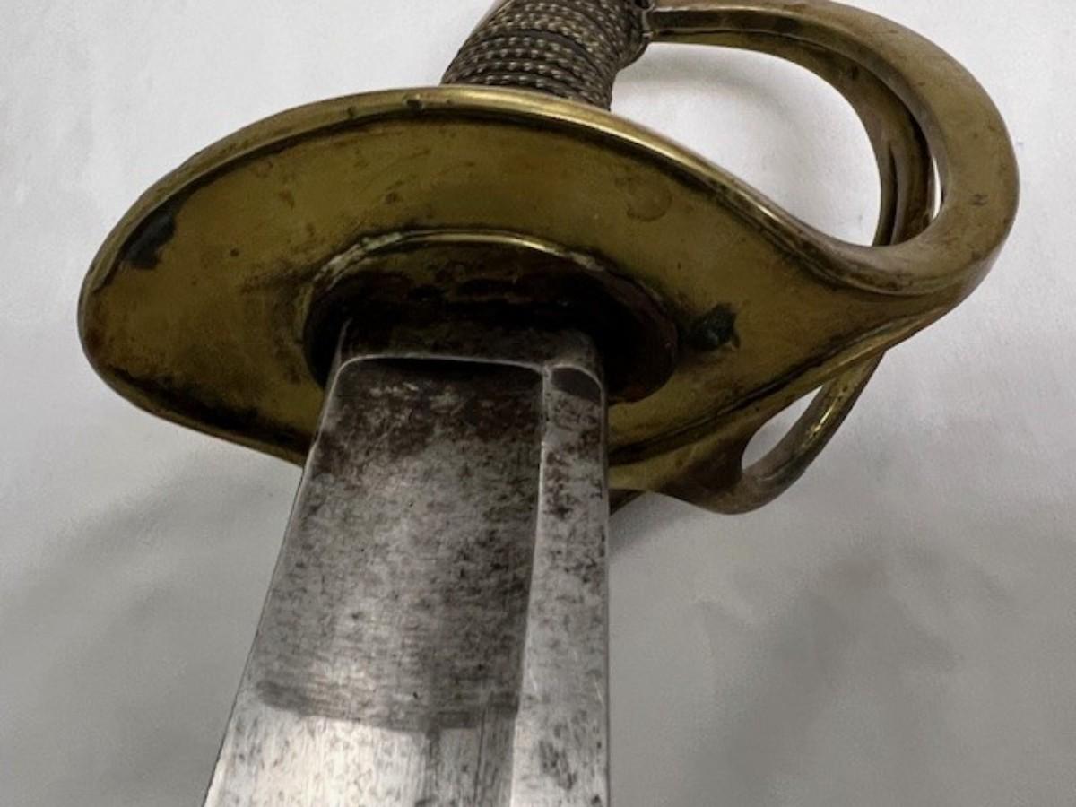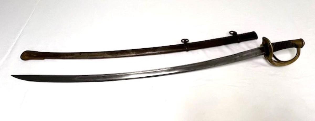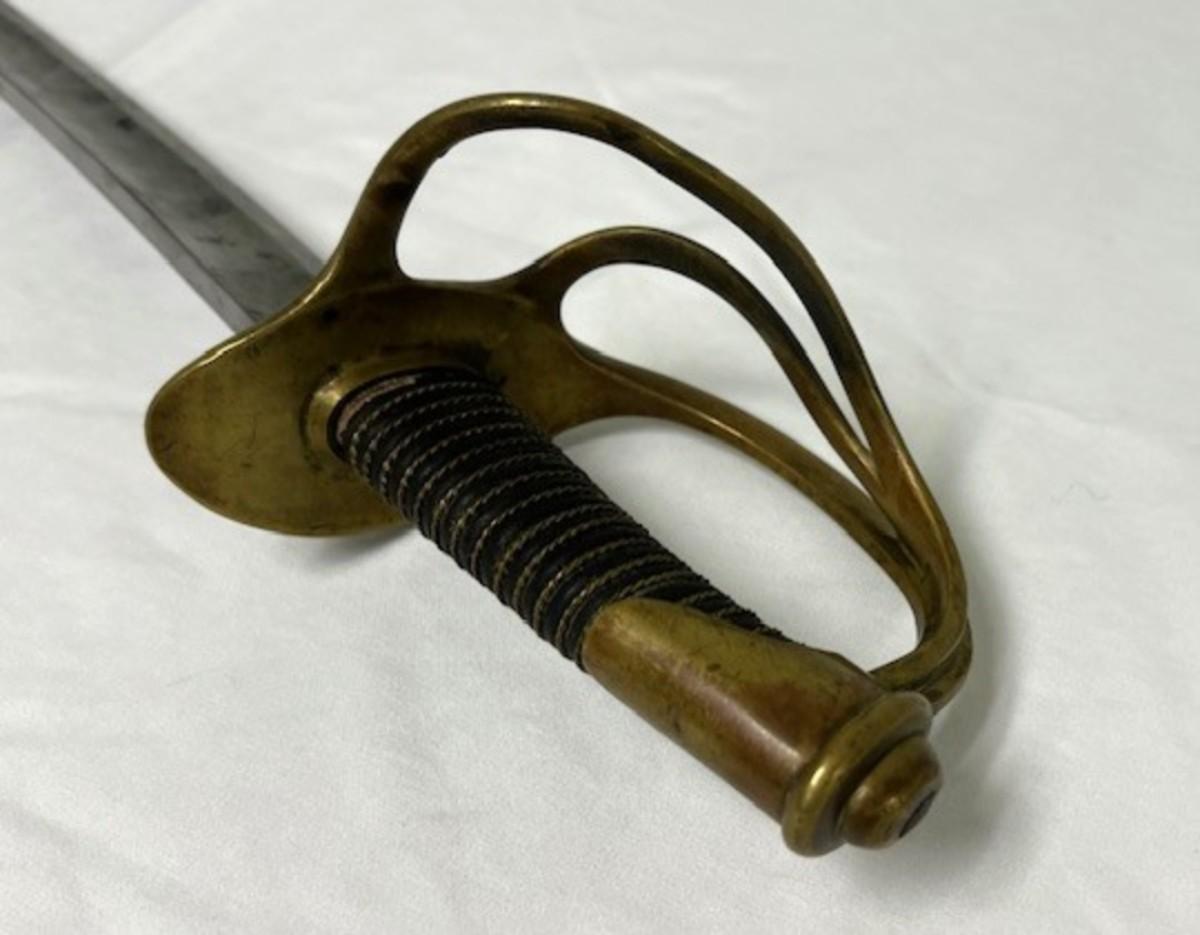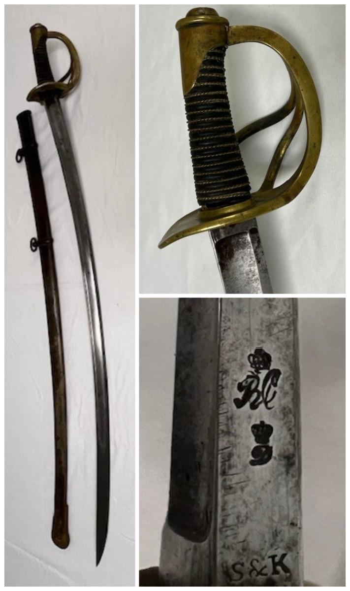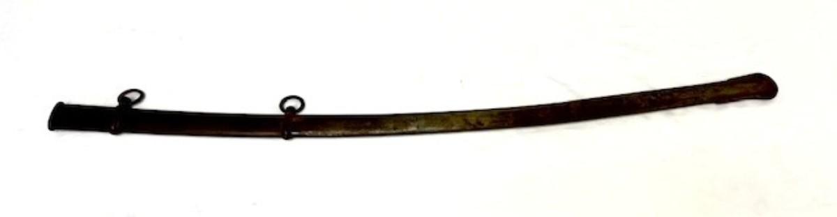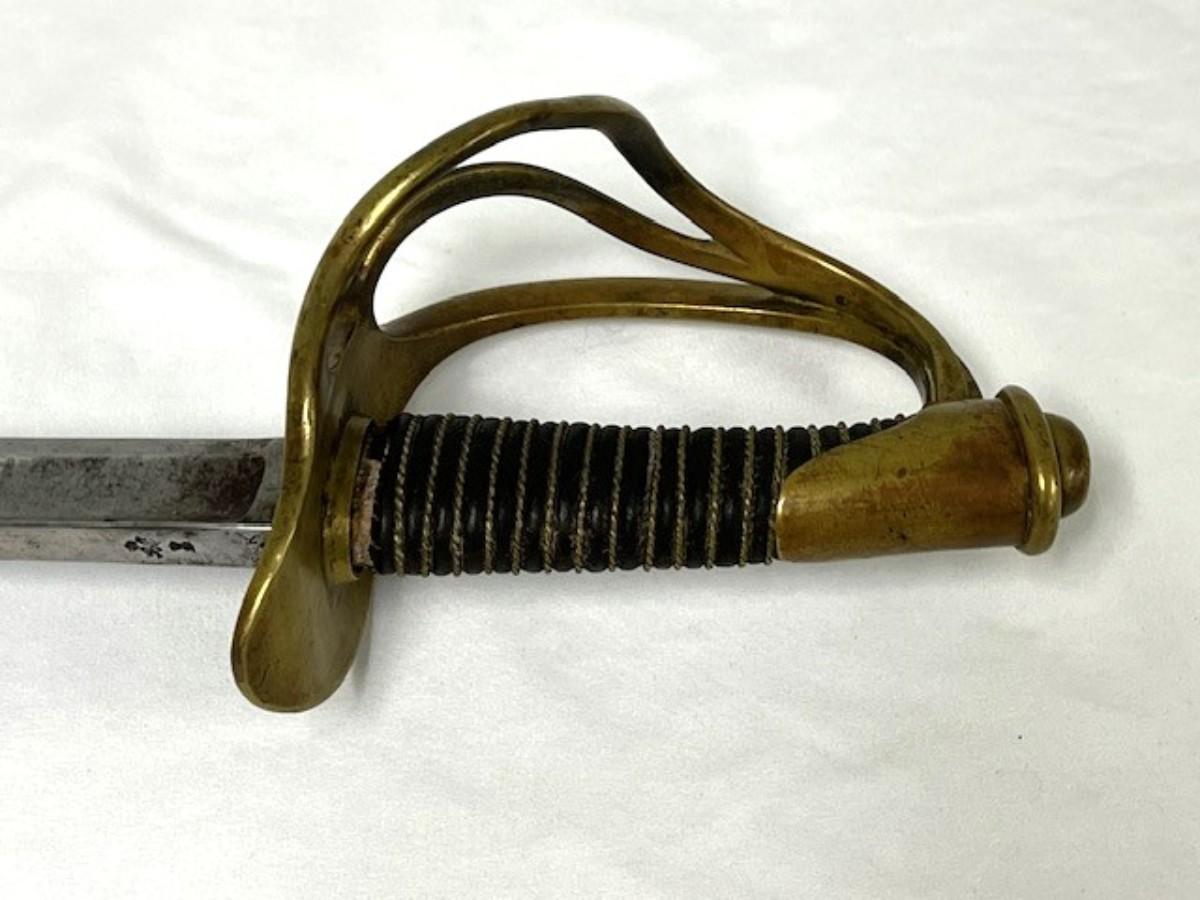 Most likely late 19th or early 20th Century sword. Two-branch brass guard and pommel with leather grip wrapped with twisted brass wire. Impressed "K&C" at ricasso. Surface wear with no chunks or missing steel. There are some areas of surface rust. Approximately 36" in length. Scabbard may or may not be correct to sword. [RS]