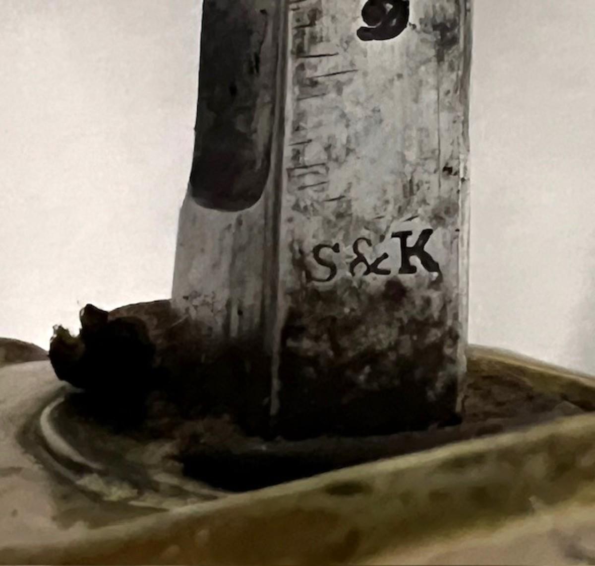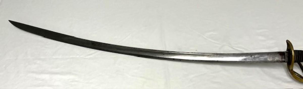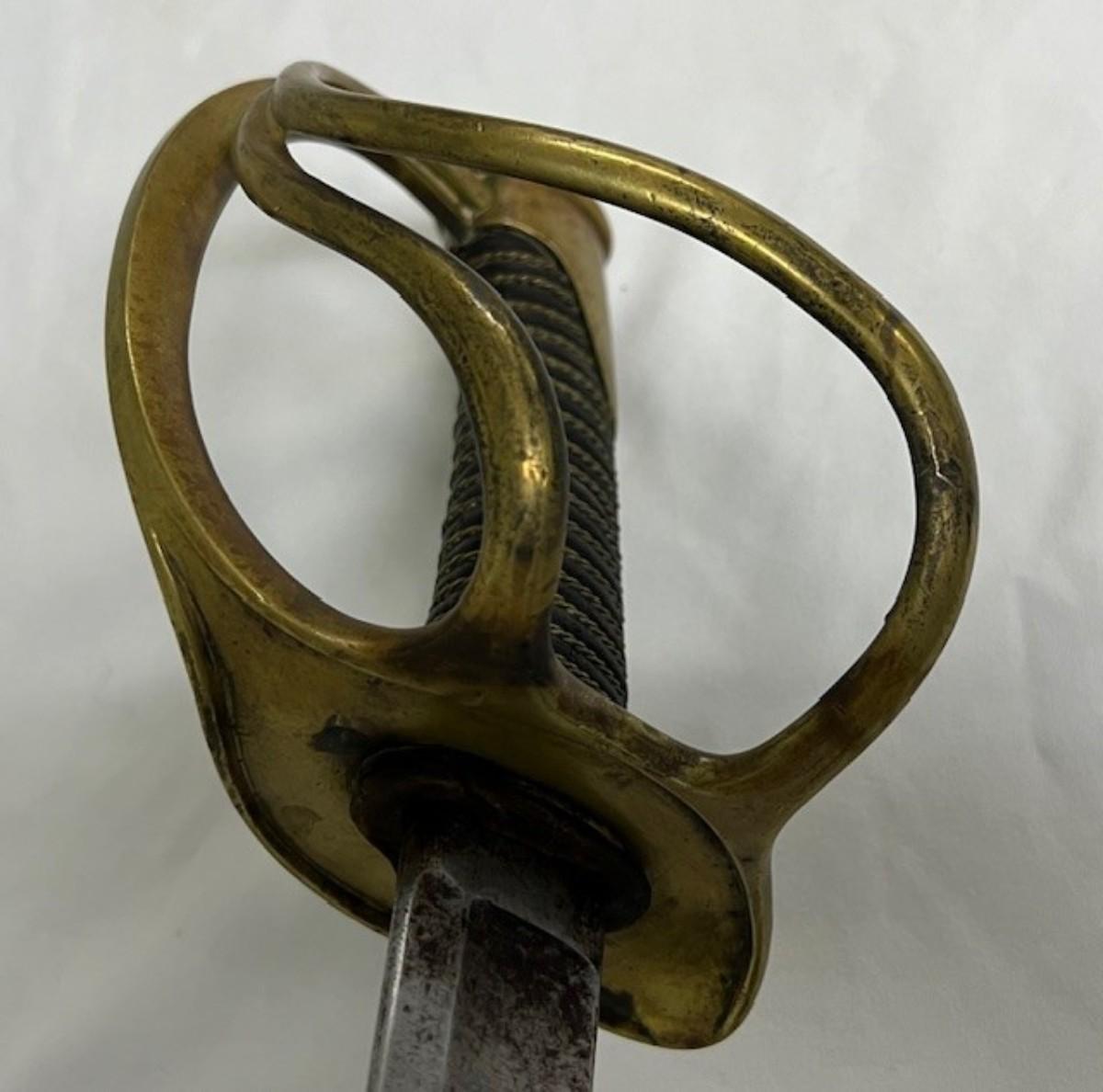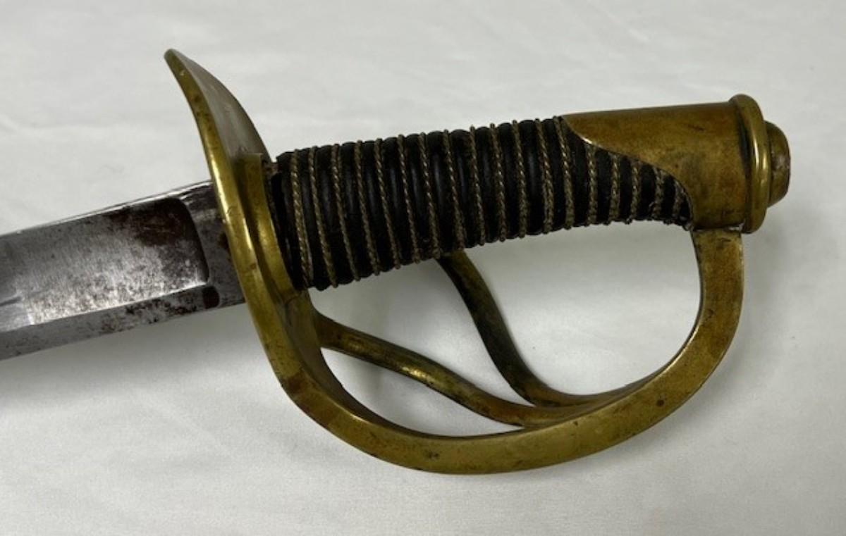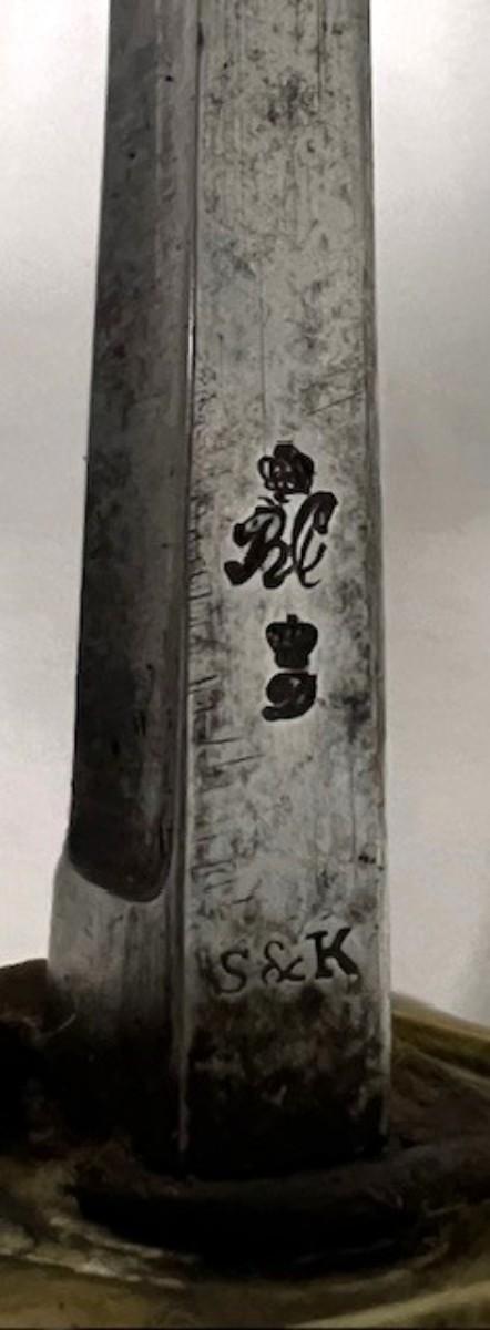 Most likely late 19th or early 20th Century sword. Two-branch brass guard and pommel with leather grip wrapped with twisted brass wire. Impressed "K&C" at ricasso. Surface wear with no chunks or missing steel. There are some areas of surface rust. Approximately 36" in length. Scabbard may or may not be correct to sword. [RS]