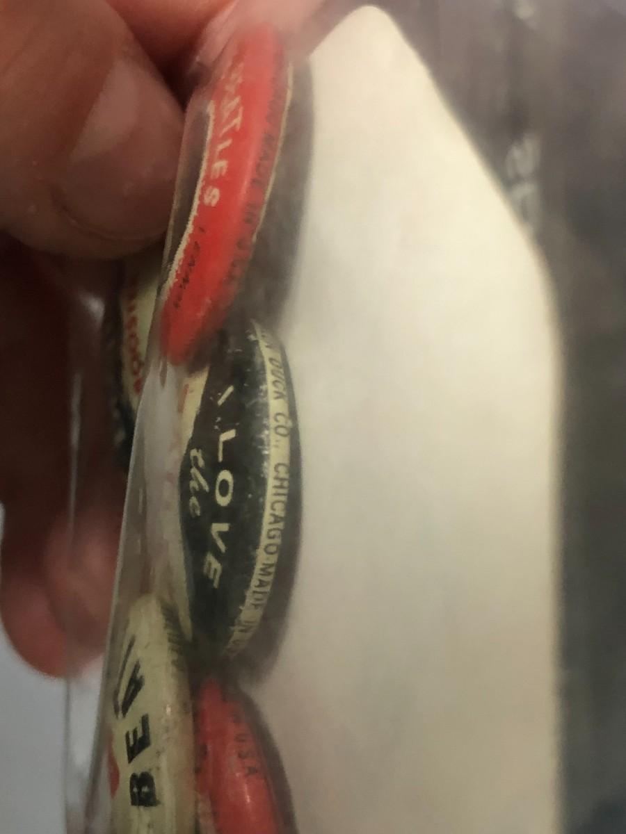 Rare set of vintage 1964 Beatles fan buttons, including the vending machine label. 9 buttons in total. Very good condition. Don't miss out on this great set of original Beatles fan gear!