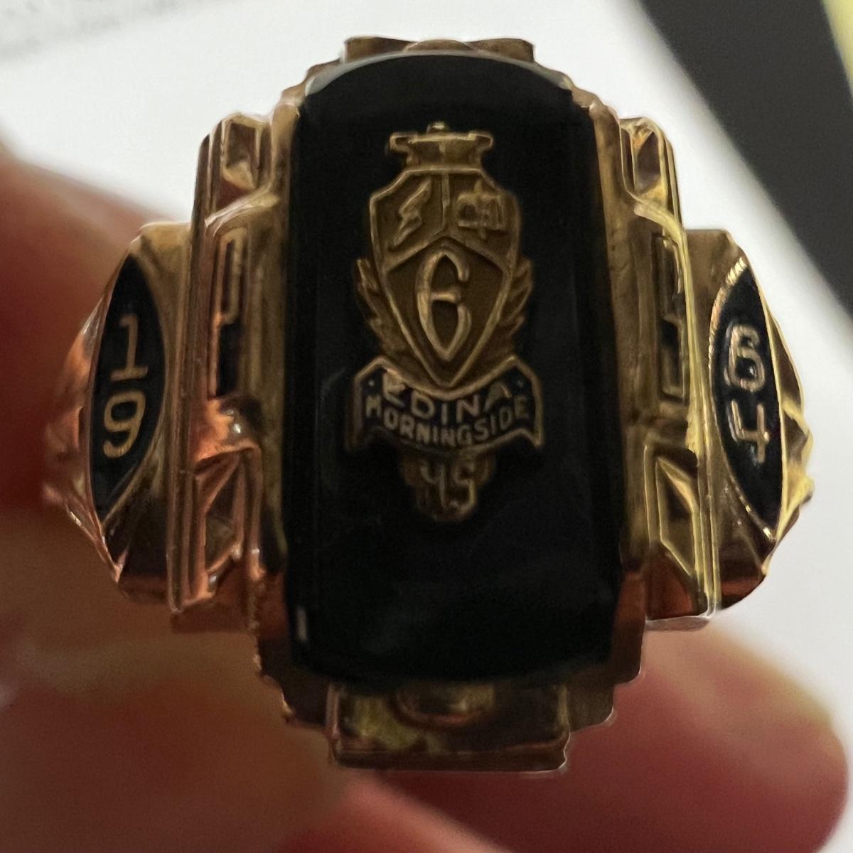 Lot includes a 1964 Jostens class ring marked 10K with green colored stone. Front has the words - Edina, Morningside.