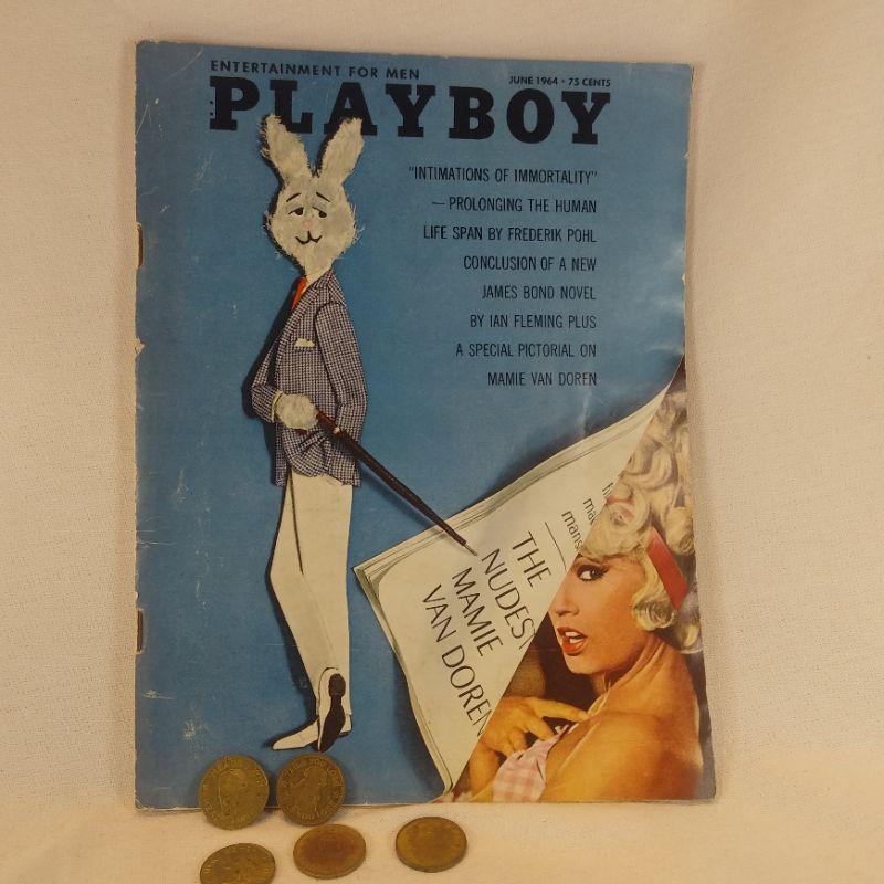 The Playboy is from June 1964 - Featuring Mamie Van Doren. Also included are 5 naughty betting coins. We've included a picture of the ad page showing new toys for men - what, you expected the centerfold? Magazine is in very good condition and coins show tarnish.