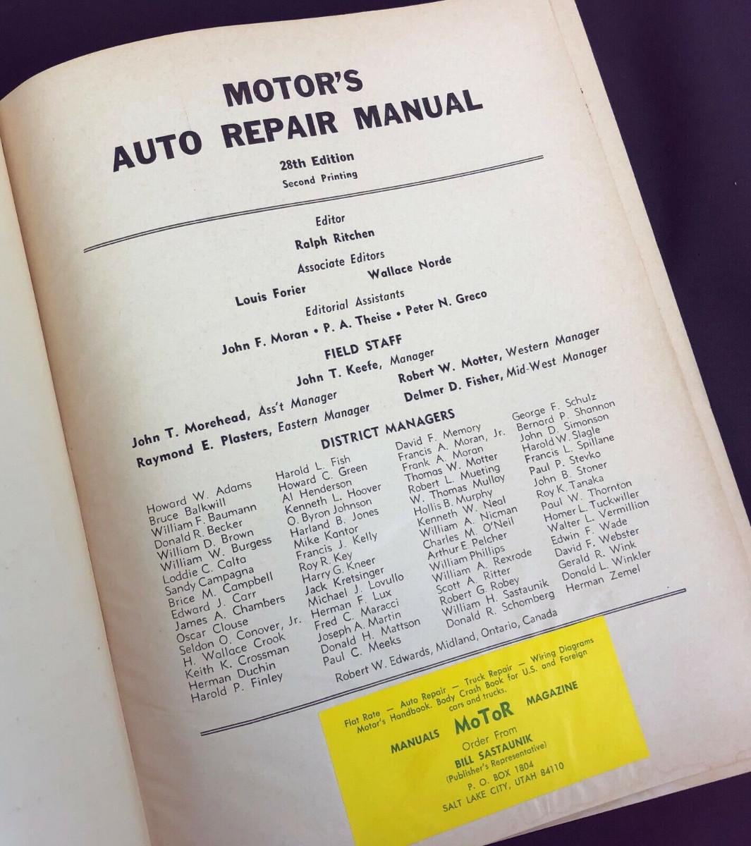 Some normal use wear on this hardcover..complete...MOTOR'S AUTO REPAIR MANUAL 1965...28th edition...Clean interior...1,325pages...Covers Mechanical Specifications and Service Procedures on 1958-65 Models(US and VW)...Foreign Car Tune Up Data..1941-57 Tune Up Data and Wheel Alignment.