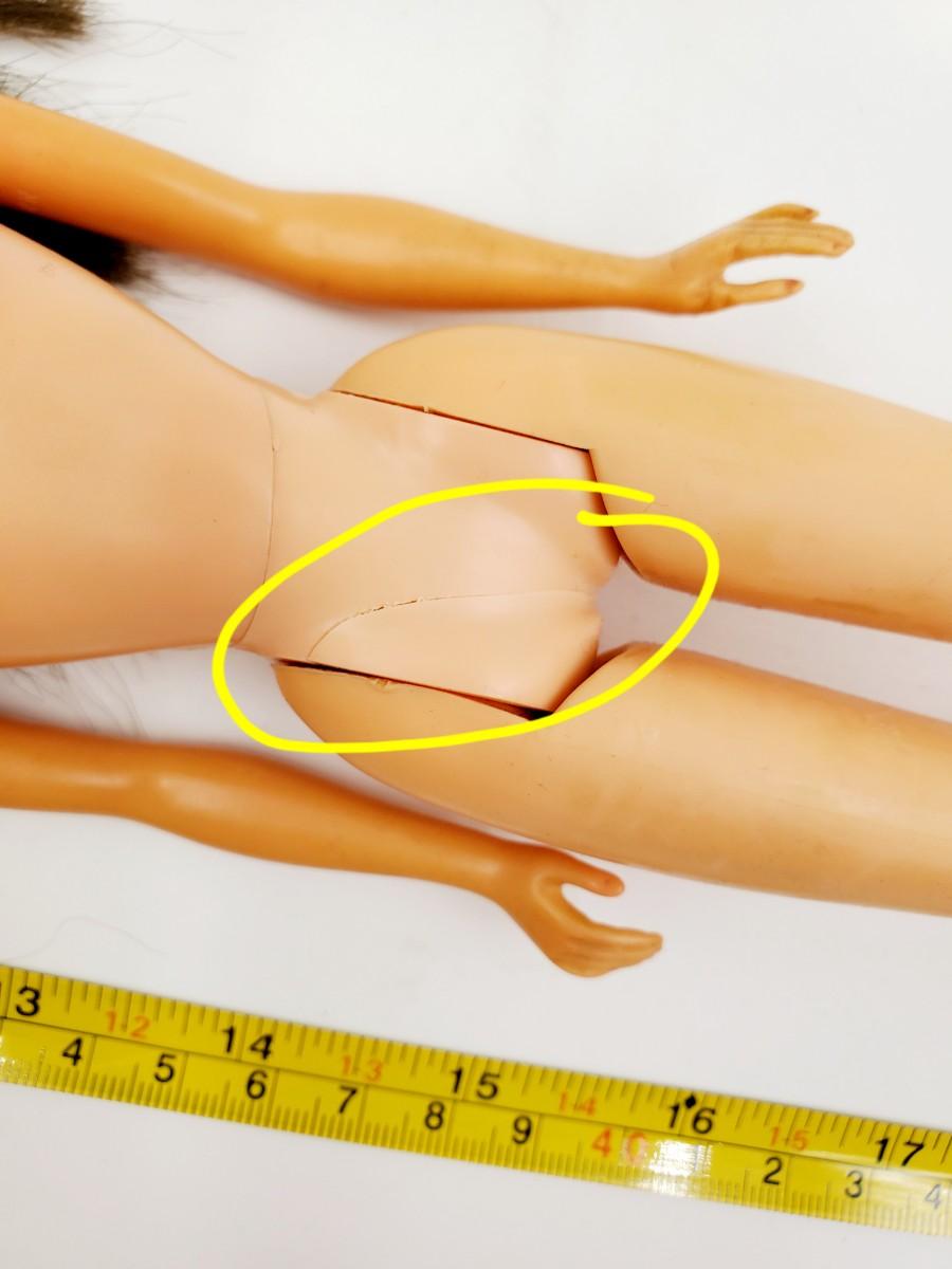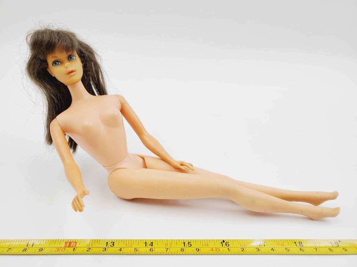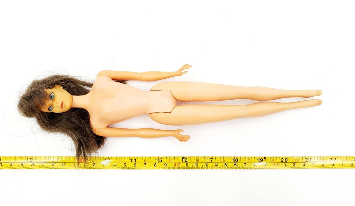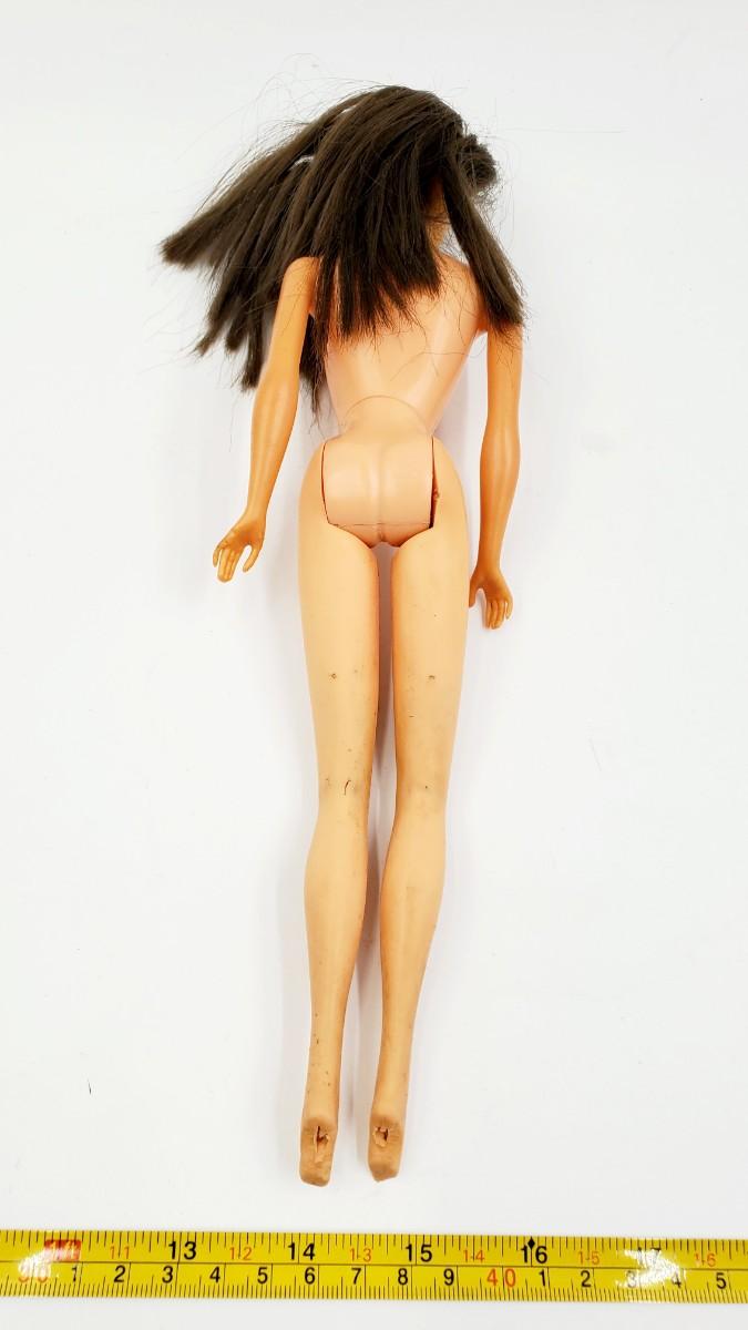 This 1966 Barbie has brown hair and blue eyes, she swivels at the waist as she should. Her nose does have some wear as do her legs and a crack in her pelvic area, please see photos. 1966 Mattel ,Inc Japan stamped on back, see photos. Legs still bend. Clothing included although they may be handmade, I did not see a Barbie tag. She does have some minor flaws but still an awesome addition to any Barbie collection!