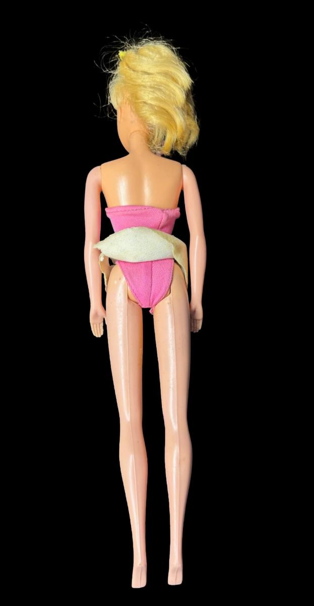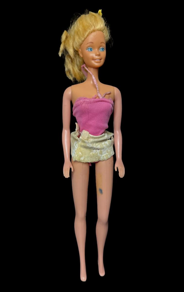 Made in the Philippines. Believed to be original clothing. There is age related wear, including a stain on the left leg. The clothing shows wear (both the suit and skirt). Measurement: 12”H. [LD]