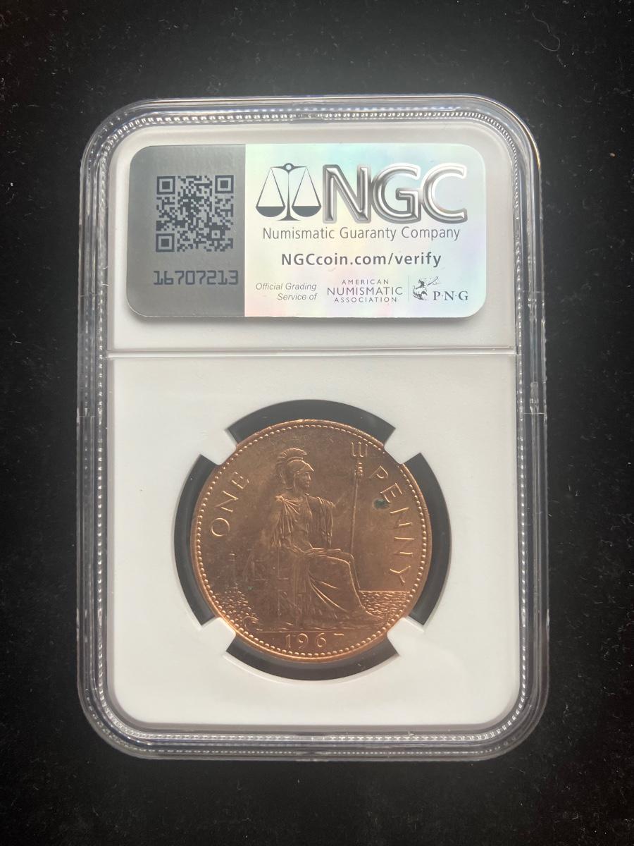 A certified 1967 Great Britain bronze Penny — the very last year of the classic large pre-decimal penny before decimalization changed British currency forever in 1971!