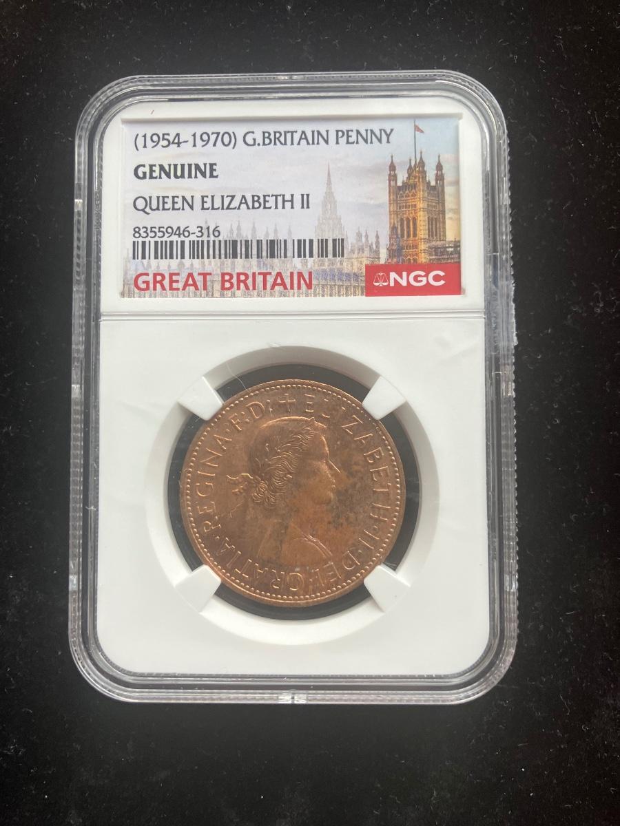 This high-mintage date (over 654 million struck) features the young Queen Elizabeth II portrait on the obverse and the iconic seated Britannia on the reverse. Encapsulated by NGC with "Genuine" designation (cert #83559946-316), confirming authenticity in a protective holder. No numerical grade is assigned (typical for circulated bronze coins with minor surface/toning issues), but it's fully authentic and ready for any world coin or type set collection.