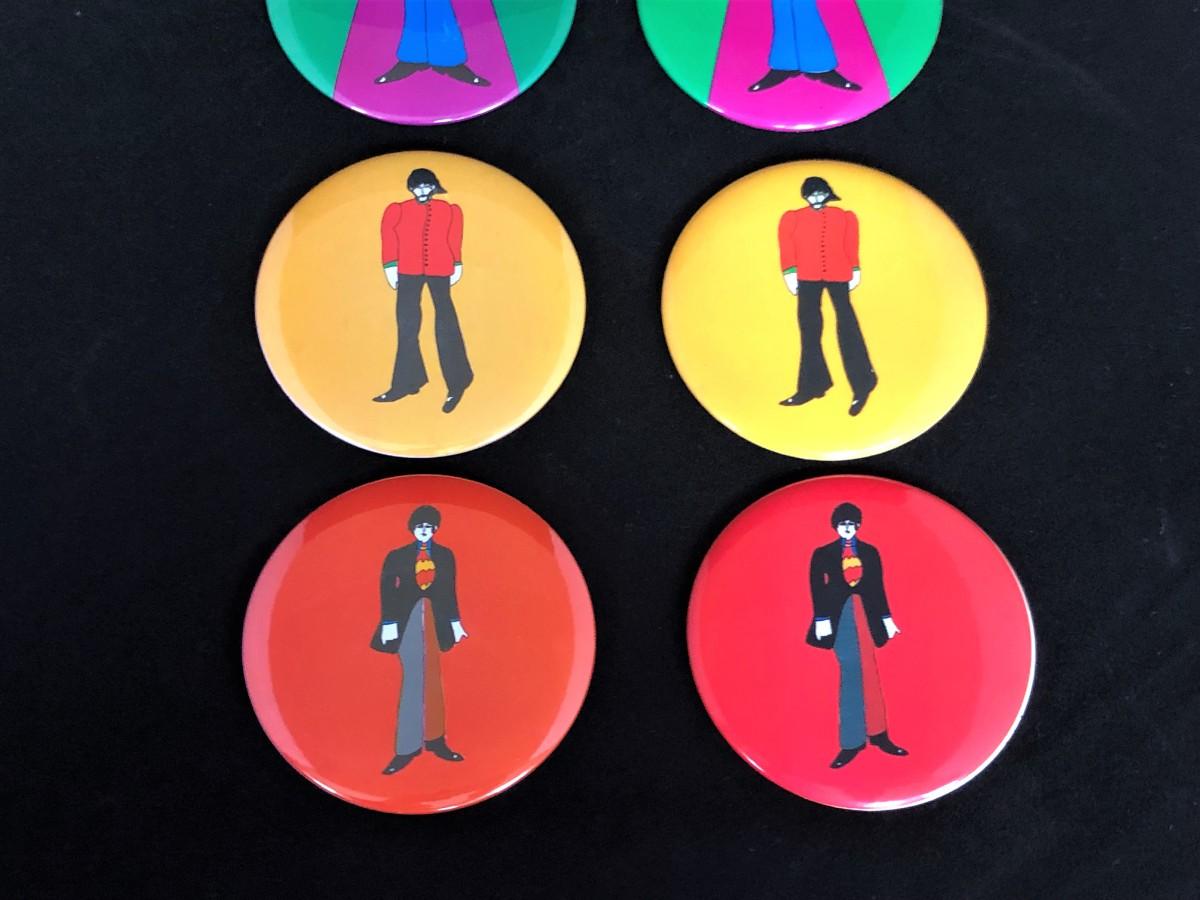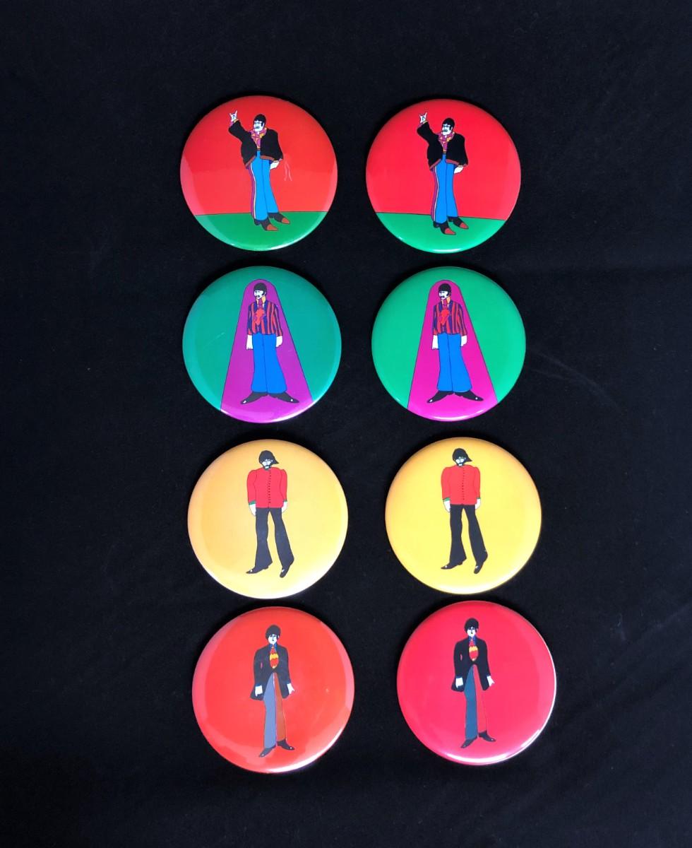Two sets of 4 Beatles buttons from 1968. One set is in very good condition, and the other is in good condition (with more faded colors). 8 buttons total. Button rim says King Features Primrose Confectionary Ltd Siough England.