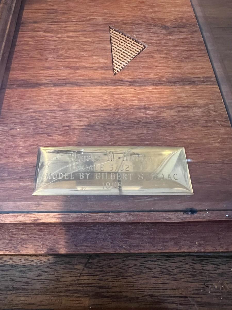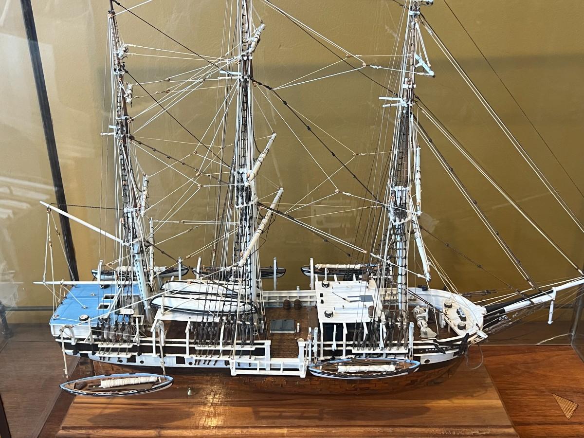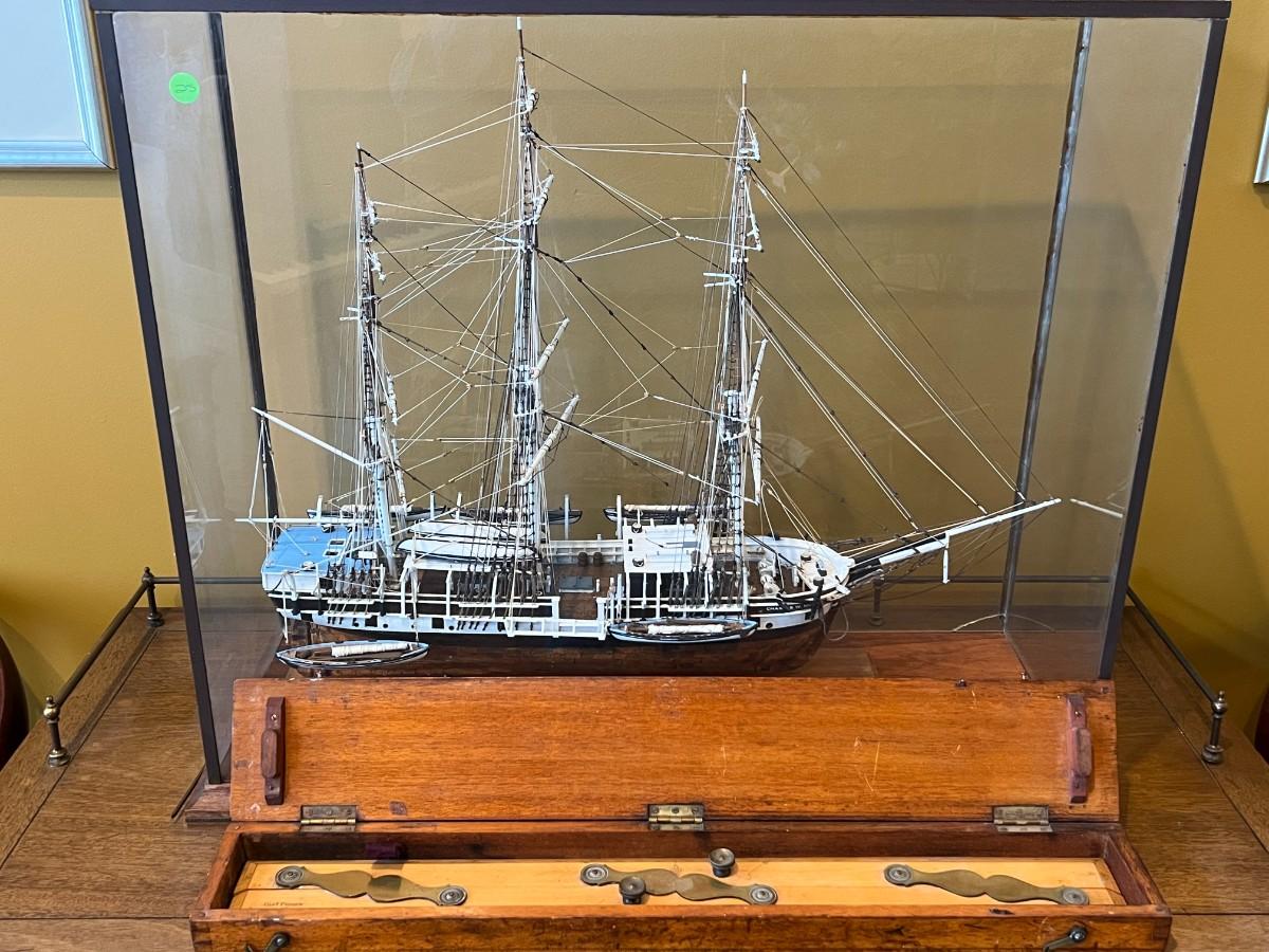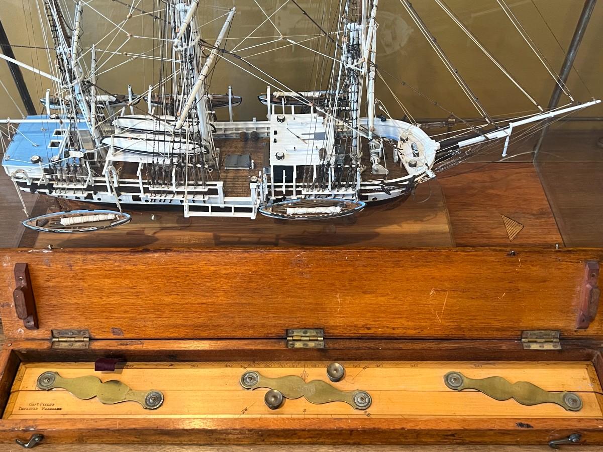 1968 Handmade and Painted Wooden Ship (scale 5/32) w/ Glass Display Case and Antique Nautical Instrument