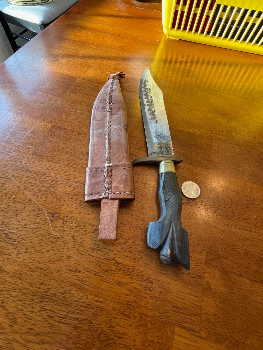 1968 Handmade knife from the Philippines with leather sheath / carved wood handle