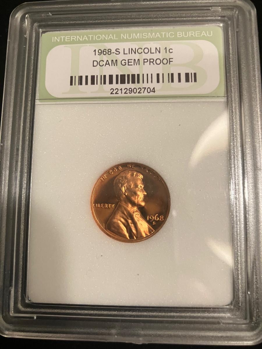 1968-S Lincoln Memorial Cent certified as DCAM GEM PROOF by International Numismatic Bureau (INB), certification #2212902704. This proof coin boasts outstanding deep cameo (DCAM) contrast with heavily frosted devices and mirror-like fields, showcasing exceptional eye appeal on original copper surfaces.