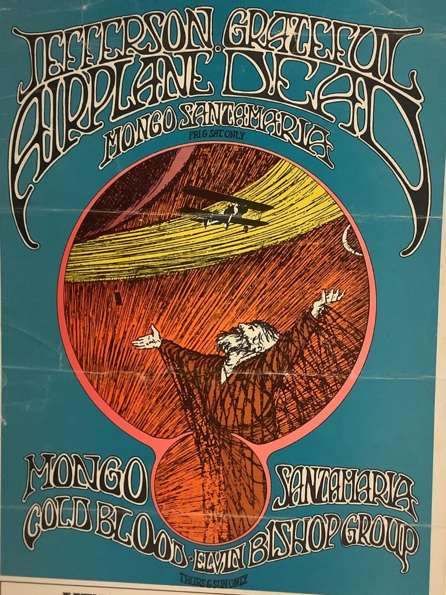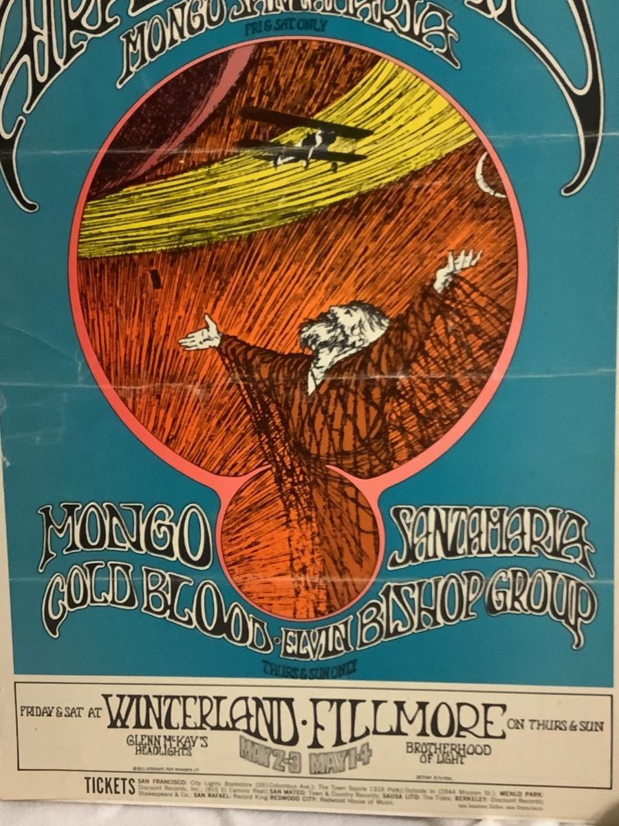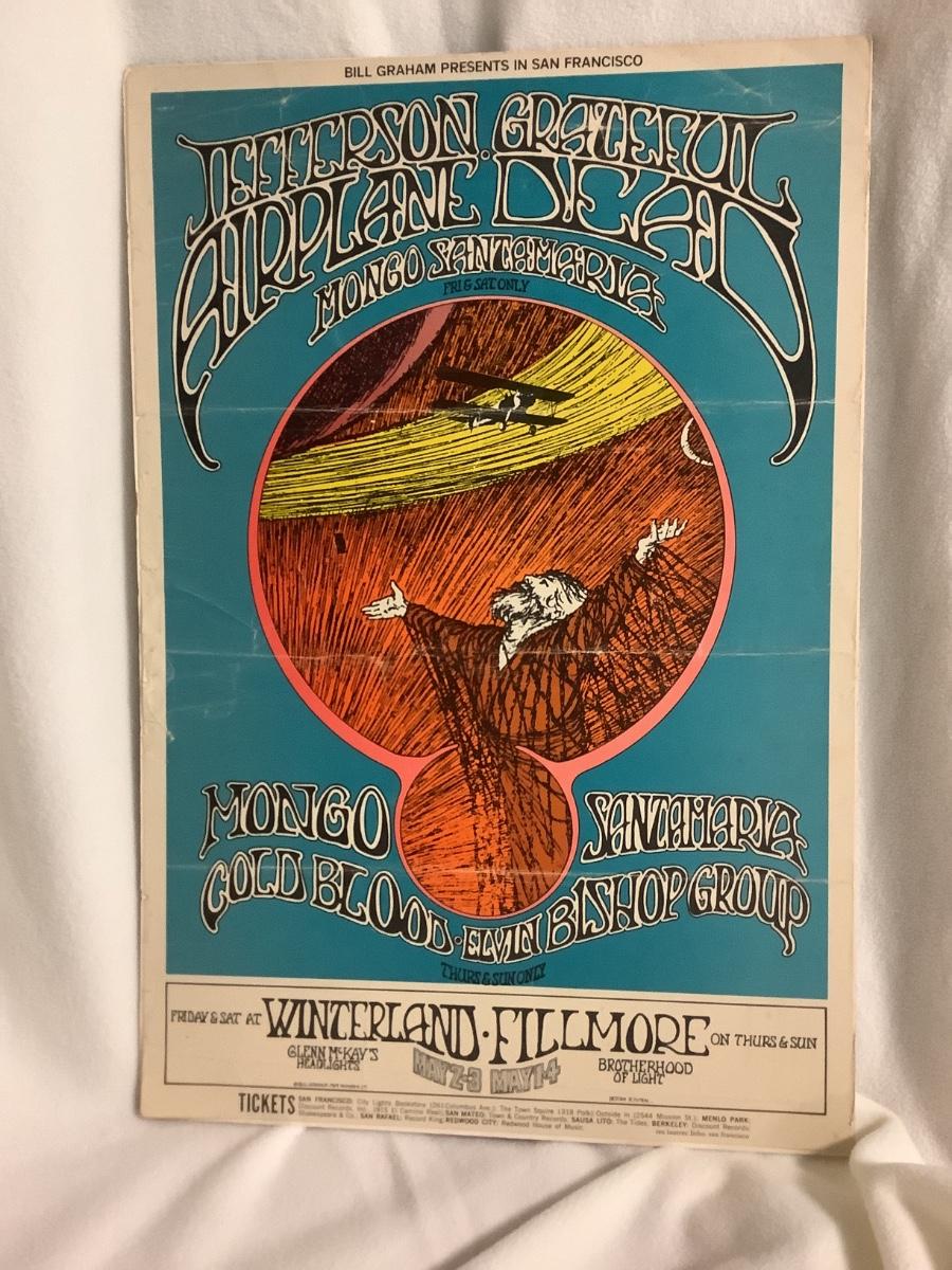 1969 Jefferson Airplane, Grateful Dead, Mongo Santa Maria, Cold Blood, Elvin Bishop Group poster mounted to cardboard 21"H 14"W