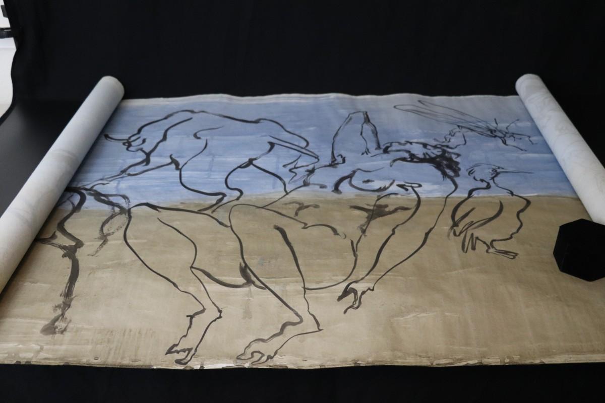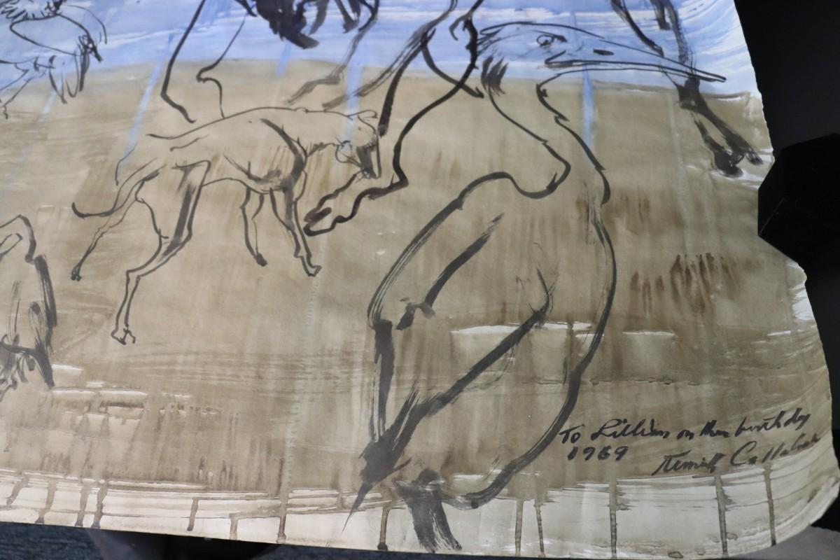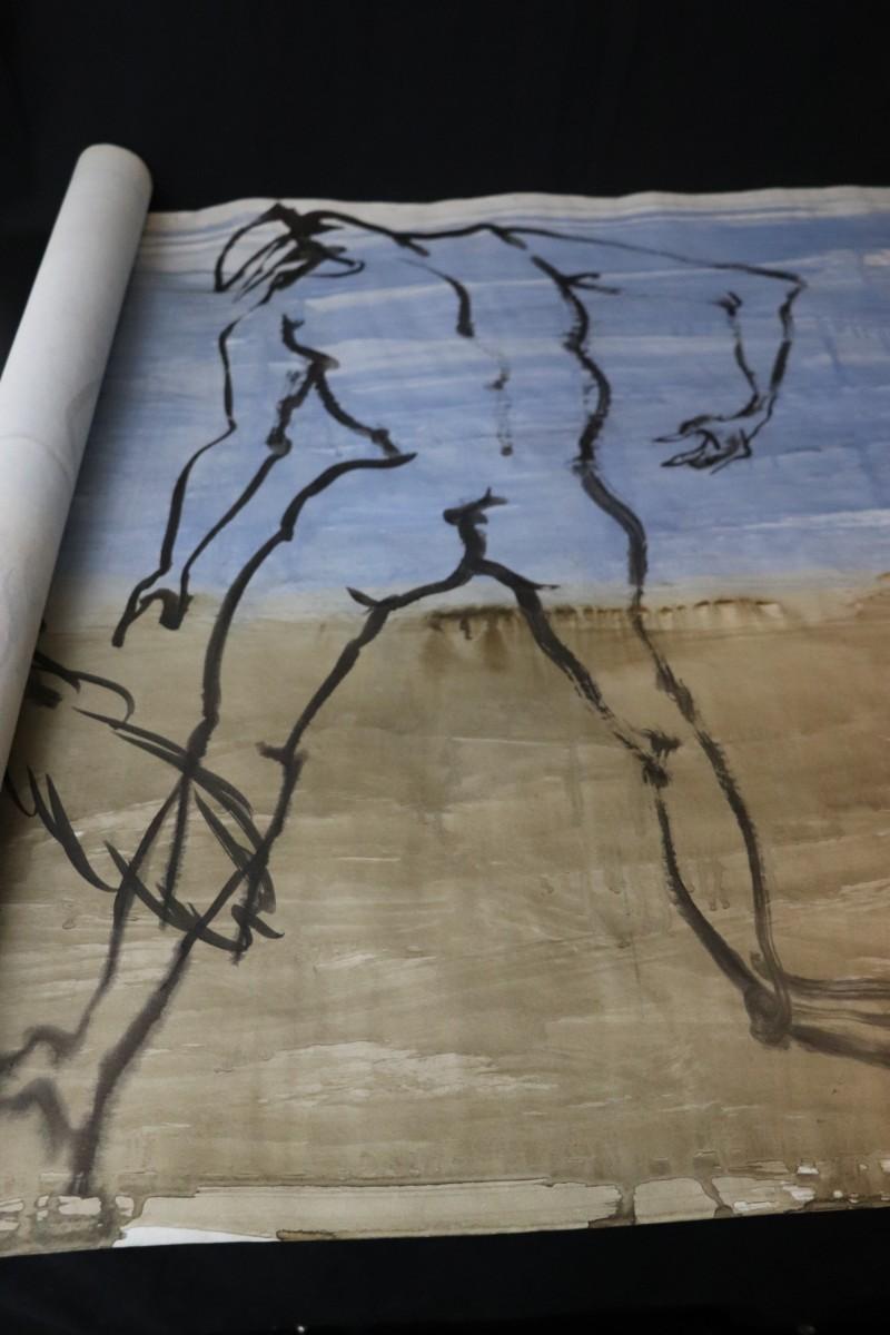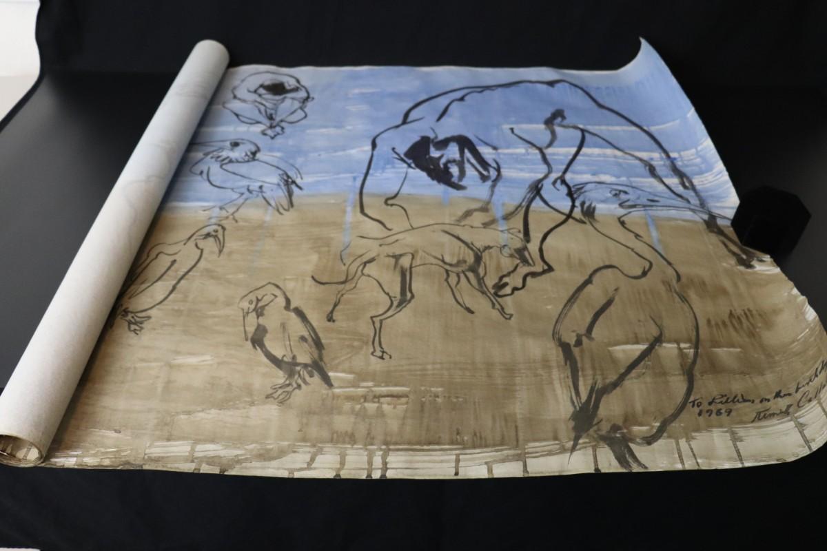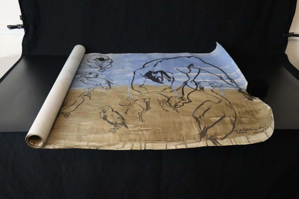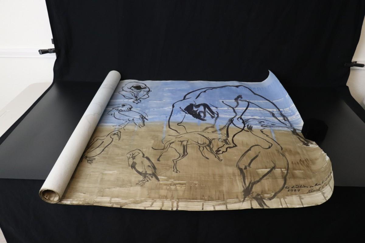 Incredible piece of art by Kenneth Callahan (American, 1905 - 1986). From the private collection of a dear friend of the artist's, this outstanding example of his sumi ink and wash artwork is approximately 157.5 inches long (13.13 ft) in totality! The scale of this piece is truly remarkable and unique- no other pieces at this size exist by Callahan! The images show the figures in sequence as the paper was unrolled. It was stored in good conditions with the paper rolled as shown. This huge piece of art includes figures of nude men in different poses, a nude woman, cats, a dog, birds, insects, a bull, and a horse. Signed and dated to 1969. Condition is good, with some small holes (shown in images).