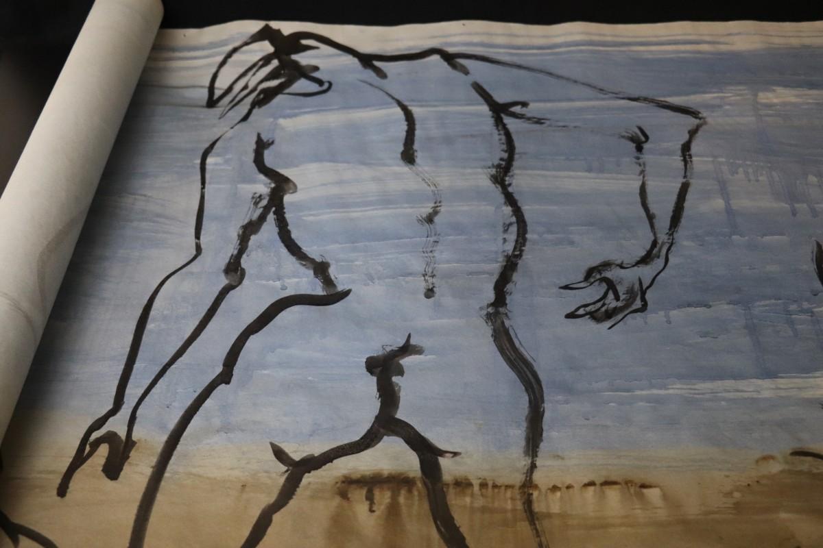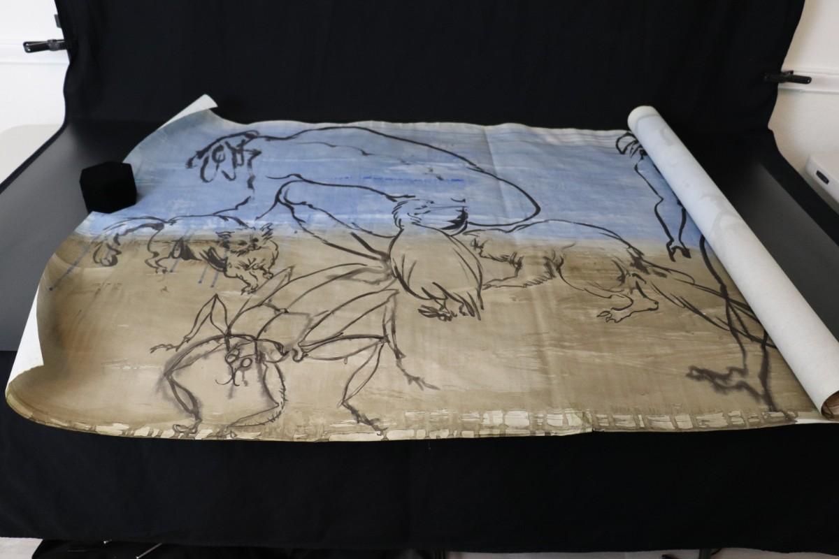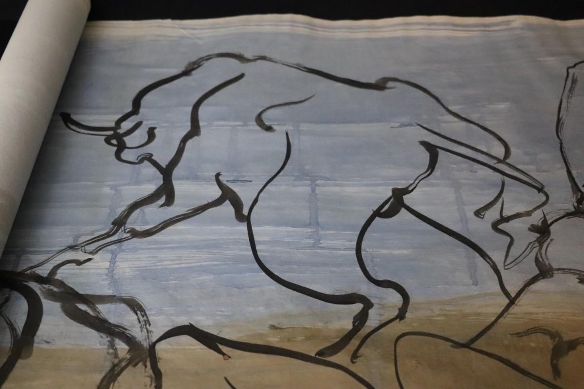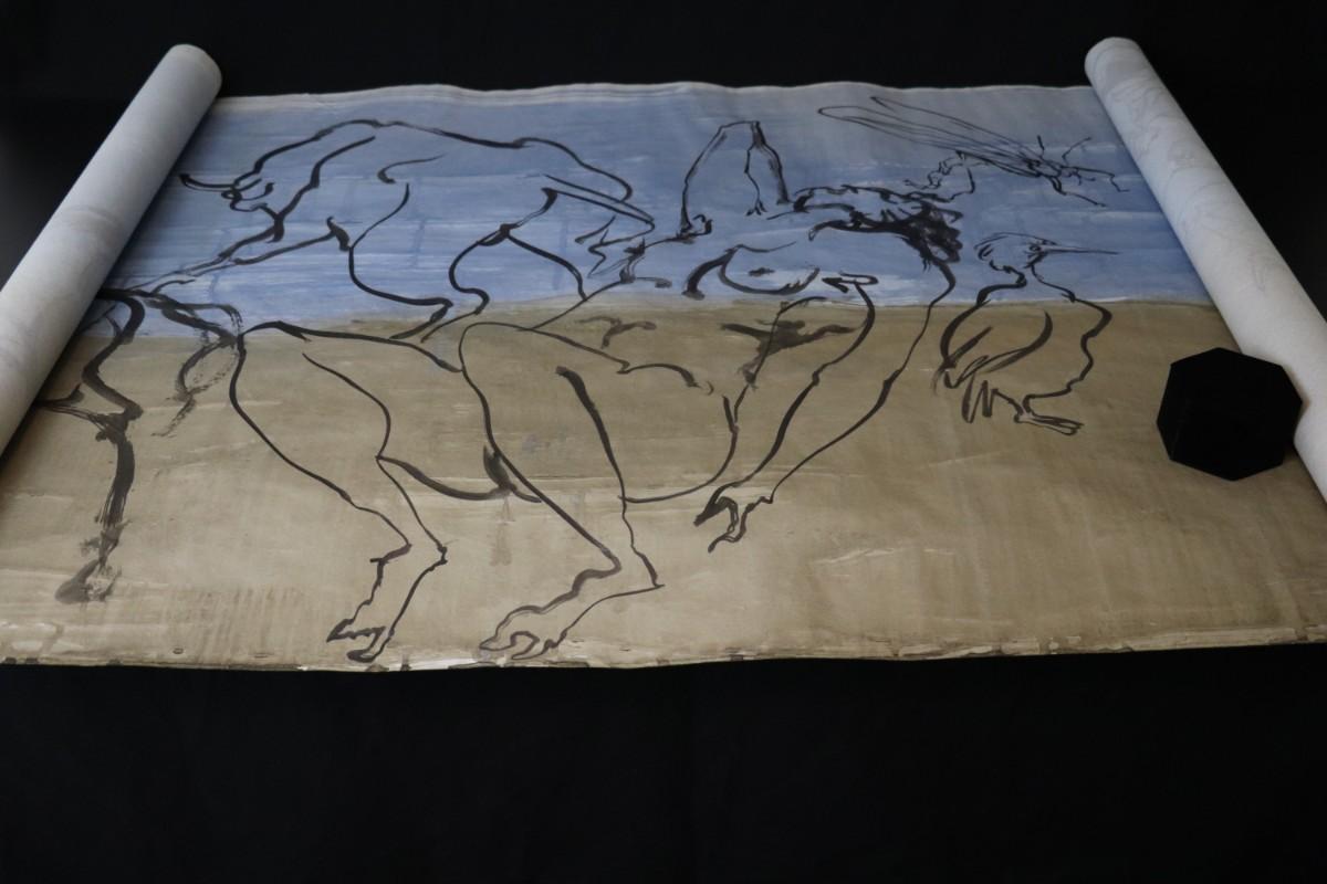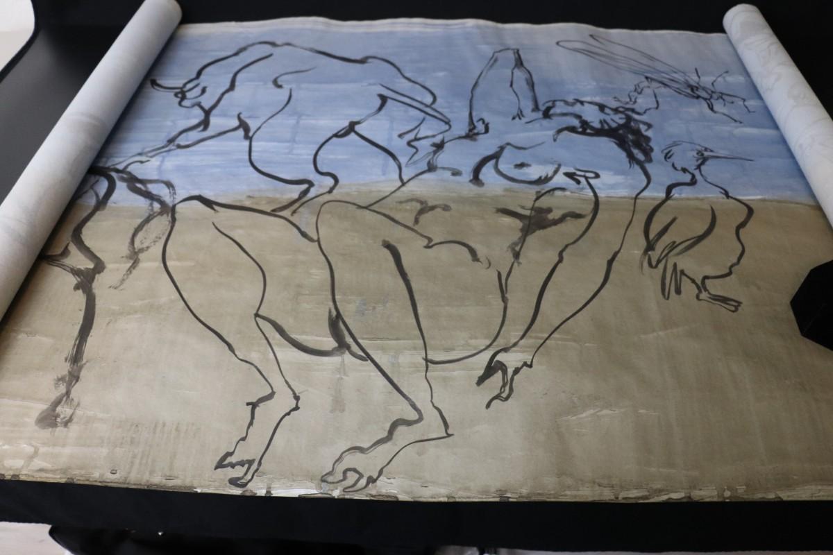 Incredible piece of art by Kenneth Callahan (American, 1905 - 1986). From the private collection of a dear friend of the artist's, this outstanding example of his sumi ink and wash artwork is approximately 157.5 inches long (13.13 ft) in totality! The scale of this piece is truly remarkable and unique- no other pieces at this size exist by Callahan! The images show the figures in sequence as the paper was unrolled. It was stored in good conditions with the paper rolled as shown. This huge piece of art includes figures of nude men in different poses, a nude woman, cats, a dog, birds, insects, a bull, and a horse. Signed and dated to 1969. Condition is good, with some small holes (shown in images).