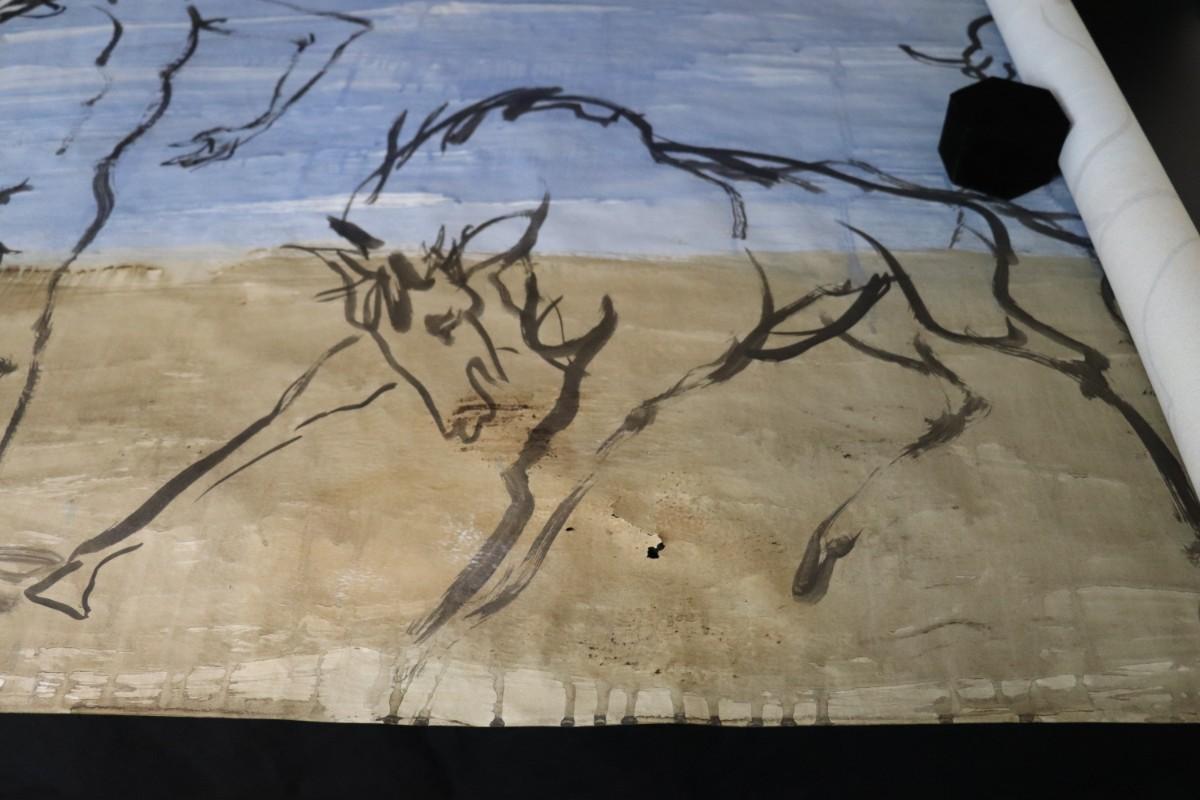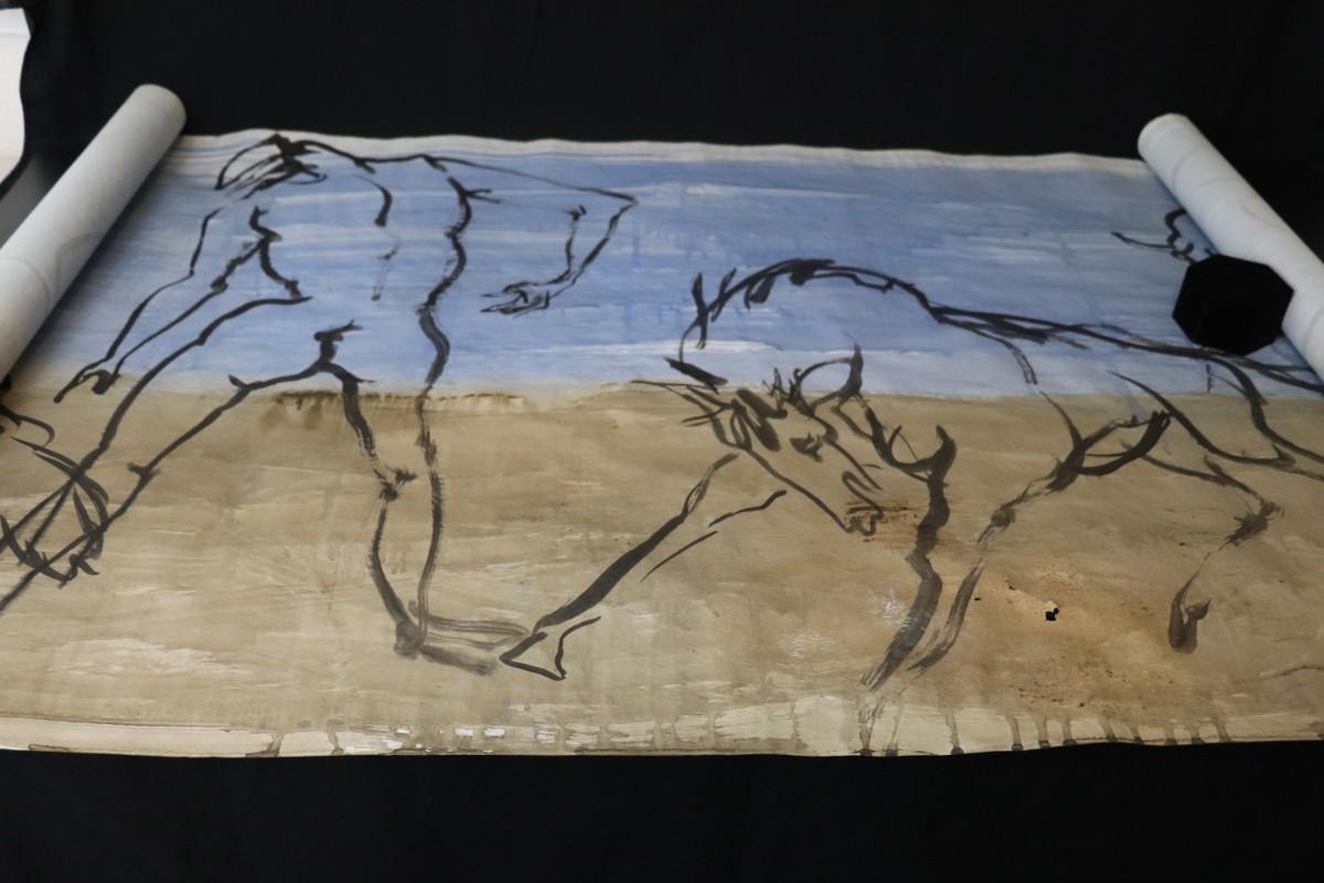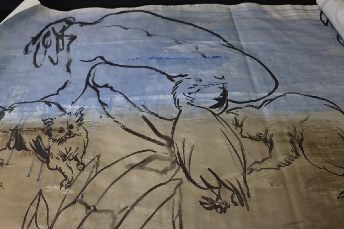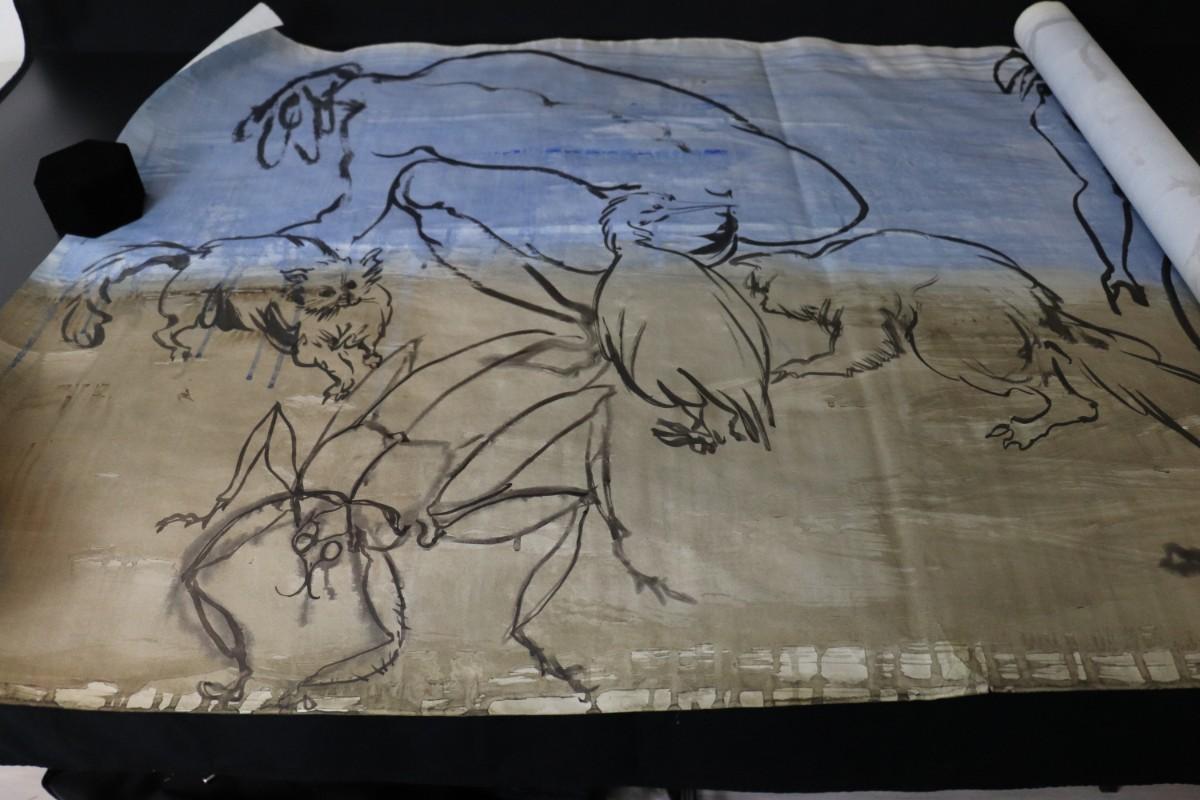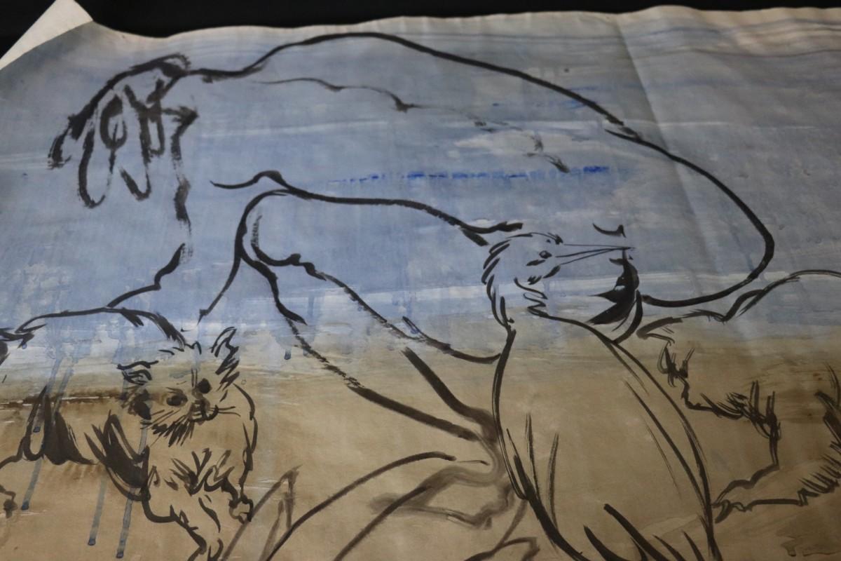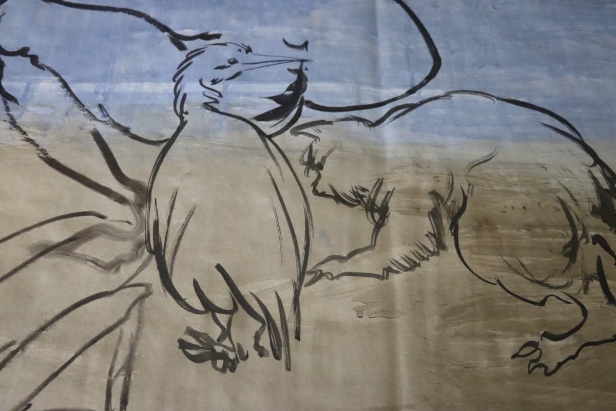 Incredible piece of art by Kenneth Callahan (American, 1905 - 1986). From the private collection of a dear friend of the artist's, this outstanding example of his sumi ink and wash artwork is approximately 157.5 inches long (13.13 ft) in totality! The scale of this piece is truly remarkable and unique- no other pieces at this size exist by Callahan! The images show the figures in sequence as the paper was unrolled. It was stored in good conditions with the paper rolled as shown. This huge piece of art includes figures of nude men in different poses, a nude woman, cats, a dog, birds, insects, a bull, and a horse. Signed and dated to 1969. Condition is good, with some small holes (shown in images).