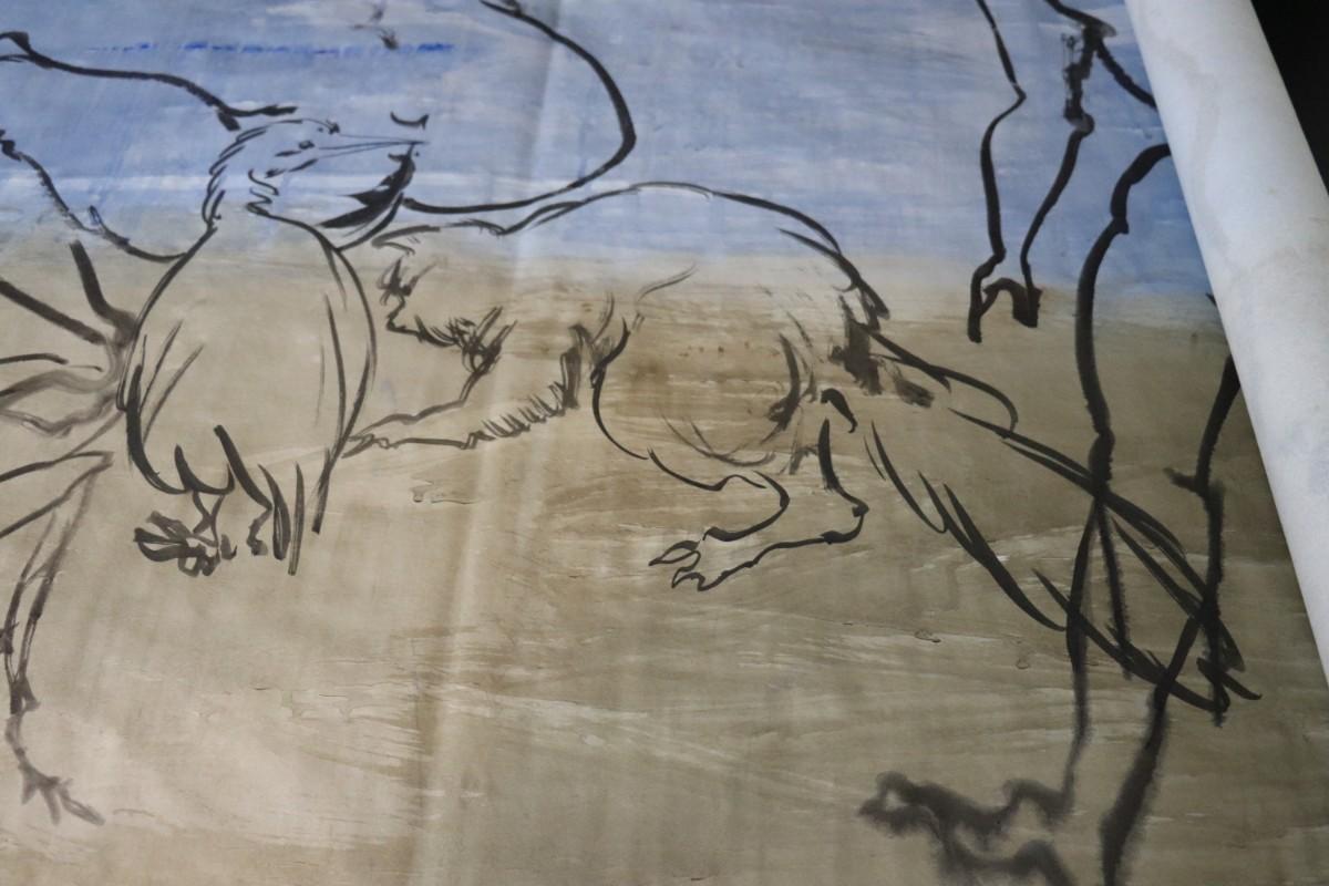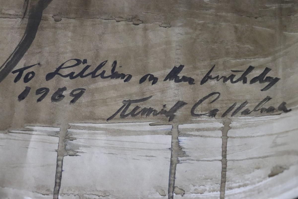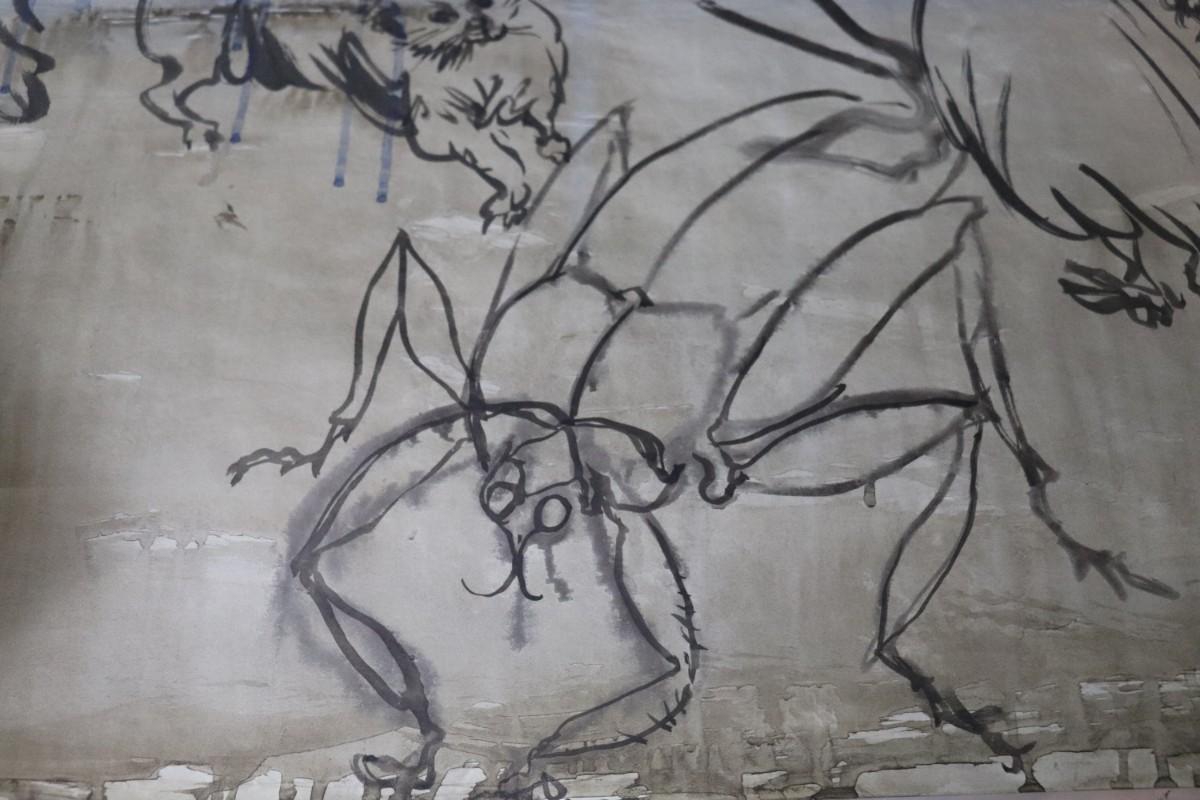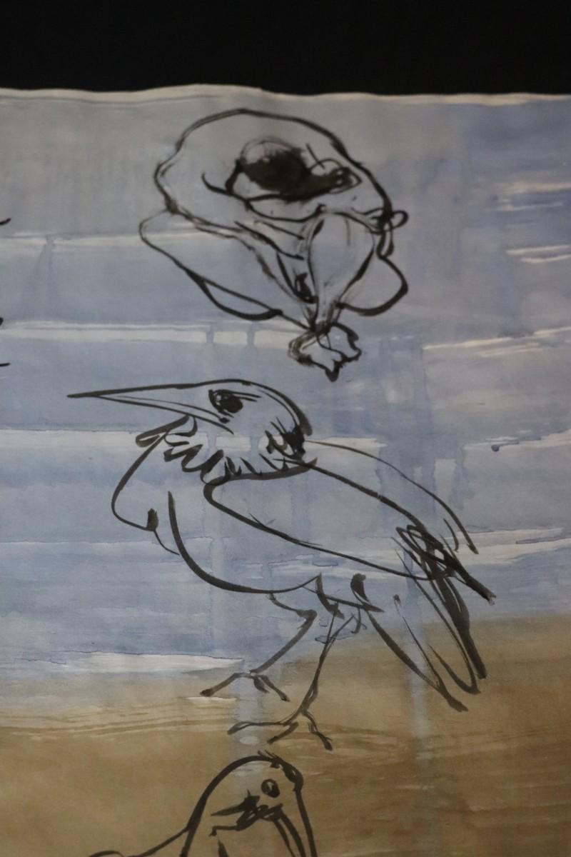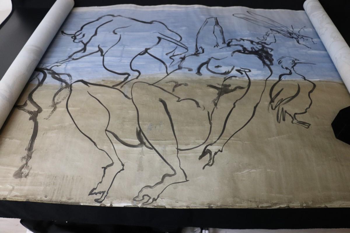 Incredible piece of art by Kenneth Callahan (American, 1905 - 1986). From the private collection of a dear friend of the artist's, this outstanding example of his sumi ink and wash artwork is approximately 157.5 inches long (13.13 ft) in totality! The scale of this piece is truly remarkable and unique- no other pieces at this size exist by Callahan! The images show the figures in sequence as the paper was unrolled. It was stored in good conditions with the paper rolled as shown. This huge piece of art includes figures of nude men in different poses, a nude woman, cats, a dog, birds, insects, a bull, and a horse. Signed and dated to 1969. Condition is good, with some small holes (shown in images).