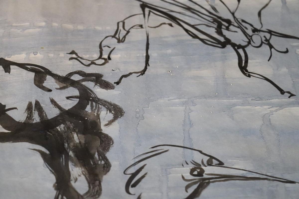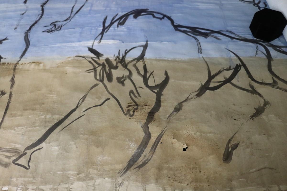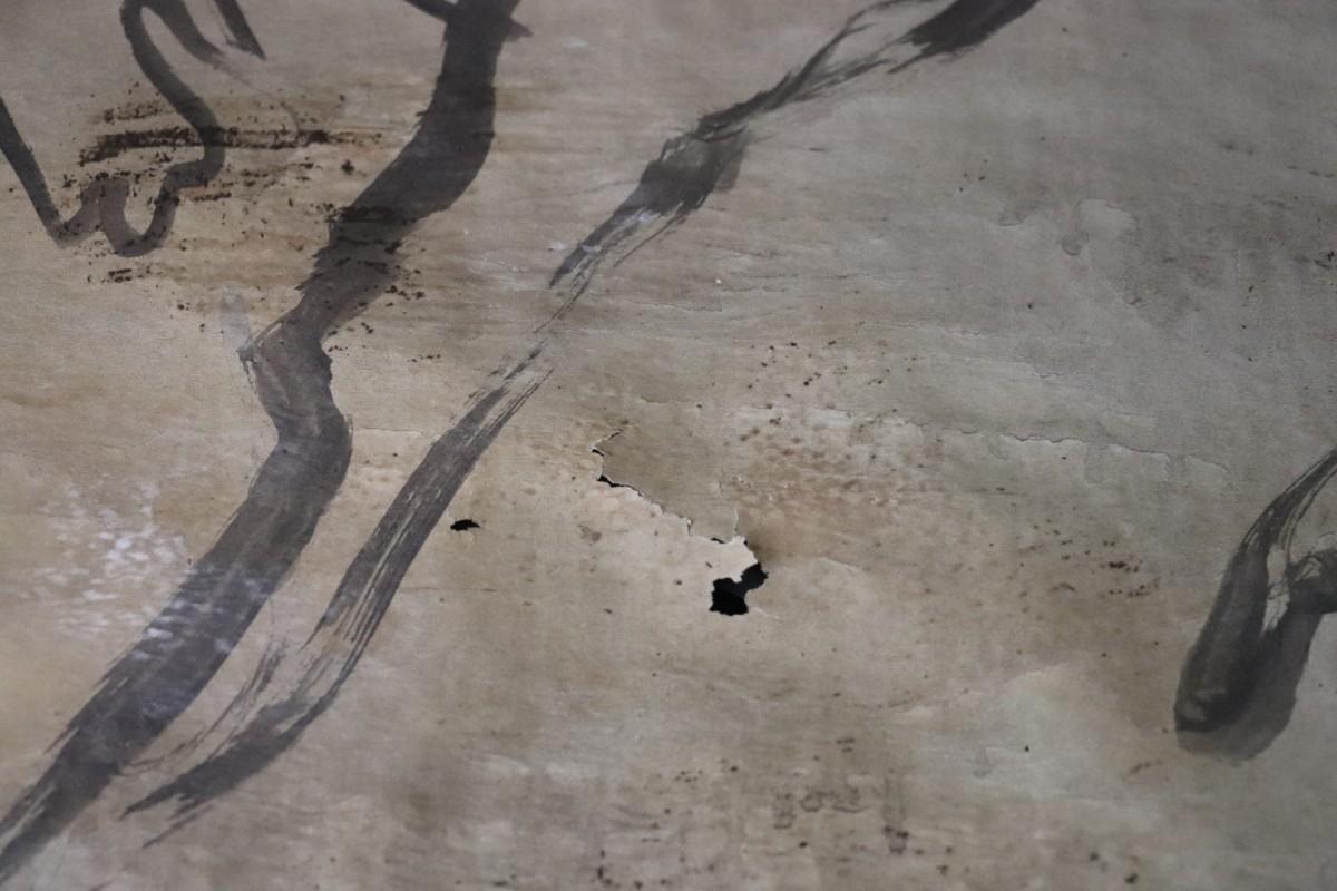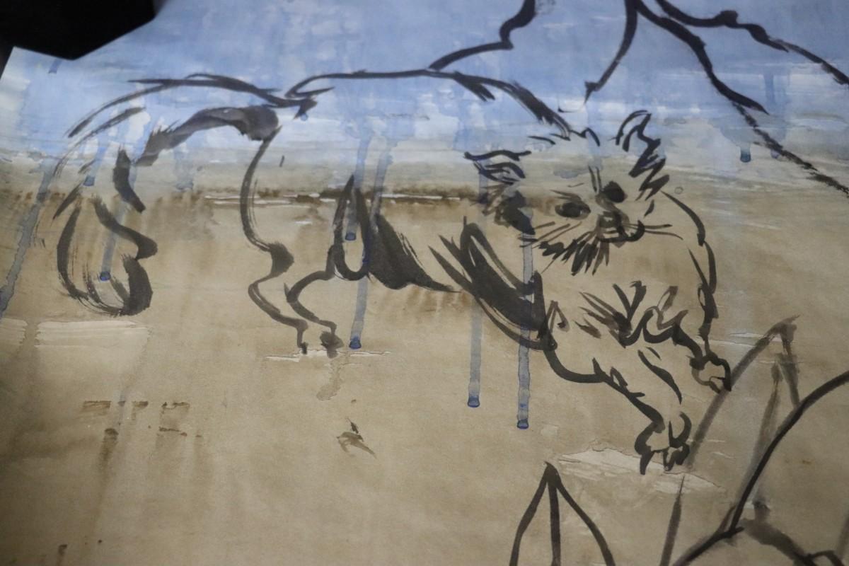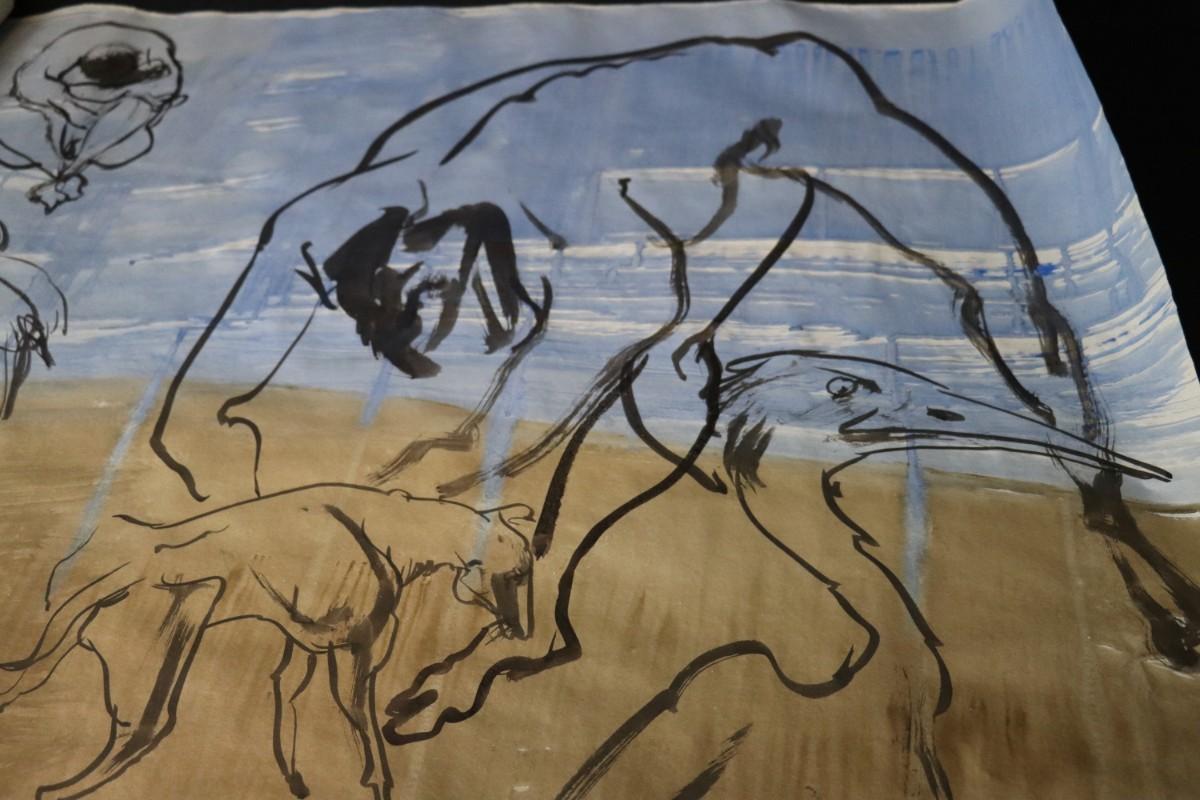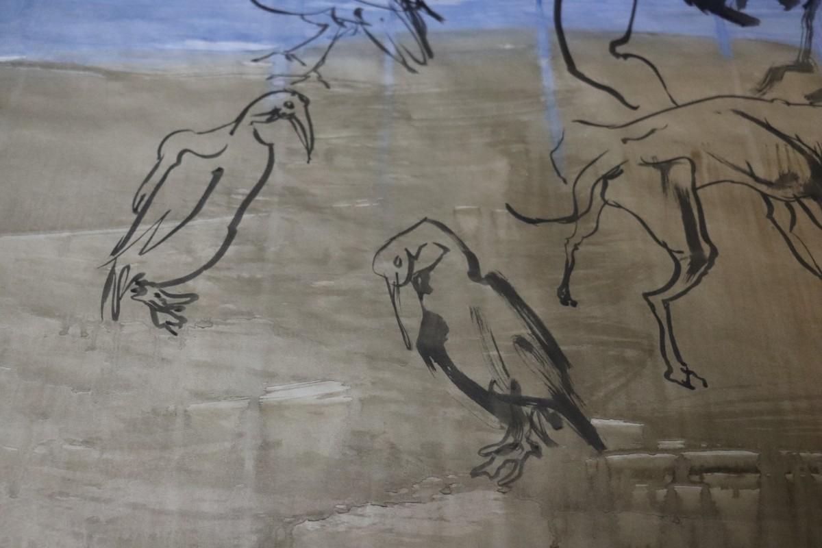 Incredible piece of art by Kenneth Callahan (American, 1905 - 1986). From the private collection of a dear friend of the artist's, this outstanding example of his sumi ink and wash artwork is approximately 157.5 inches long (13.13 ft) in totality! The scale of this piece is truly remarkable and unique- no other pieces at this size exist by Callahan! The images show the figures in sequence as the paper was unrolled. It was stored in good conditions with the paper rolled as shown. This huge piece of art includes figures of nude men in different poses, a nude woman, cats, a dog, birds, insects, a bull, and a horse. Signed and dated to 1969. Condition is good, with some small holes (shown in images).