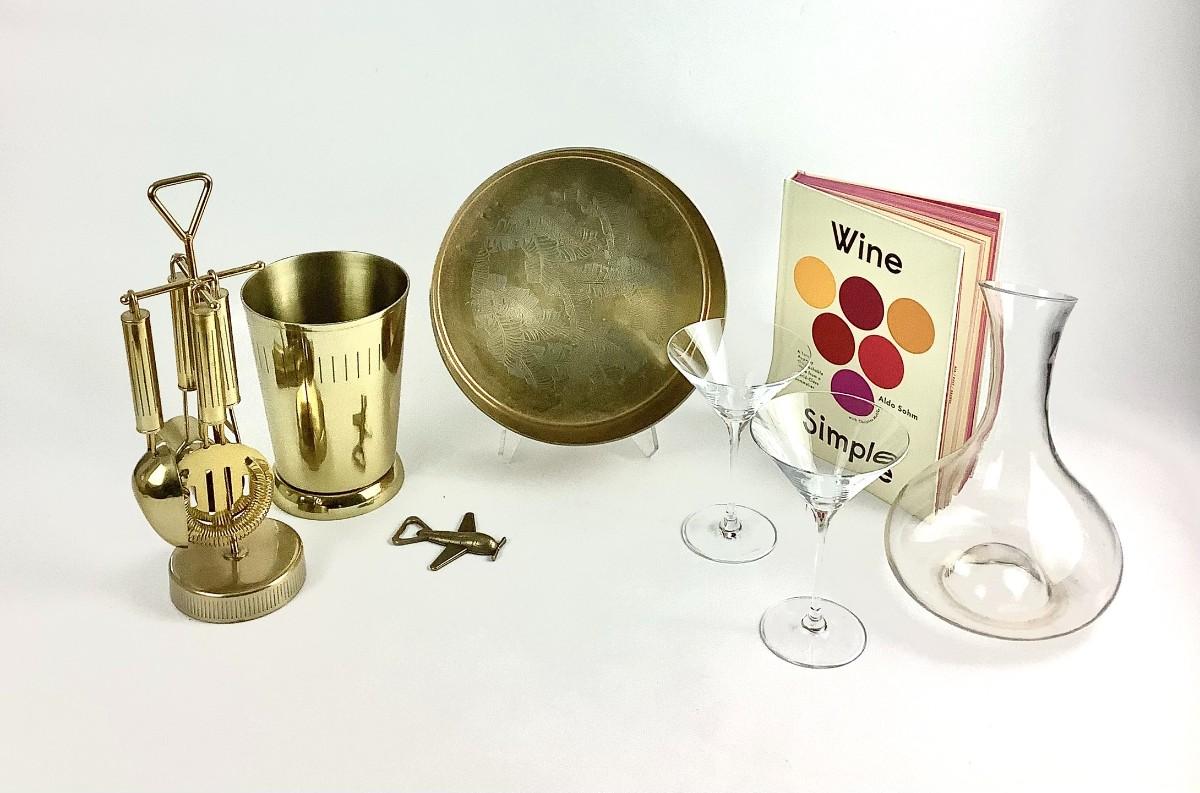197. " Barware and Wine Lovers Set - Brass Tools, VILLEROY & BOCH Martini Glasses & More "