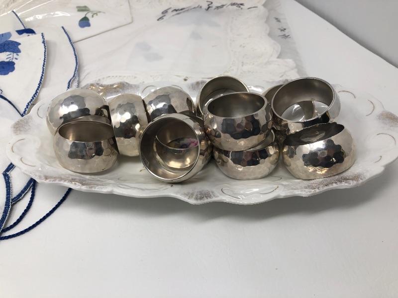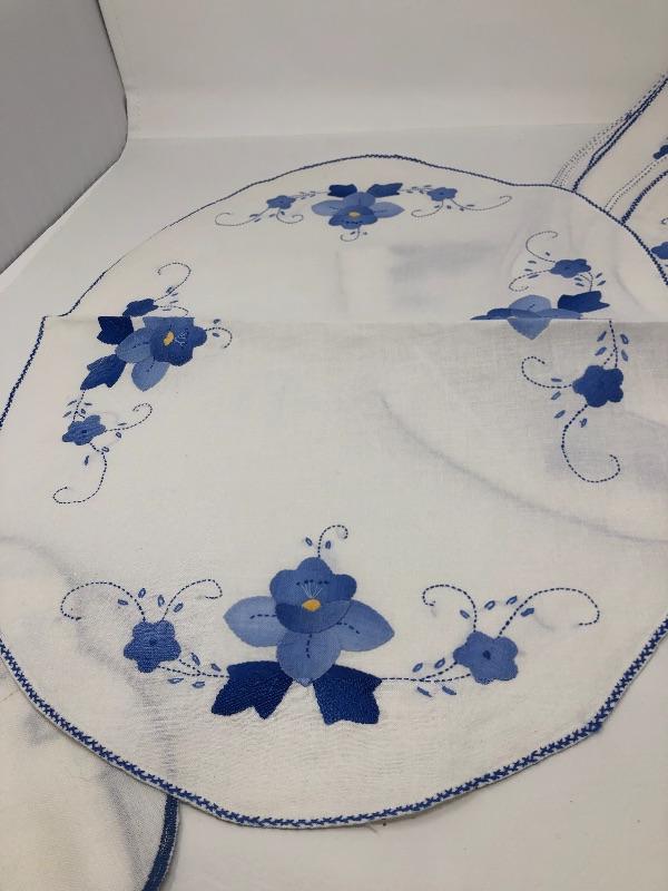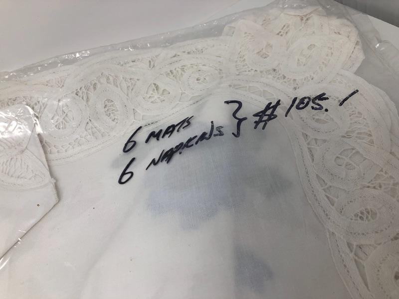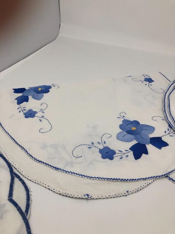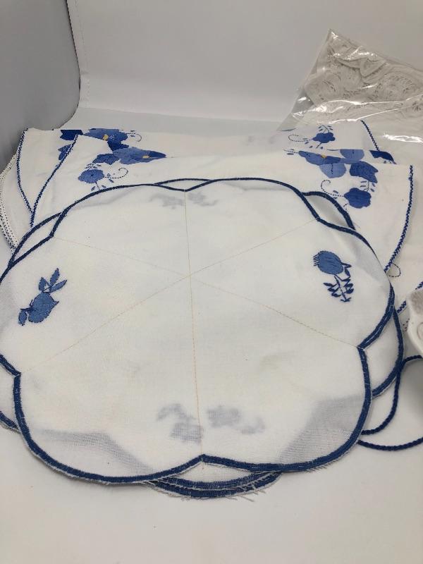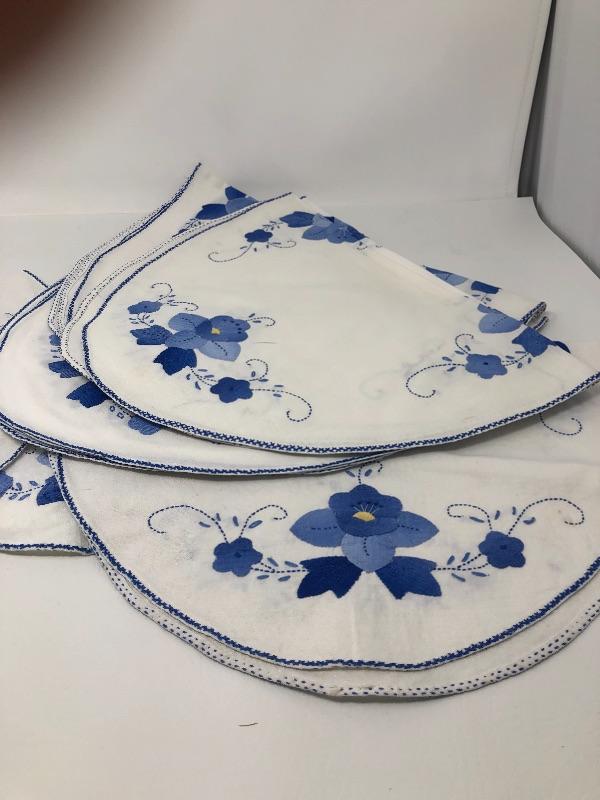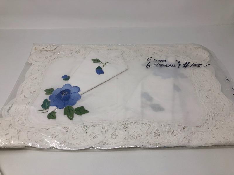 Embroidered Placemats, napkins with Napkin rings. All linens are unused.