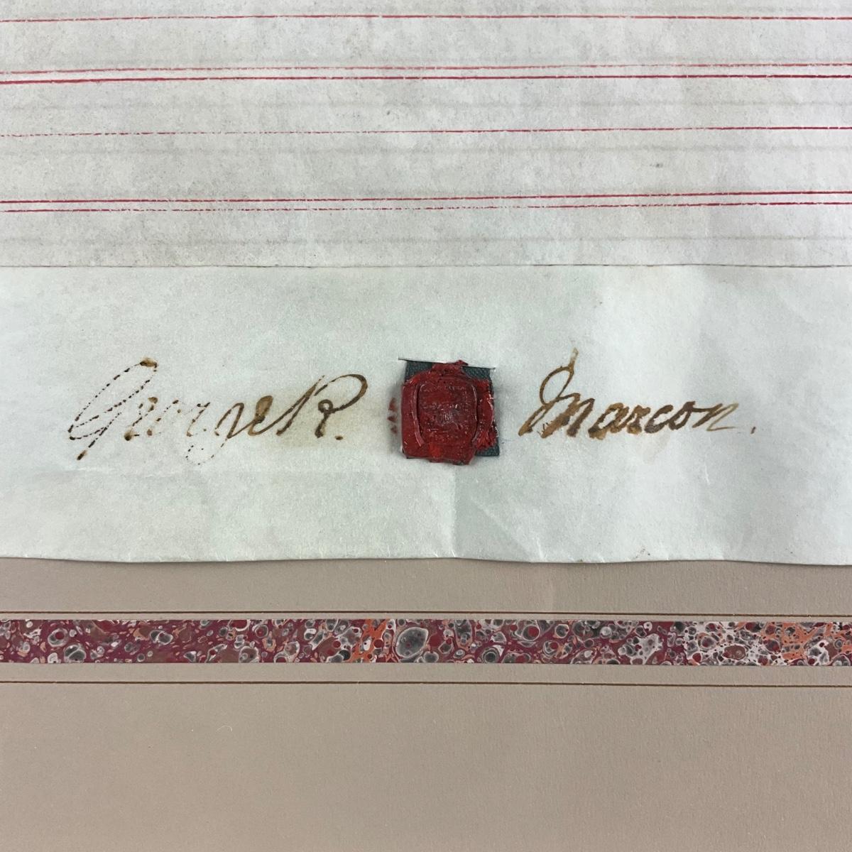 Has silver stamp and wax seal on parchment.