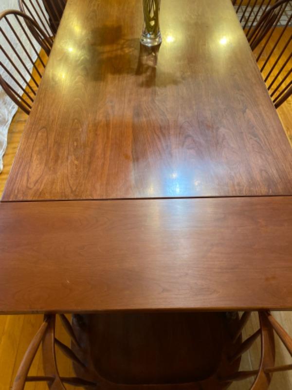 Table measures 67” long x 35” wide each leaf is added to the end of the table and measure 12”. There are 4 regular Windsor style chairs and 2 Windsor style arm chairs