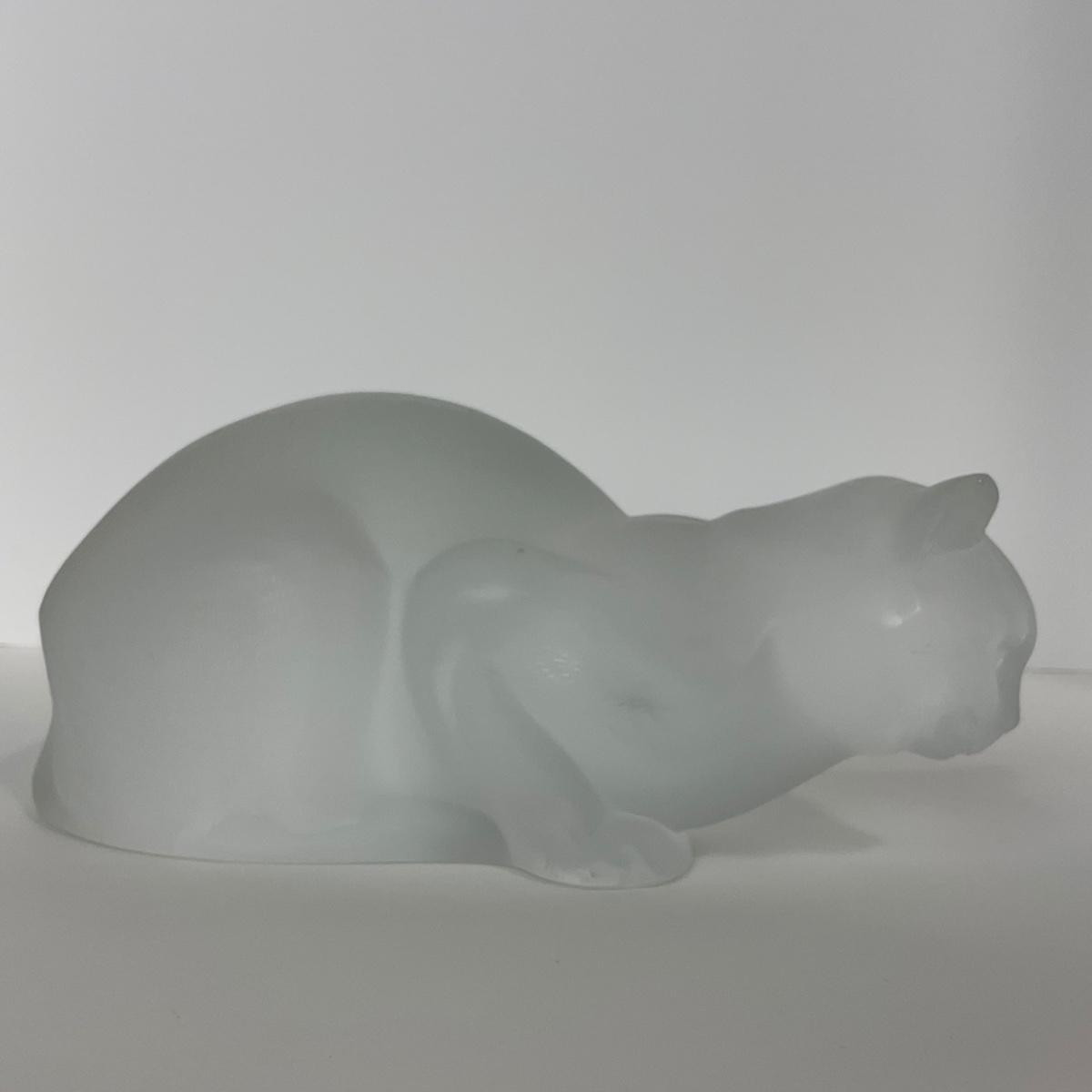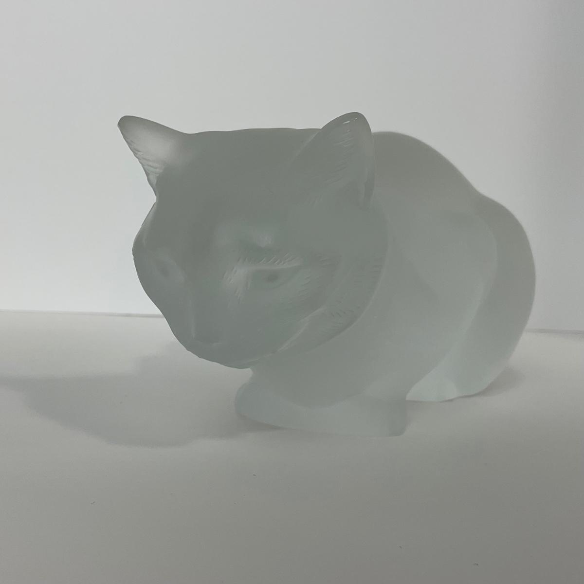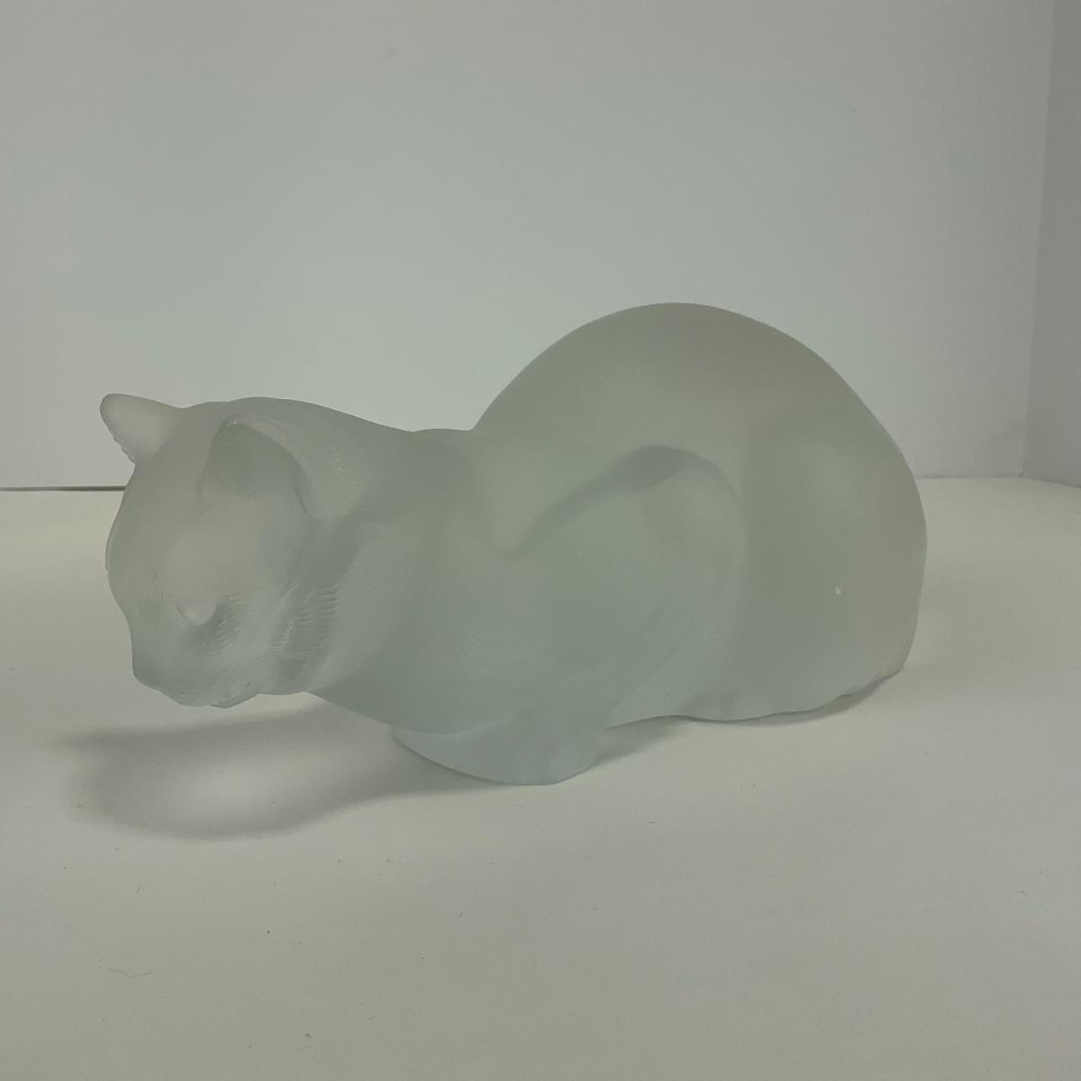 One vintage Lalique France Frosted heavy crouching cat. Piece is signed at the bottom, this piece does have a small flea bite chip on the side of the cats body as well as a small chip on the ear and a scuff. Please see photos for details and condition. Any condition statement is given as a courtesy to a client, is an opinion, and should not be treated as a statement of fact. Reference to condition written, oral or within a condition report shall not be regarded as a full account of condition and may not include all defects, alterations, or restorations. Absence of a condition report does not imply a lot is flawless or lacking imperfections or damage. Katherine’s Auction & Appraisal Service shall have no responsibility for any error or omission. Returns shall not be accepted on the basis of condition. ::: Shipping is available on this lot. If you require shipping you must let us know at the close of the auction. We will coordinate with you after the item has been won. Shipping fees will include insurance up to or exceeding the value of all items being mailed. If you have any questions regarding this lot please contact the auctioneer either via this website, by direct email or by phone. PICK UP TIMES and other important information can be found in the TERMS and DESCRIPTION of the auction. Please take a look for pertinent information. Thanks!