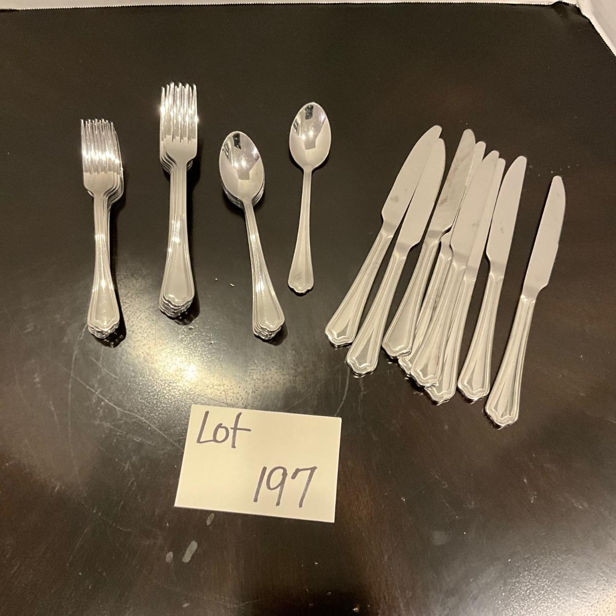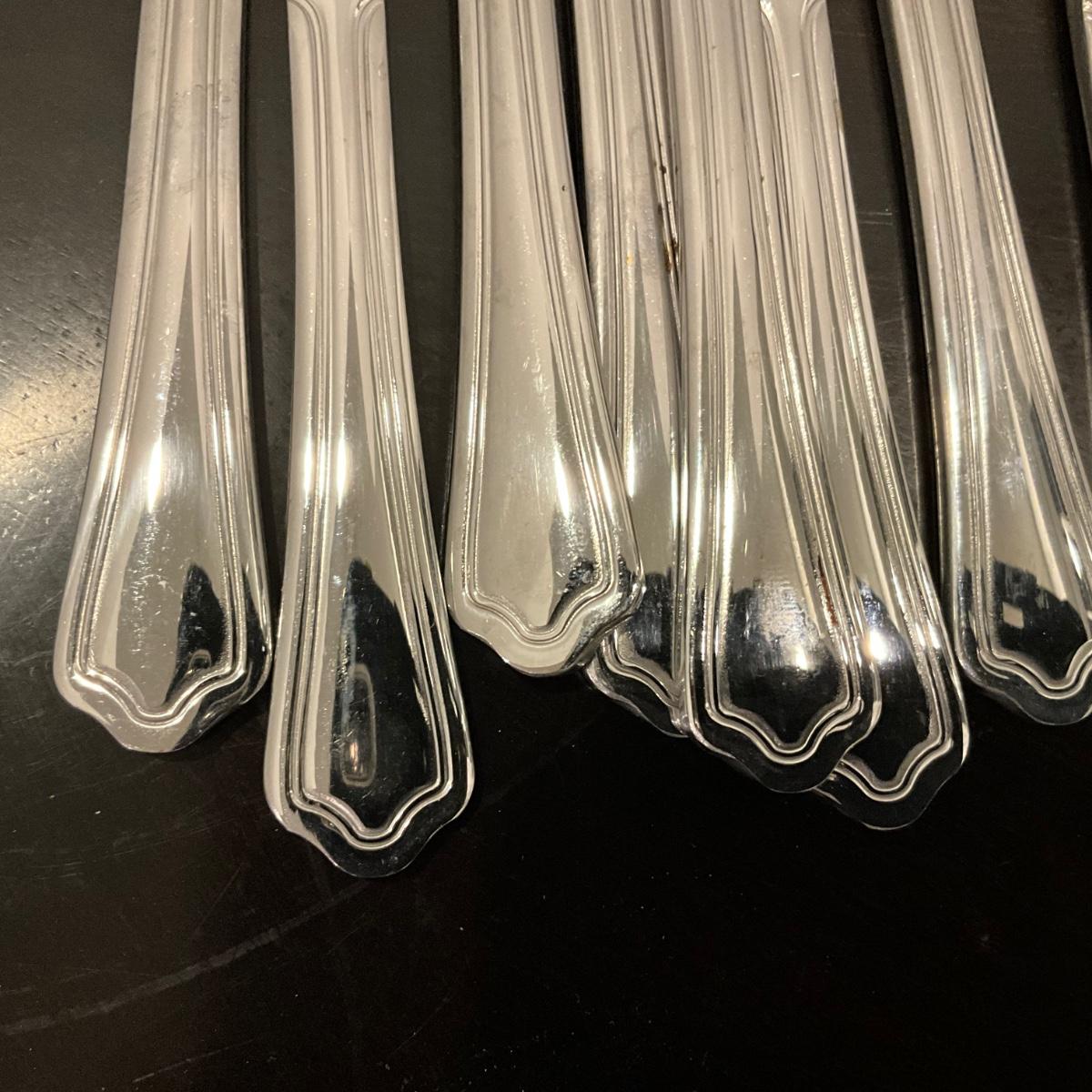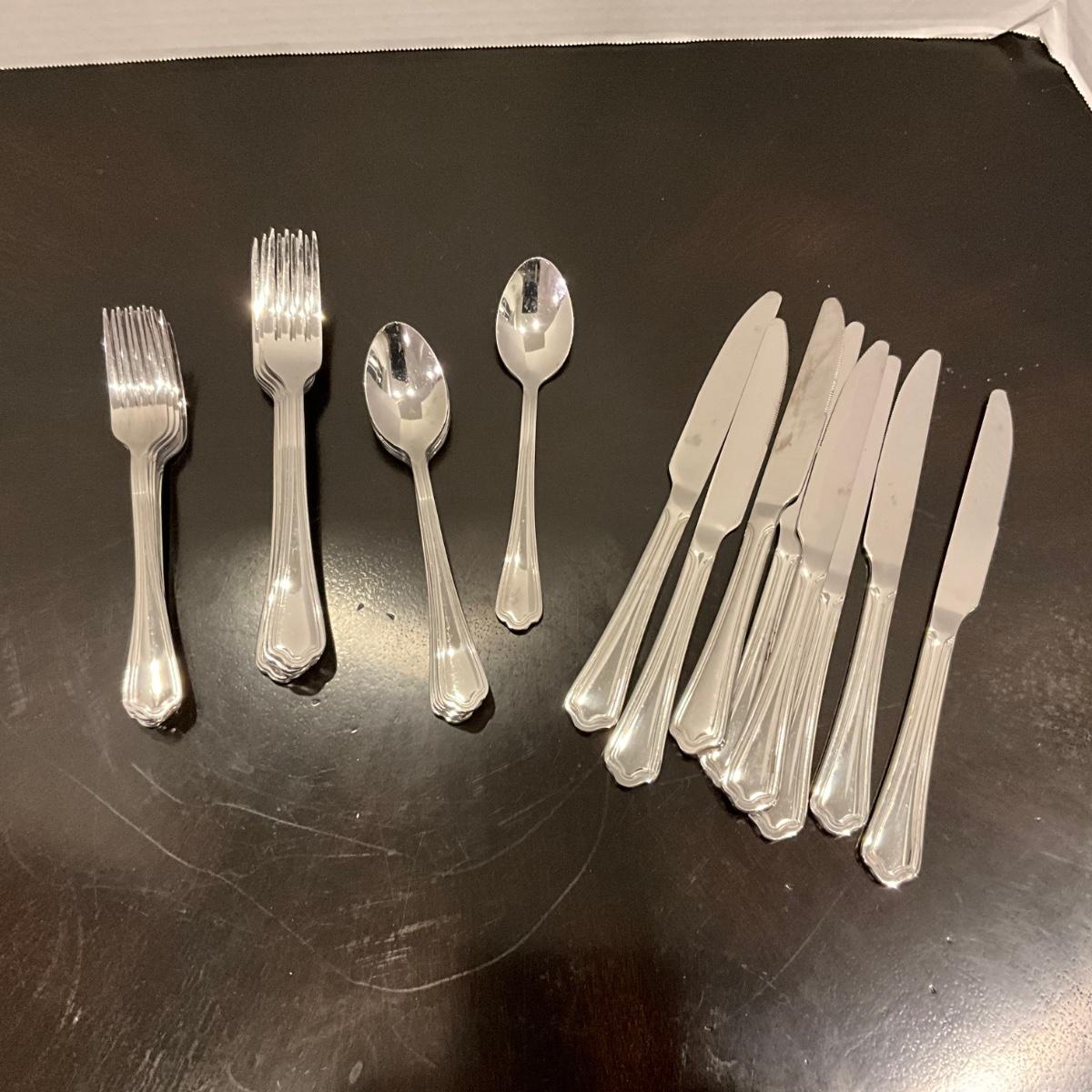 8 knives, 8 dinner forks, 7 forks, 7 teaspoons