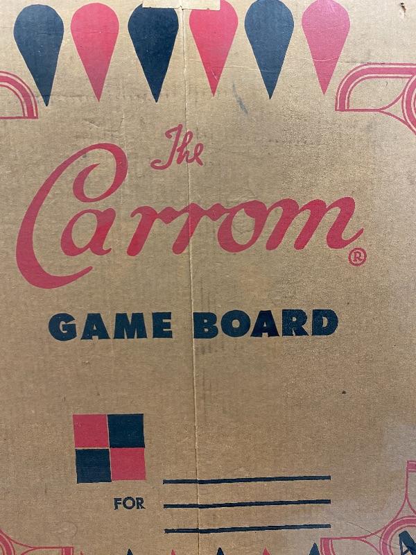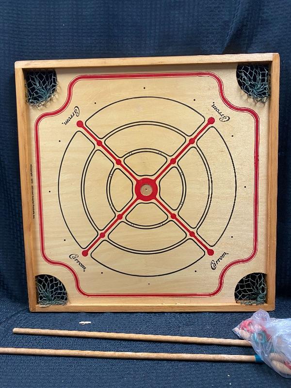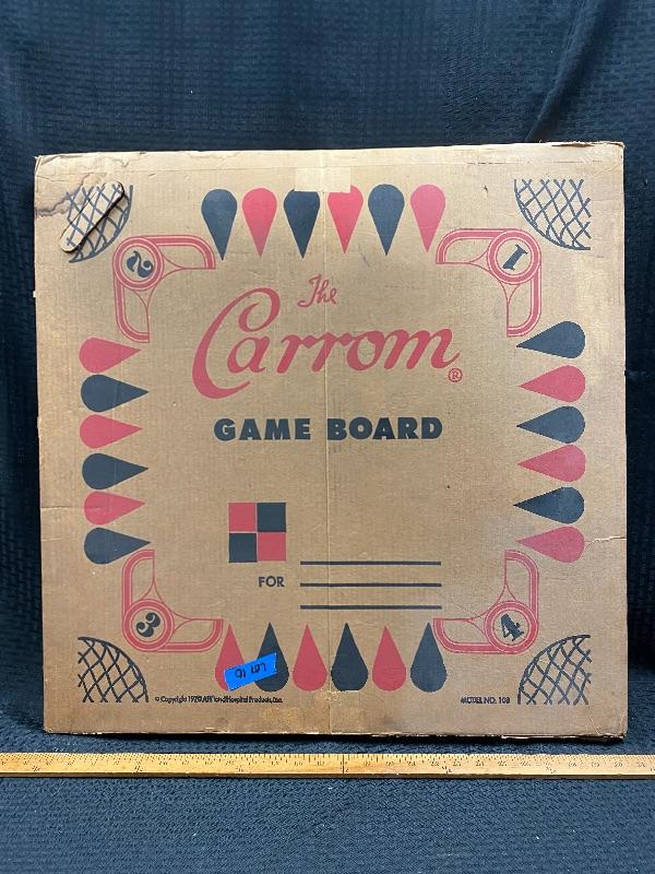 Vintage 1970 Carrom game board set. Comes in original box. Has sticks and game pieces. Double sided. Good Condition.
