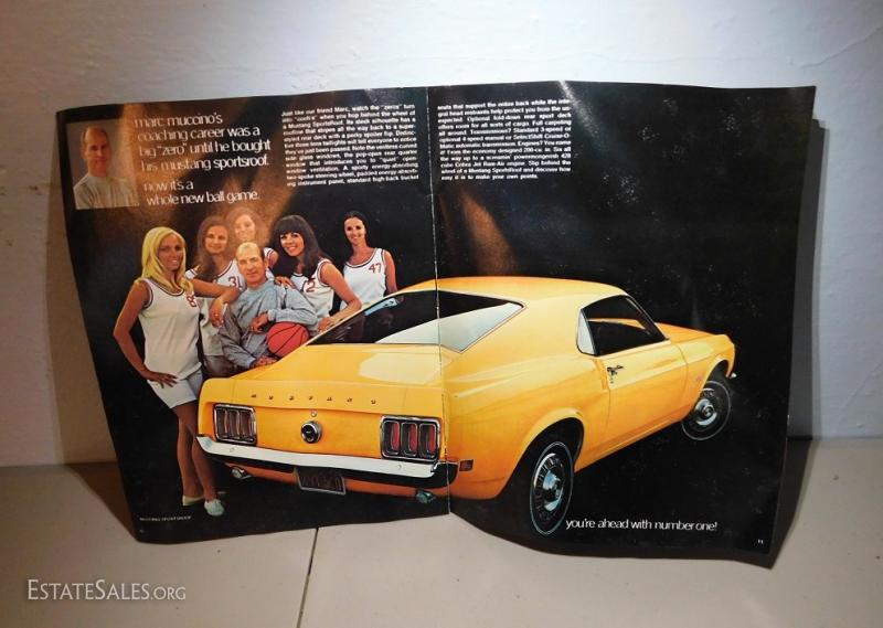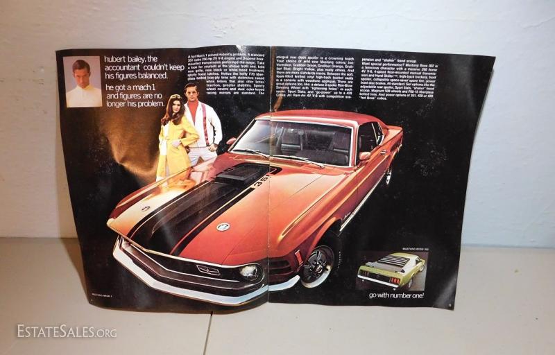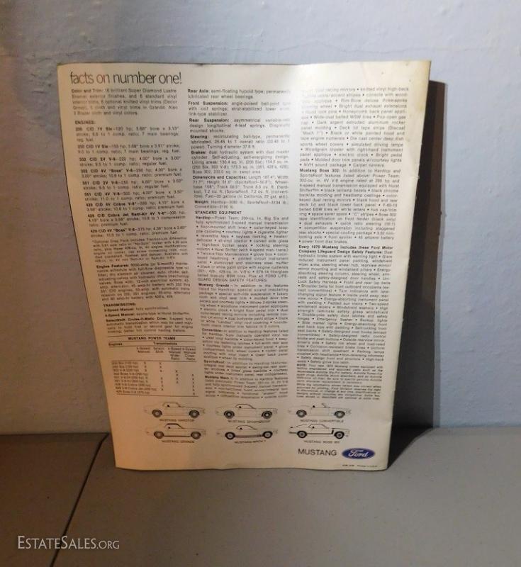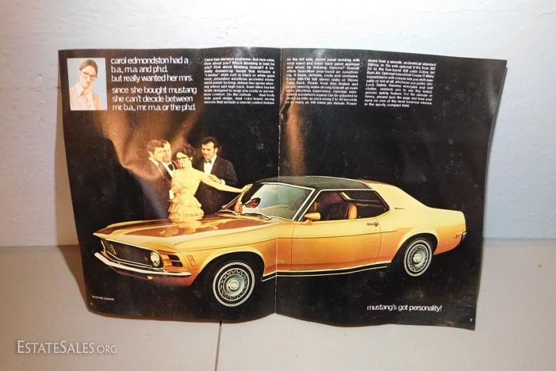 Colorful 1970 Ford Mustang advertising pamphlet with several pages of model choices on the car. Great collector piece. Condition is good with some creasing and turned corners.
