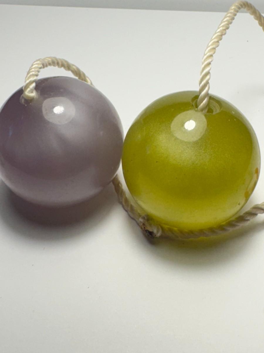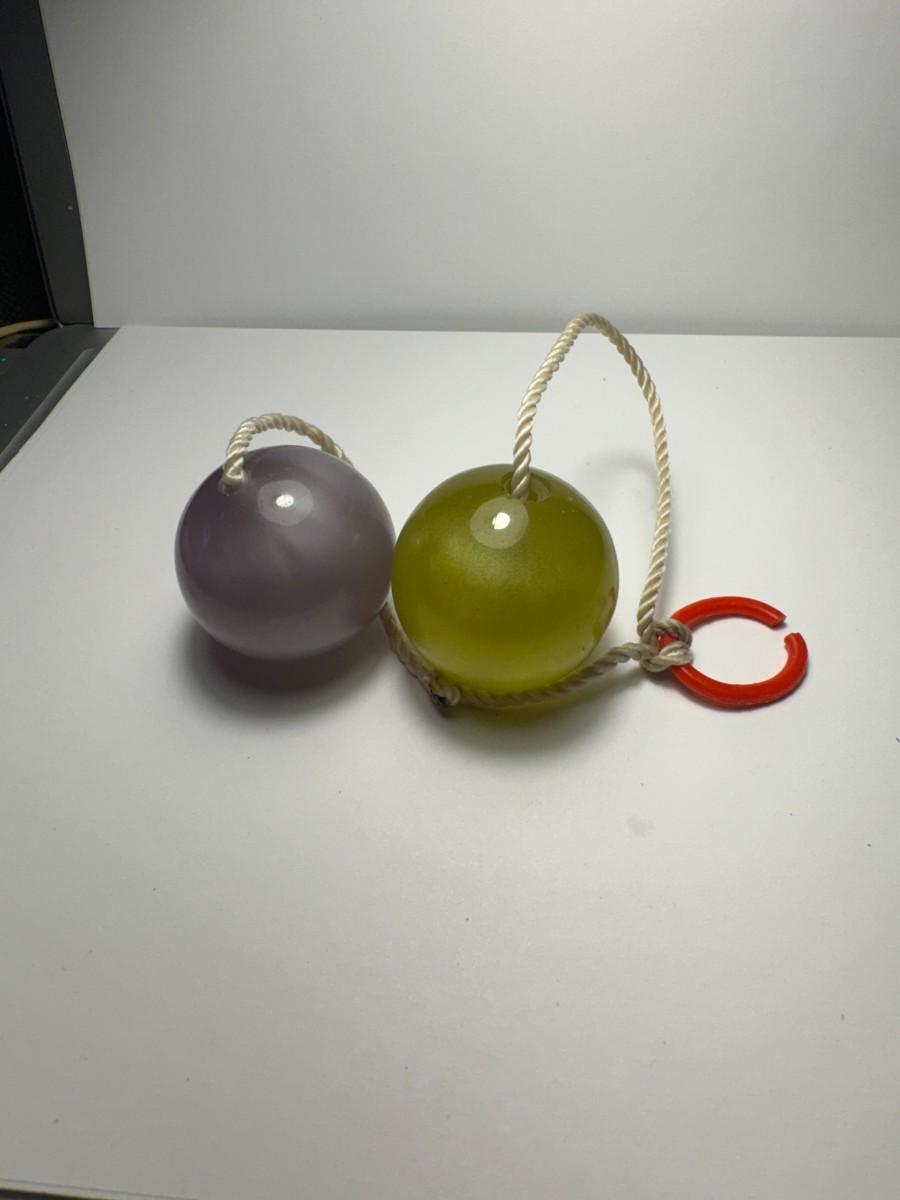 vintage Clackers, also known as Clacker Balls, a popular toy from the late 1960s and early 1970s. They consist of two hard spheres (originally glass, later plastic) on a string attached to a handle or finger tab. The goal is to swing them up and down, making them hit each other and create a "clacking" sound. The specific clackers in the image are green and purple
