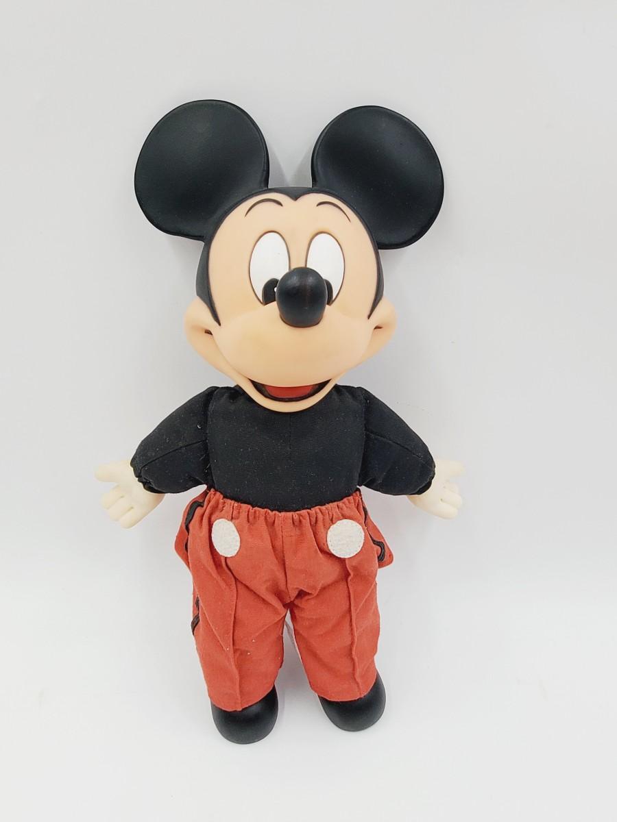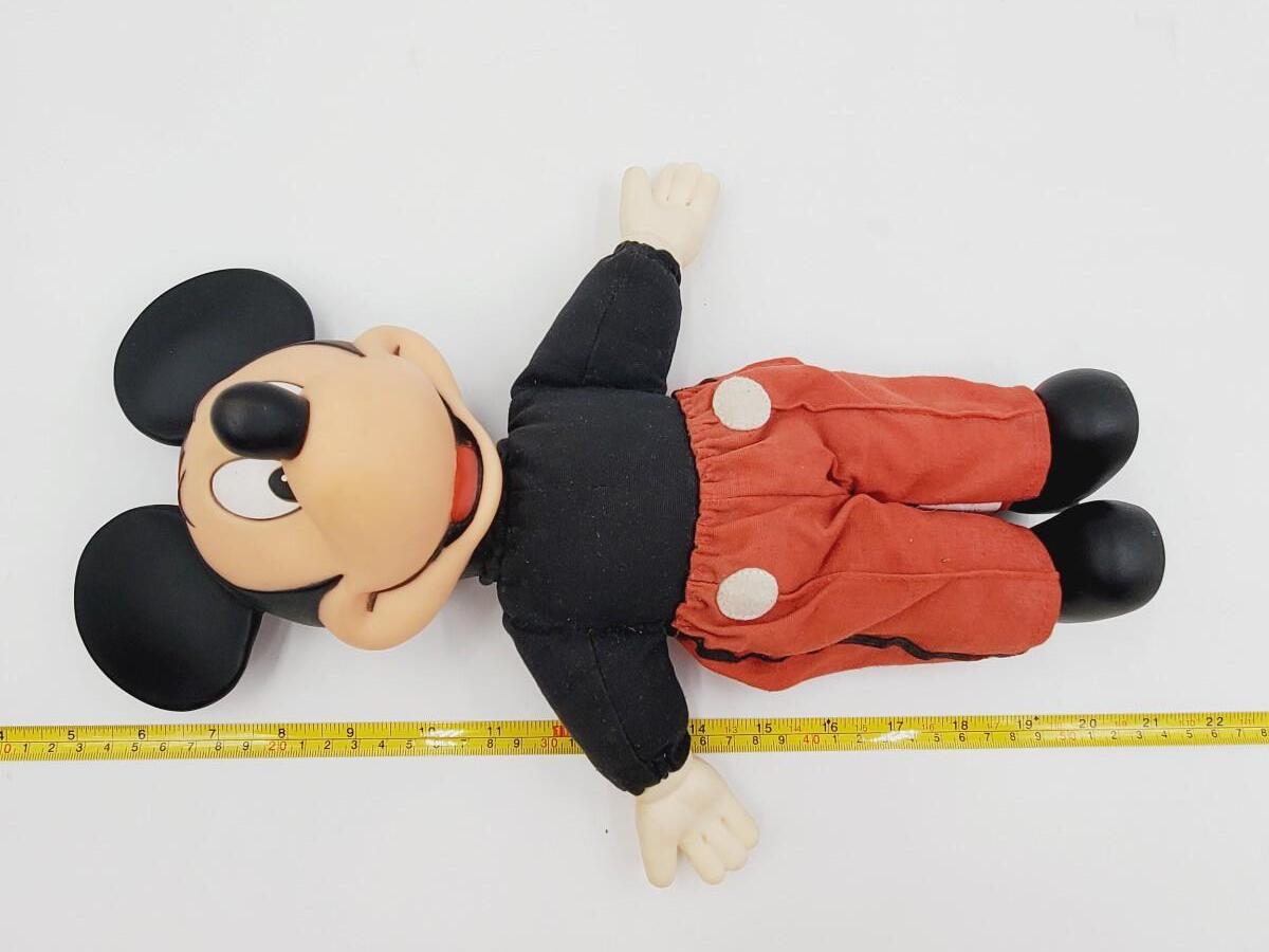 1970s Disney 15 inch Mickey Mouse in tuxedo pants. Mickey has a soft body and hard plastic face, hands/gloves and shoes. Very minimal wear, in good overall condition!!