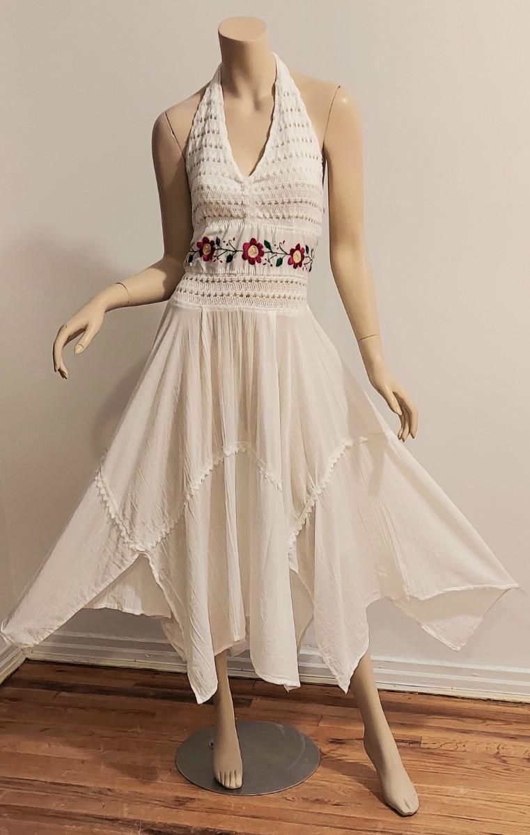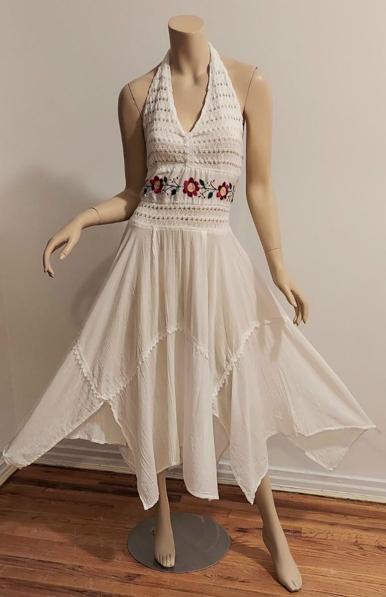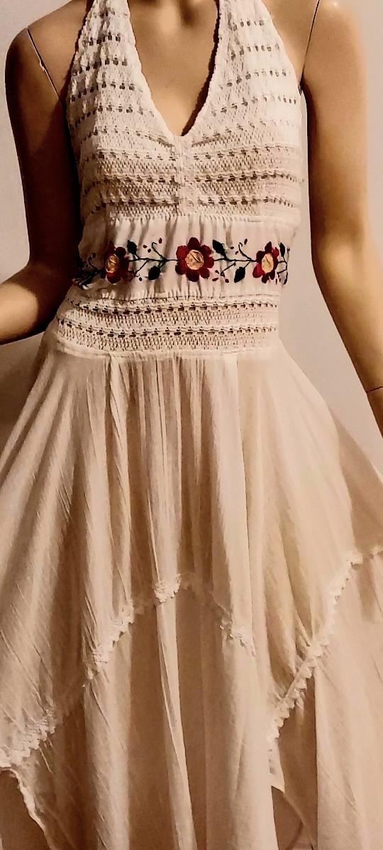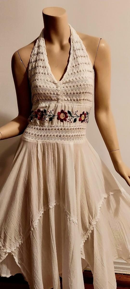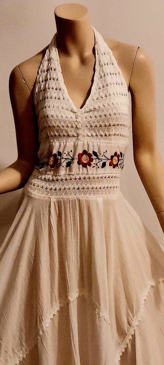 1970's Embroidered Crepe cotton Halter Dress Asymmetrical Hem/Crochet Bodice