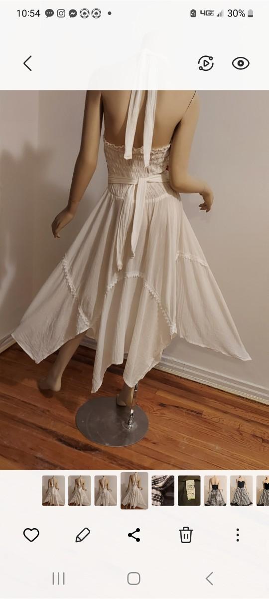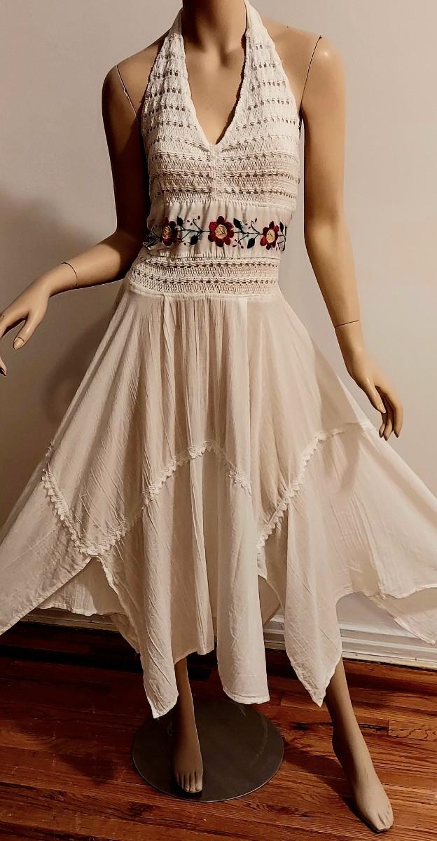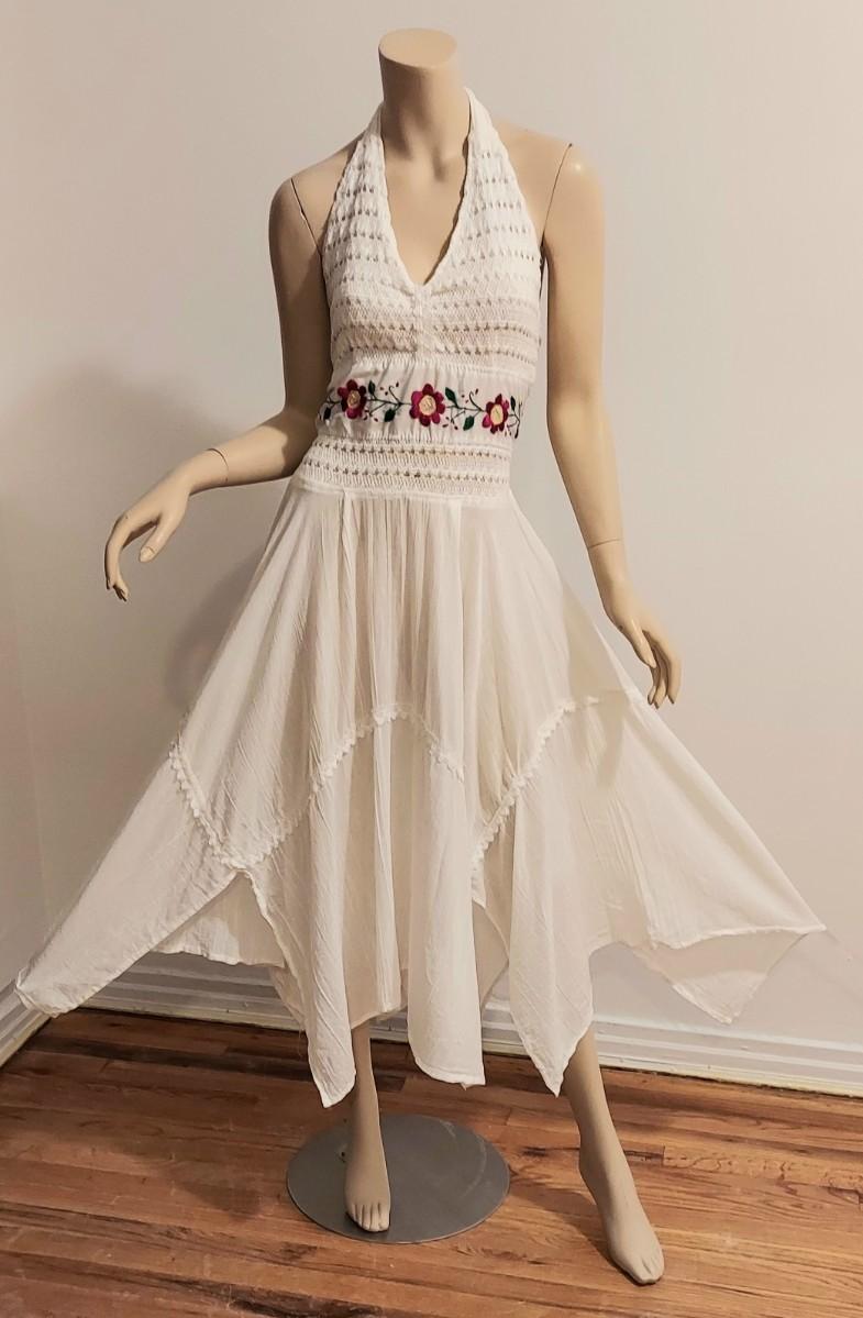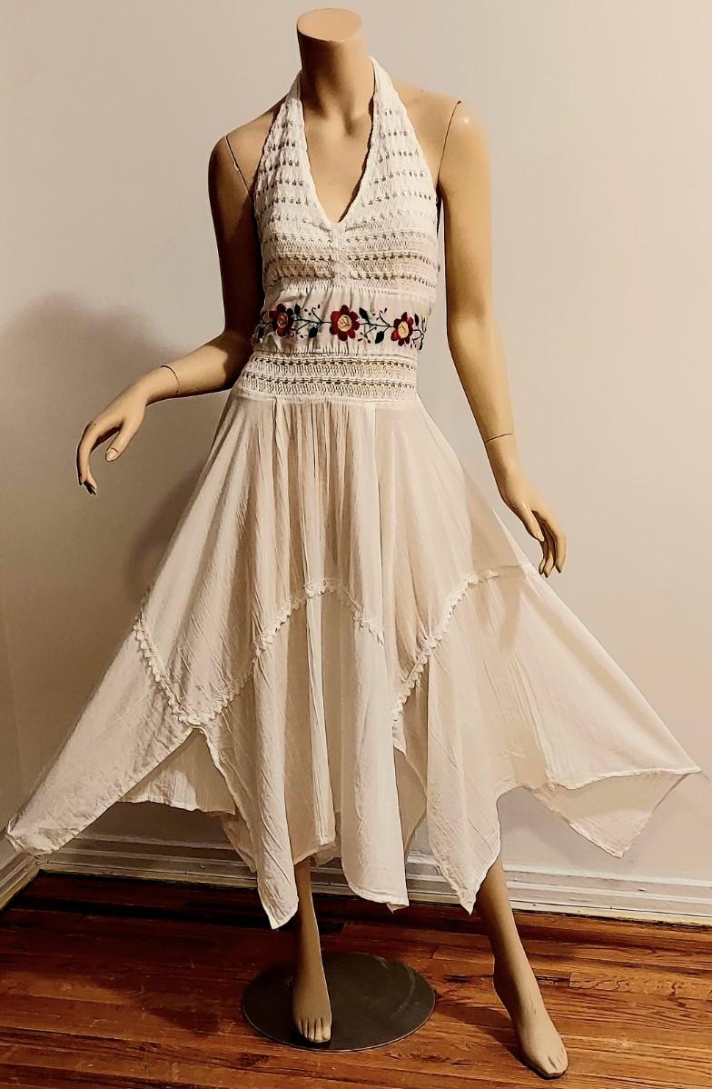 1970's Embroidered Crepe cotton Halter Dress Asymmetrical Hem/Crochet Bodice