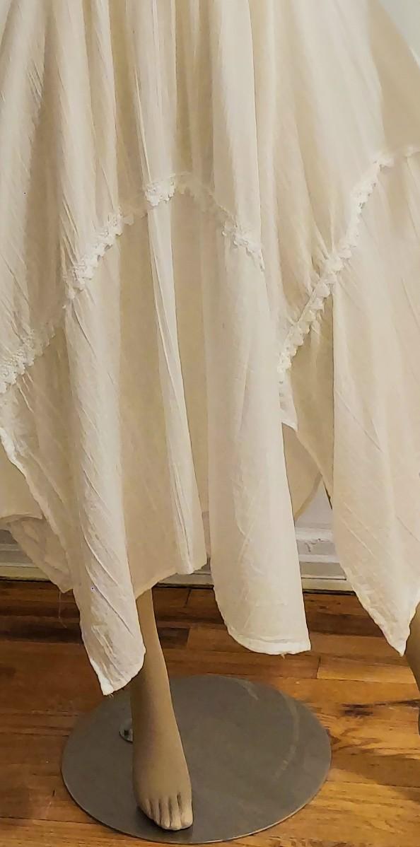 What an Amazing Beauty this Asymmetrical Crepe Gauze dress is. Embroidery at Bodice Midriff with Crochet Lace