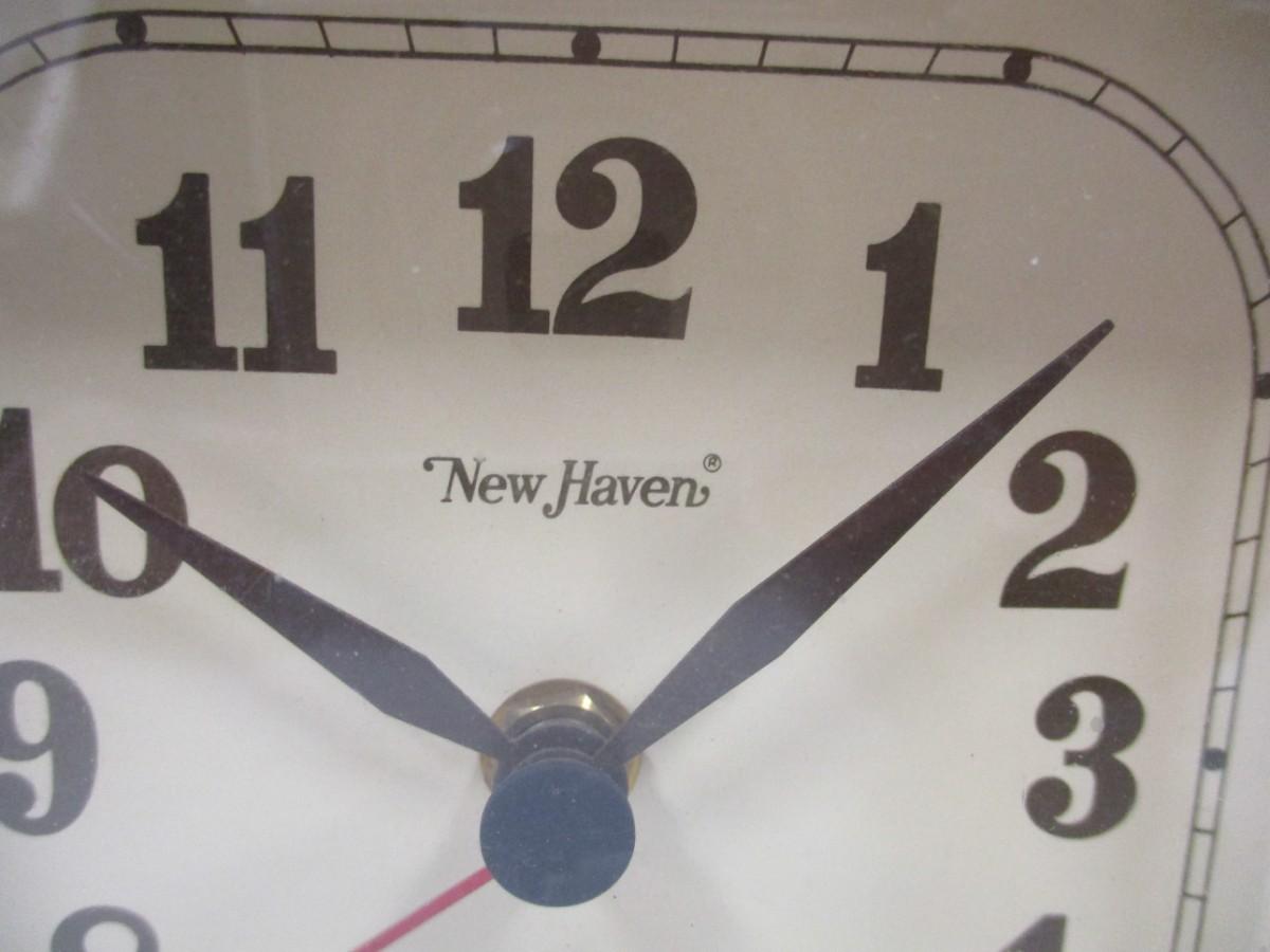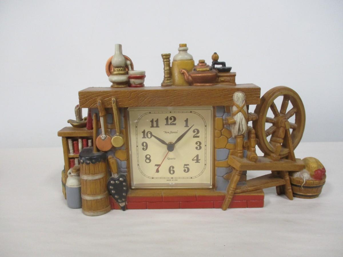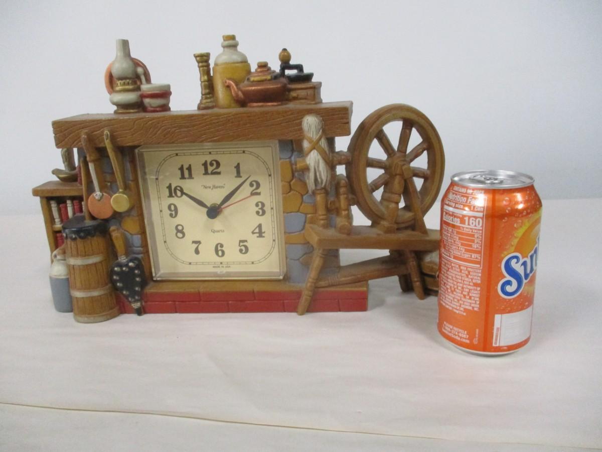 New Haven Plastic Clock Colonial Fireplace Spinning Wheel