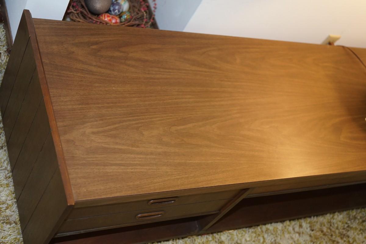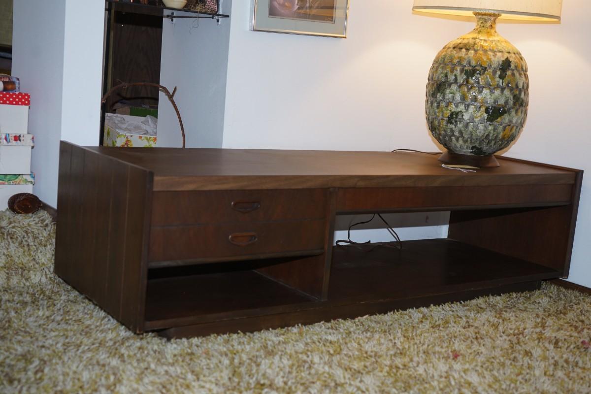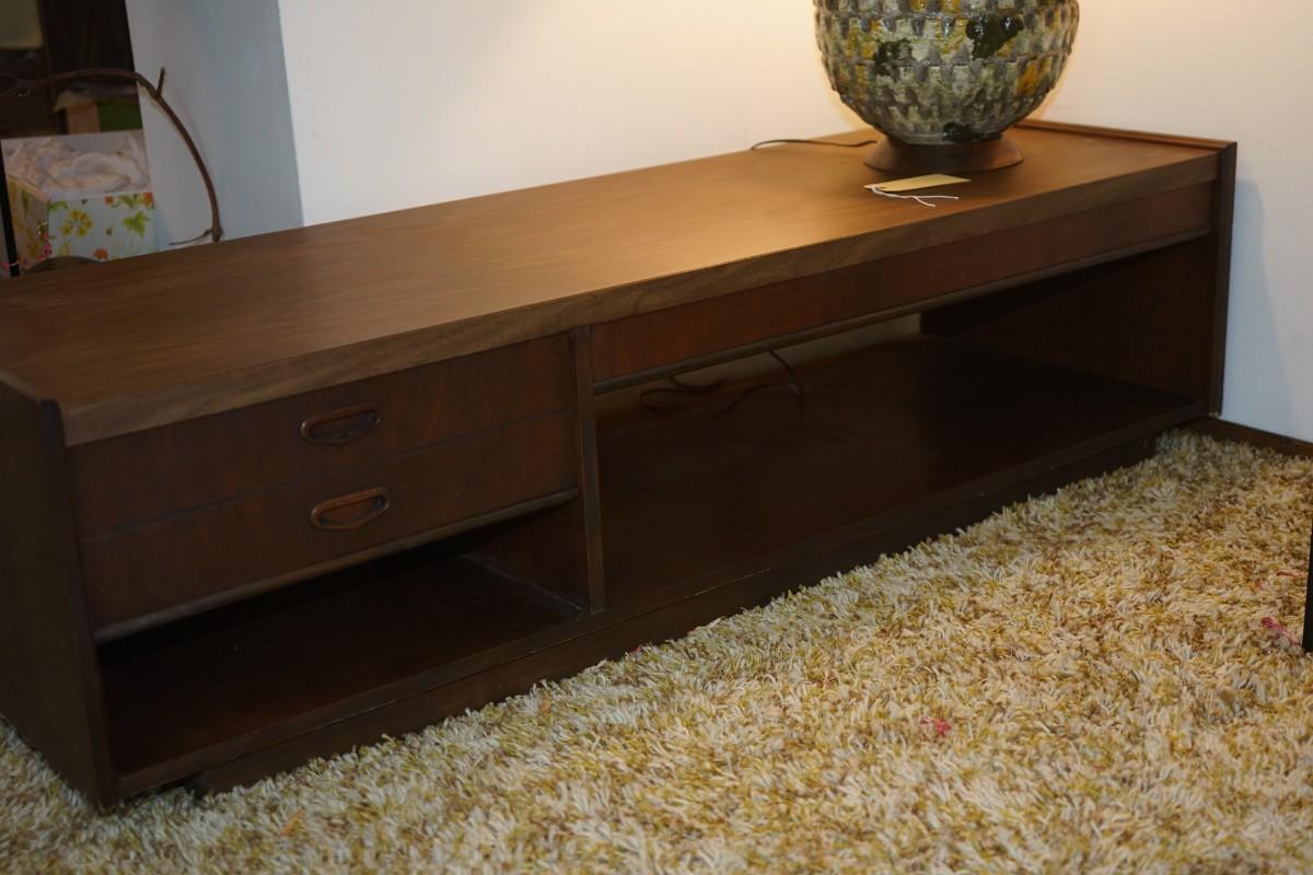 this table would make a great TV table due to the long Formica top, lower shelf with open back and a drawer to store remotes etc.