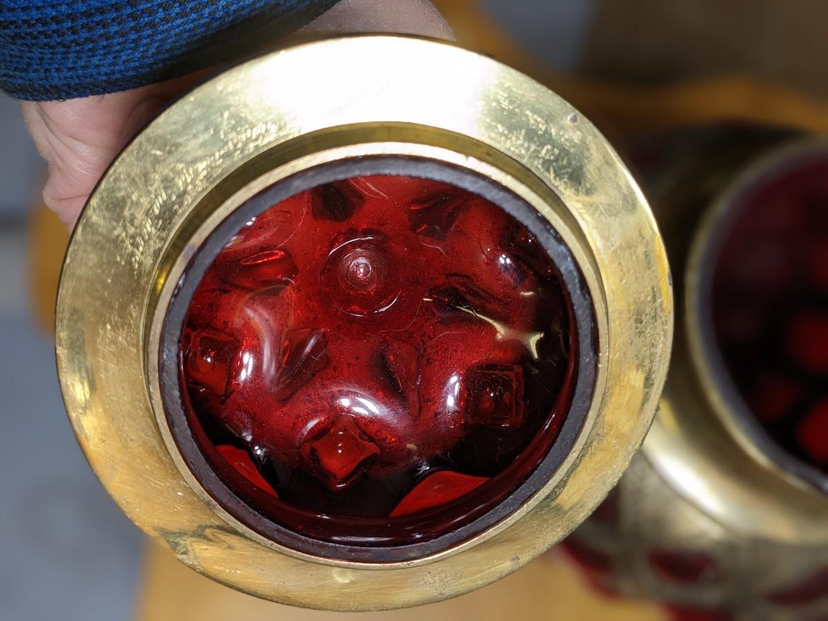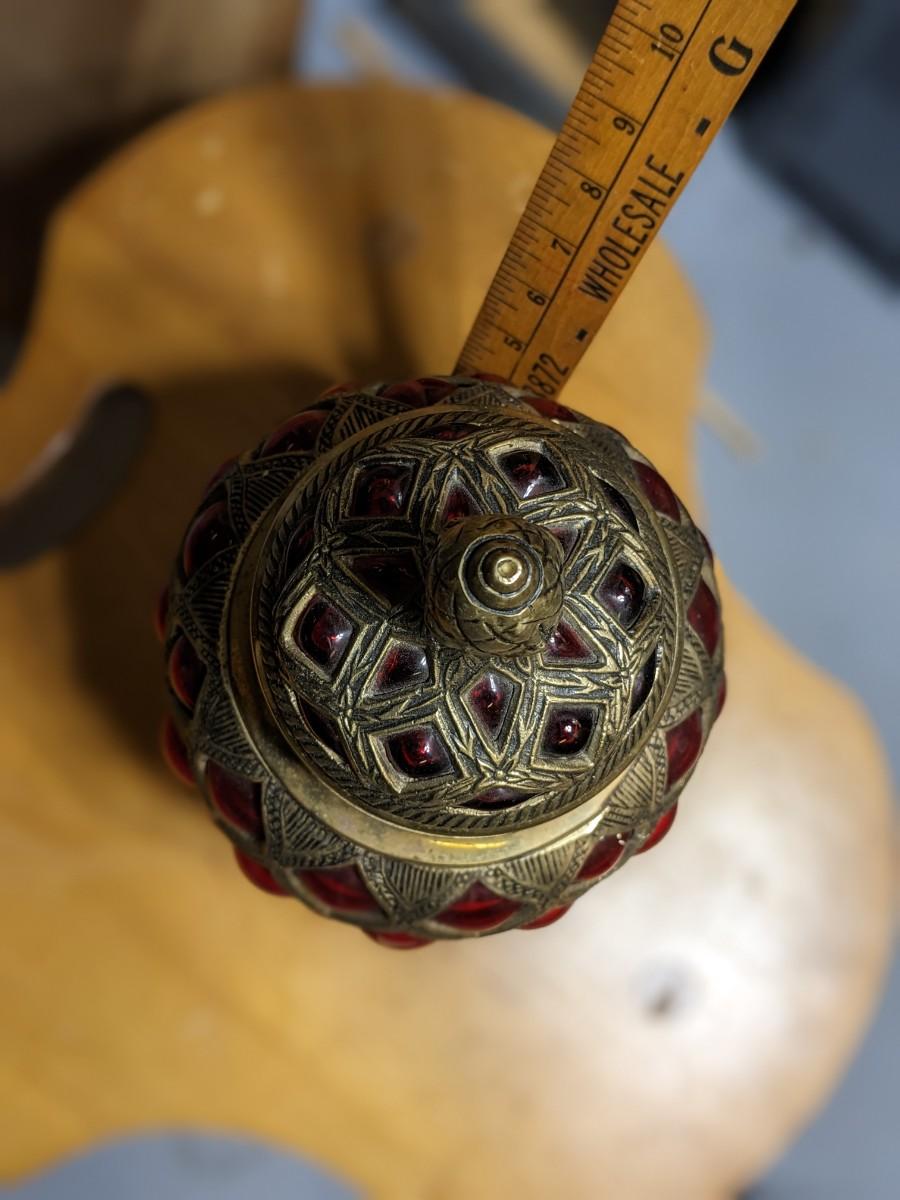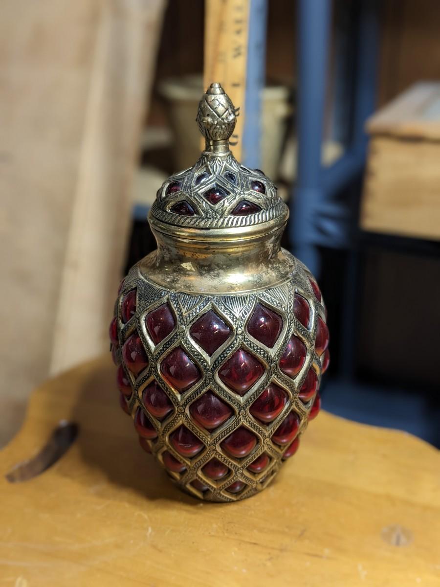 Beautiful vintage blown glass jar with silver metal overlay. Pierced metal removable lid.