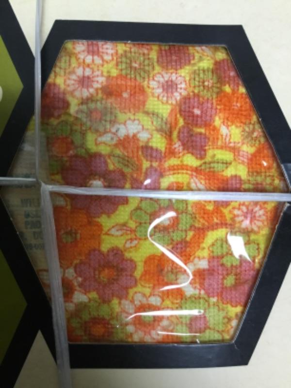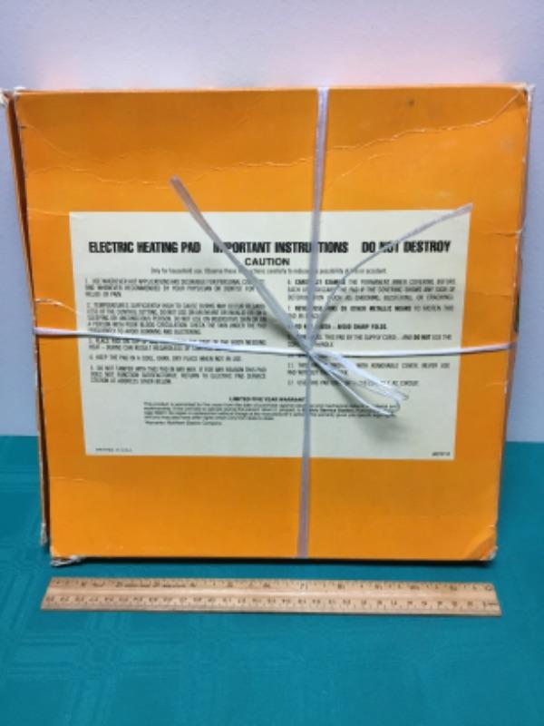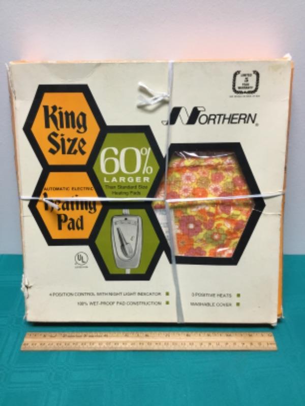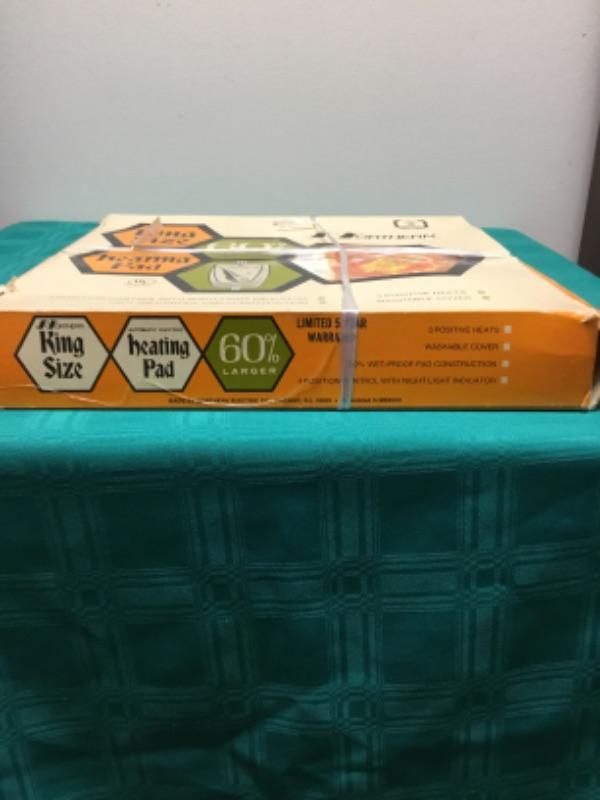 Heating pad is NIB. Electronic three setting, with an orange, yellow, purple, and green floral pattern.