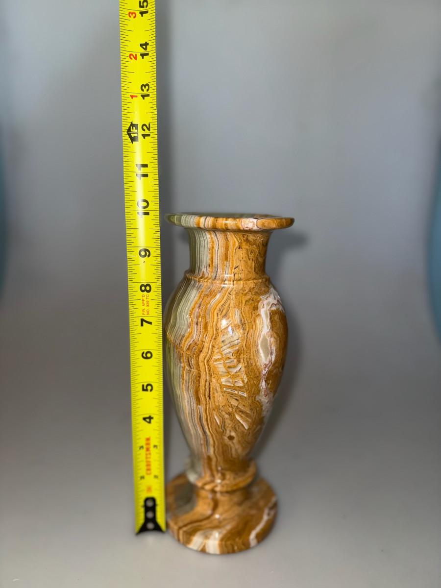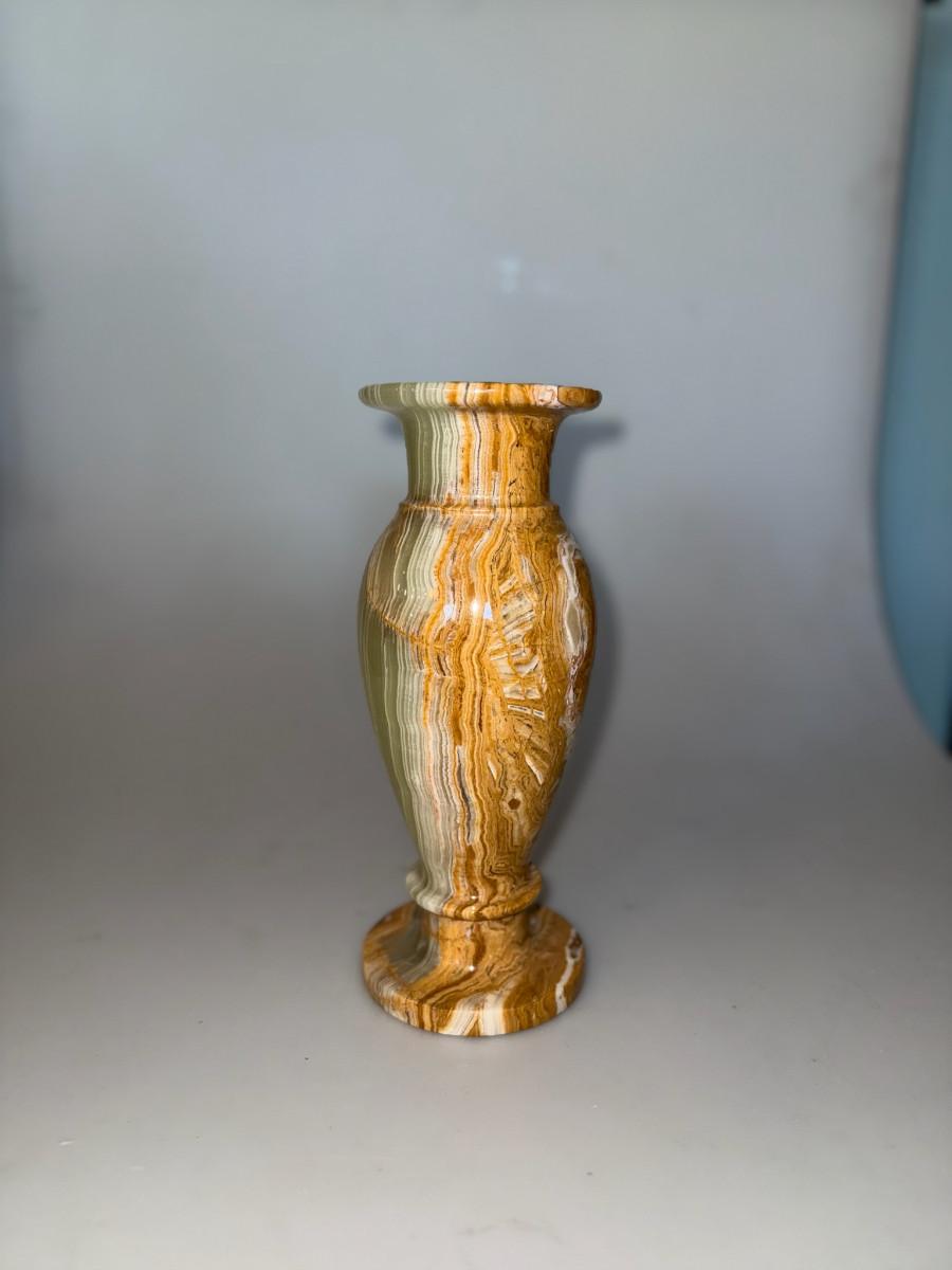Whether placed on a mantel, table, or shelf, the 1970s Onyx Striped Stone Vase brings warmth and sophistication to any room. Embrace the timeless allure of natural stone and add this beautiful vase to your collection today!