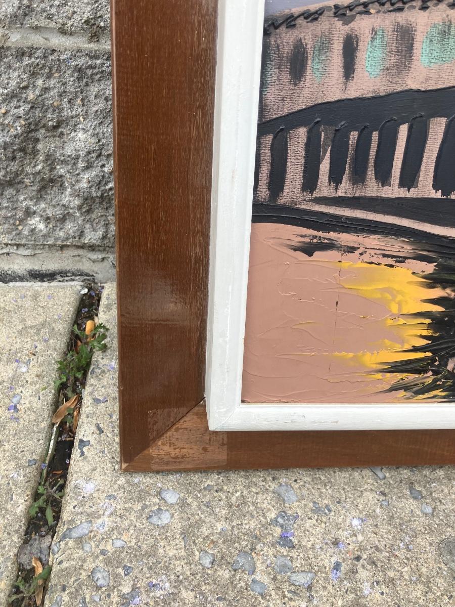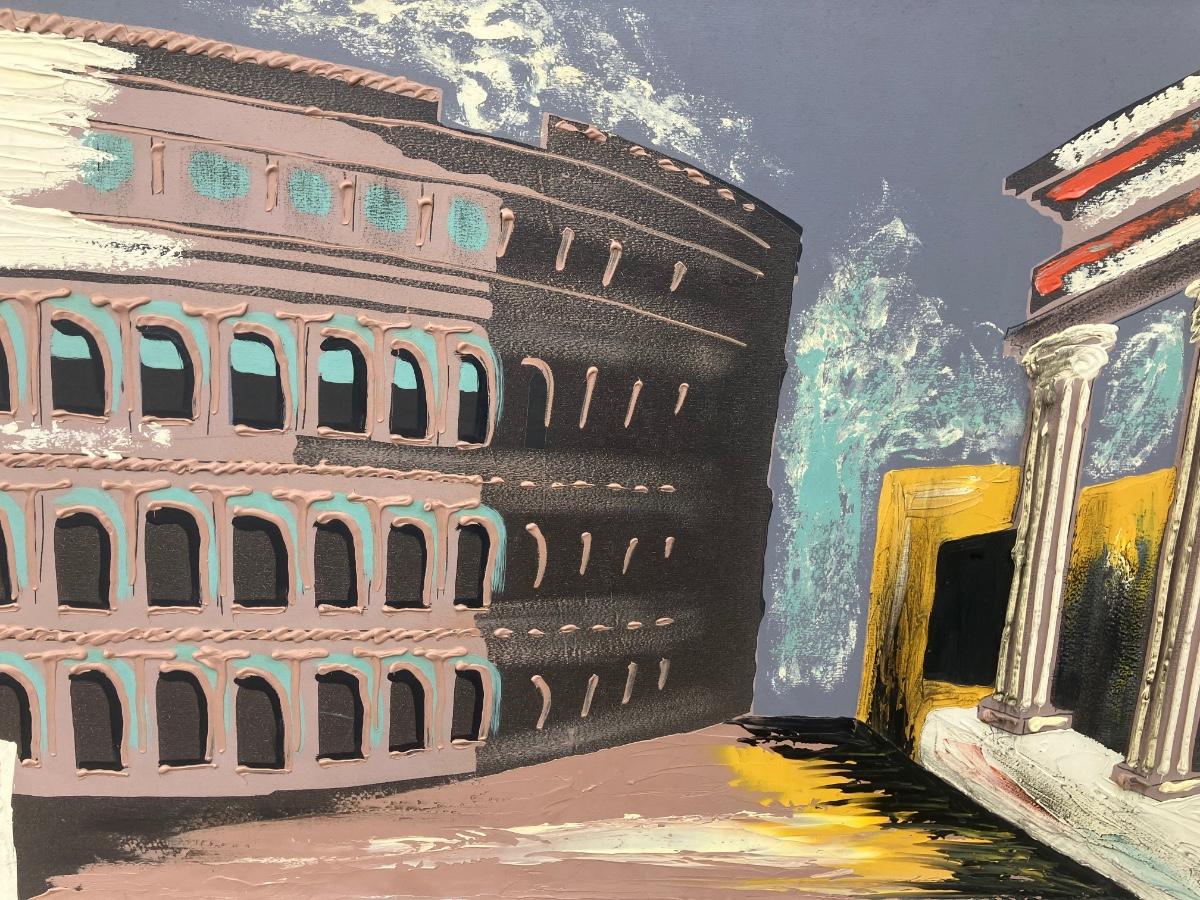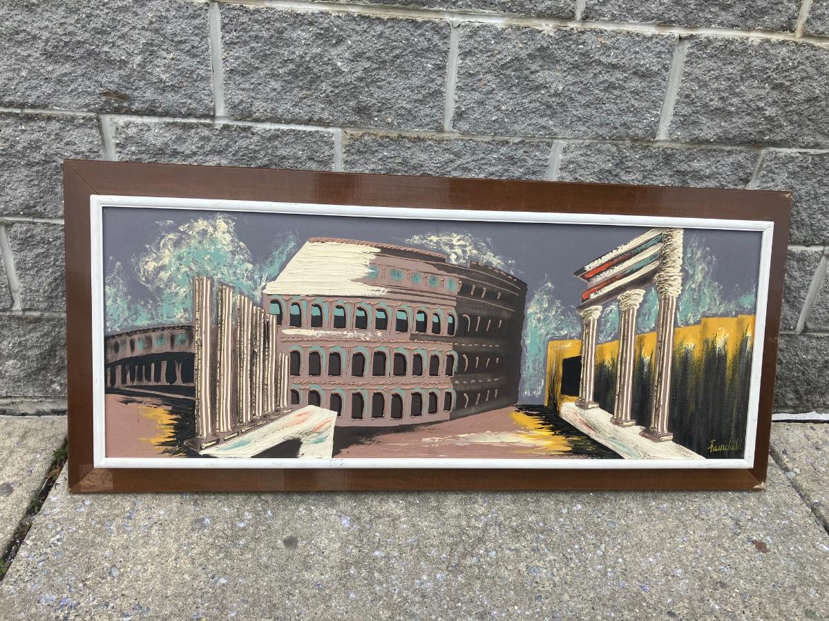 This striking original oil painting on board captures the timeless grandeur of Rome's Colosseum in a sweeping panoramic vista, evoking the romance and decay of the ancient world. Rendered in a heavy impasto technique with a soft pastel palette of muted taupes, warm ochres, and hazy blues, the composition draws the viewer along a sunlit path flanked by weathered marble columns and triumphal arches, culminating in the majestic, weathered facade of the Flavian Amphitheatre. Ethereal veils of atmospheric mist soften the edges of the ruins, while golden highlights on the stonework suggest the play of late afternoon light, infusing the scene with a dreamlike nostalgia. Signed "Fairchild" in the lower right, the work measures 24 inches high by 54 inches wide (sight) and is presented in a classic wood frame with subtle gold accents, enhancing its vintage appeal. Likely mid-20th century, this piece reflects a post-impressionist sensibility, blending historical reverence with impressionistic freedom—ideal for collectors of European landscapes or architectural antiquities.