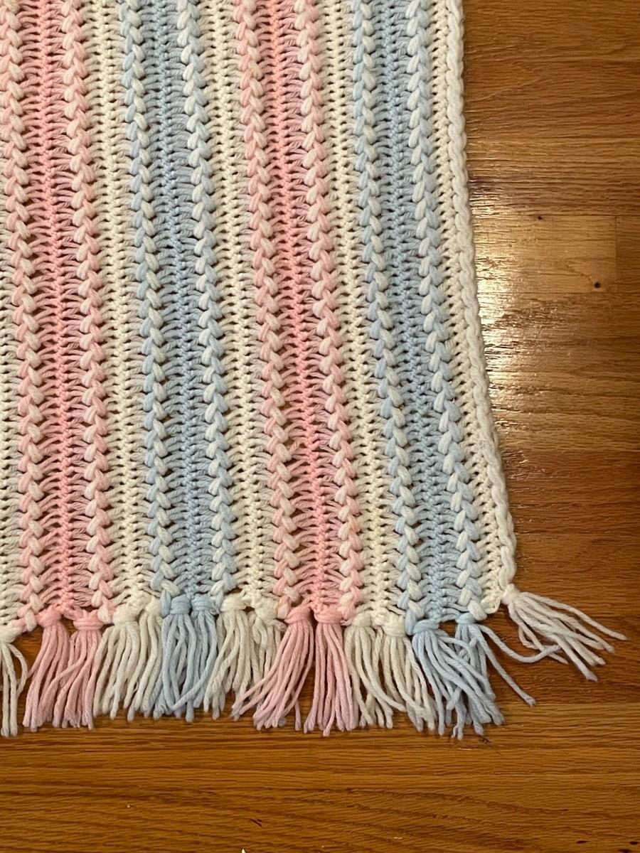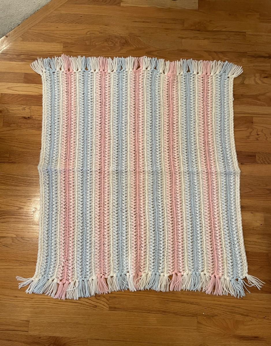 This was made by the consignor's mother for the consignor's first child. It is mile a minute afghan pattern and measures about 43 inches by 49 inches and in excellent condition.