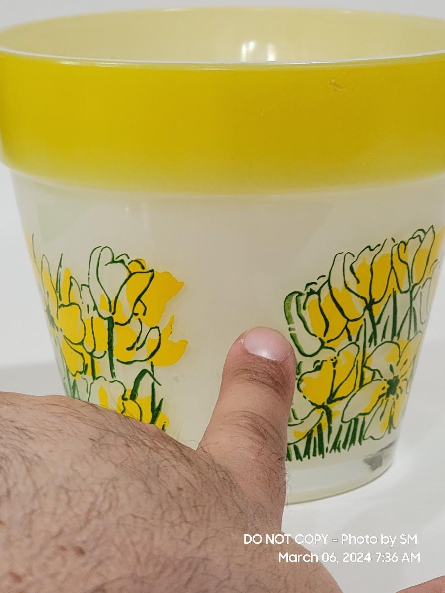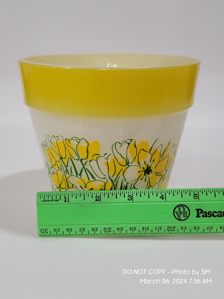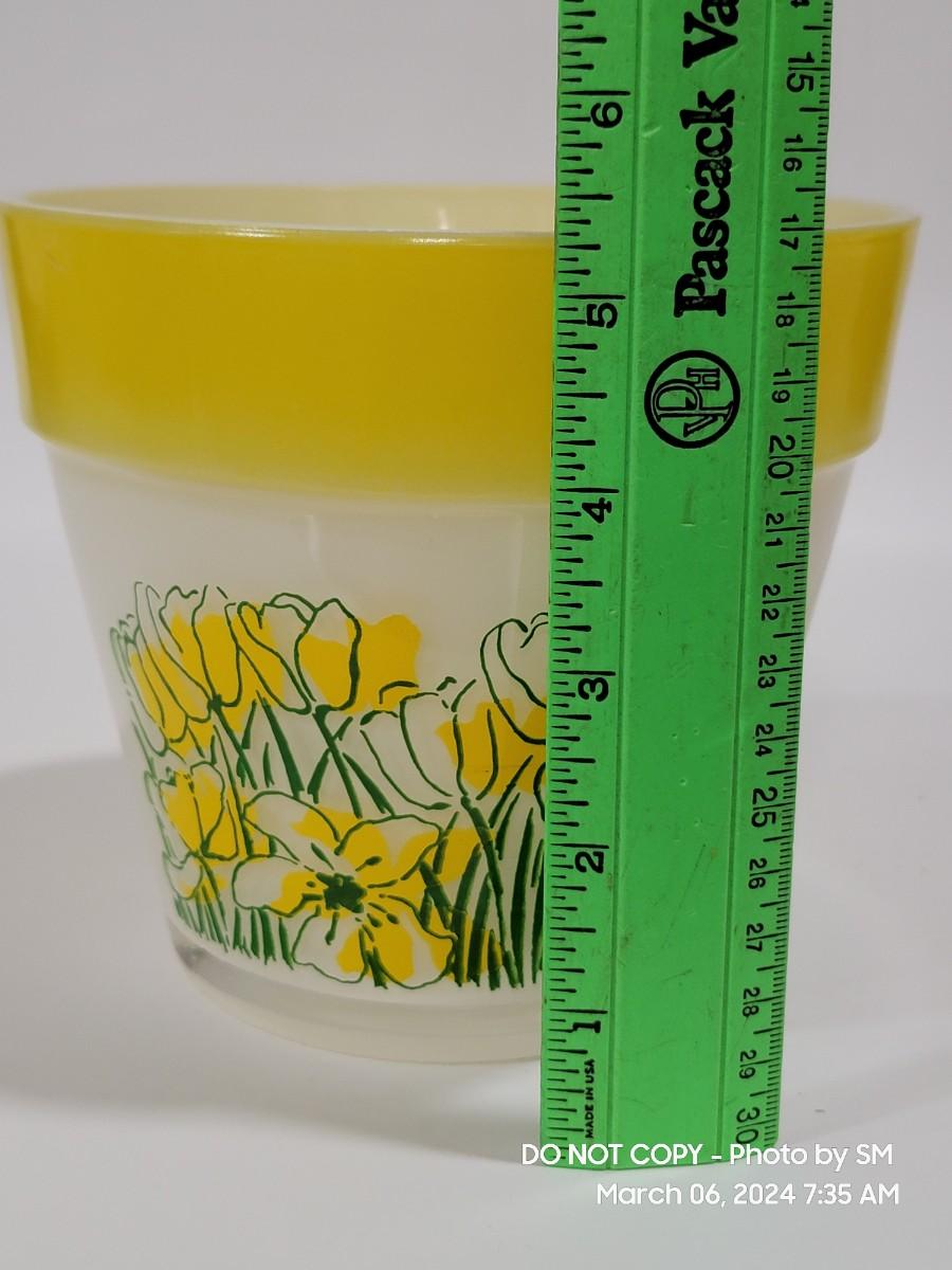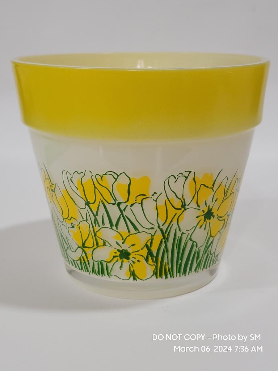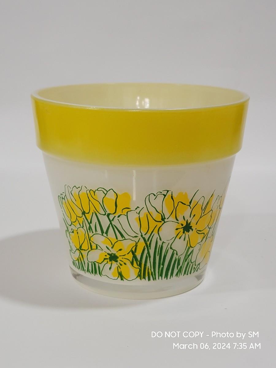This bold pop of color is so groovy! Retro, it's a glass or glass like pot. Inside is milky (like pyrex, if you know what I mean), the top rim seems to be frosted yellow glass - not paint. The flowers seem painted and has a few minor scratches. Overall stunning and a great piece for the art glass lovers.