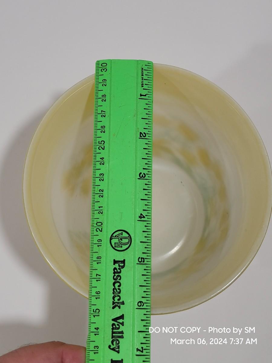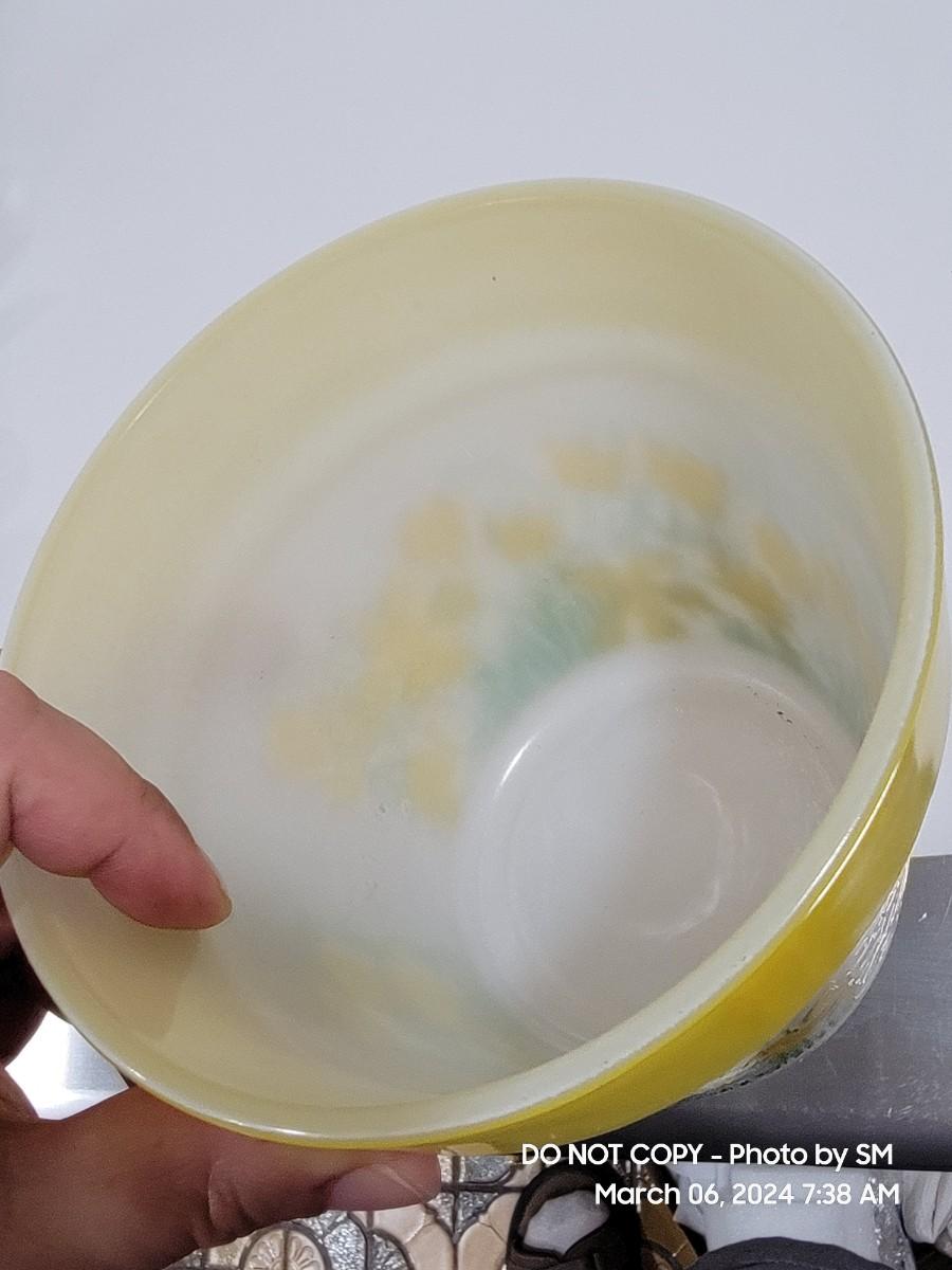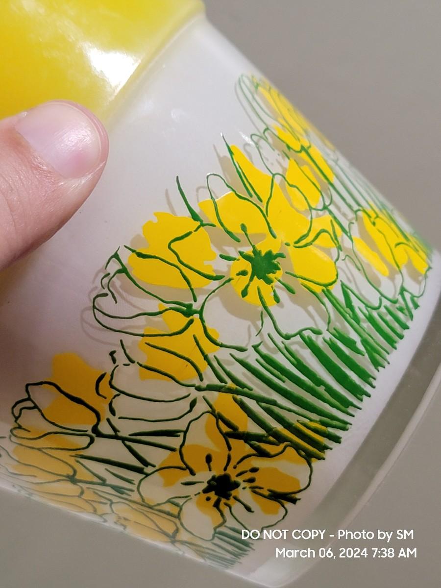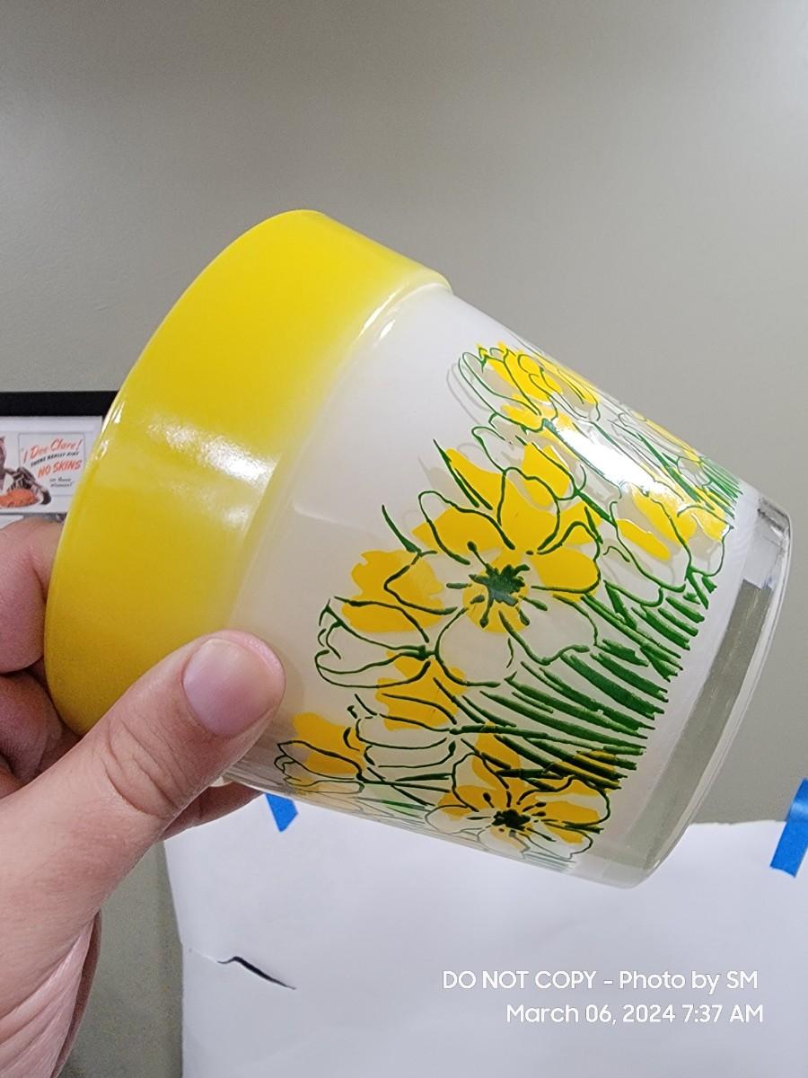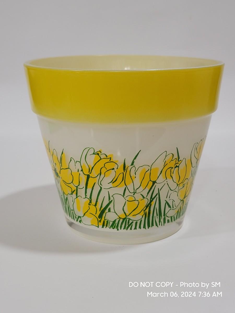This bold pop of color is so groovy! Retro, it's a glass or glass like pot. Inside is milky (like pyrex, if you know what I mean), the top rim seems to be frosted yellow glass - not paint. The flowers seem painted and has a few minor scratches. Overall stunning and a great piece for the art glass lovers.