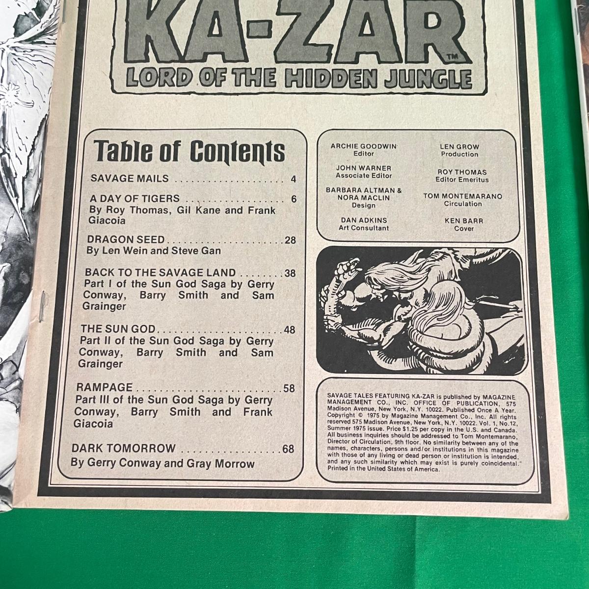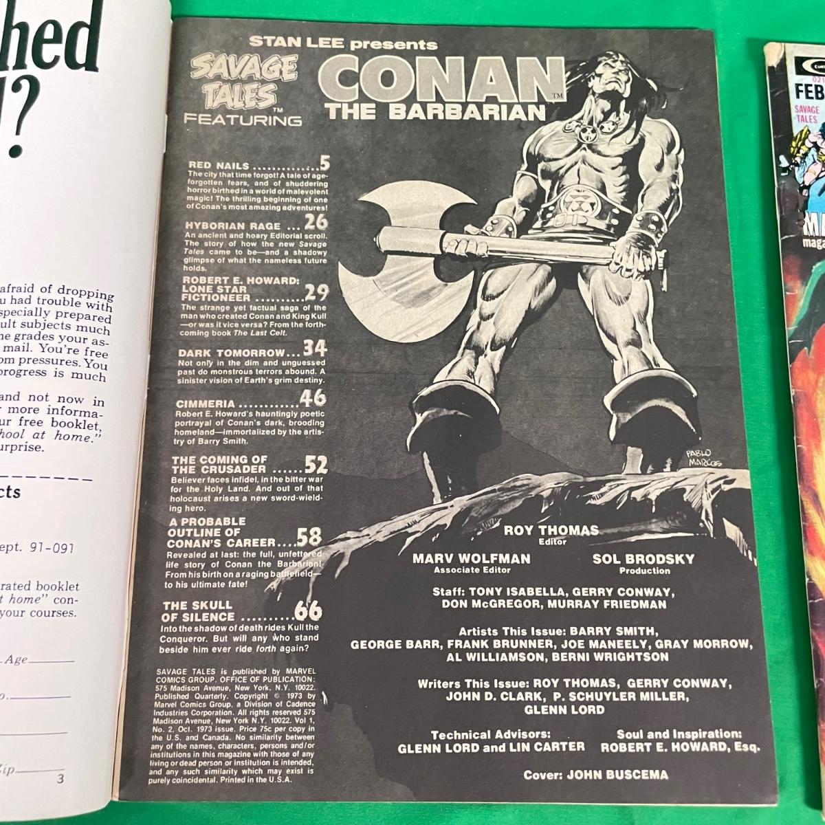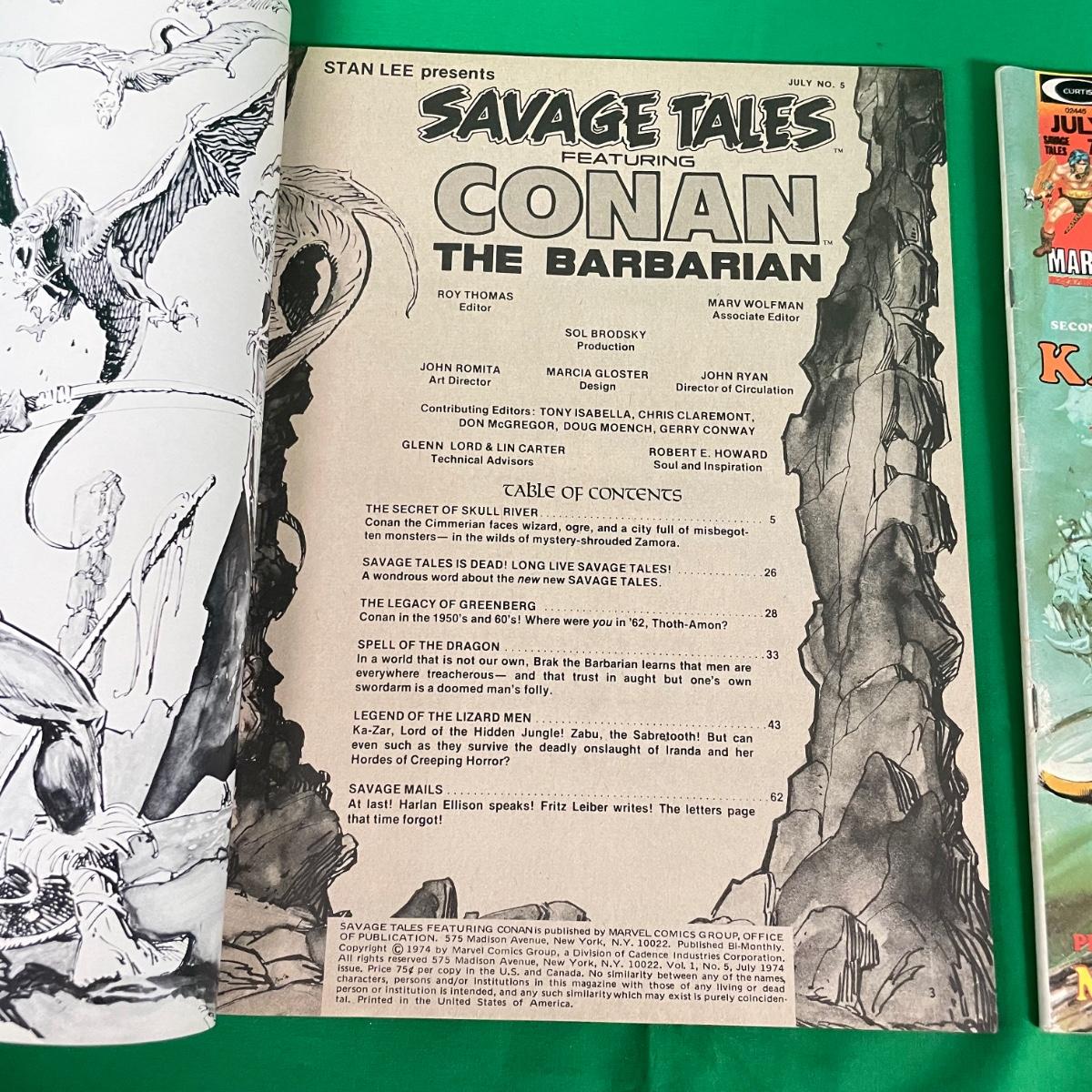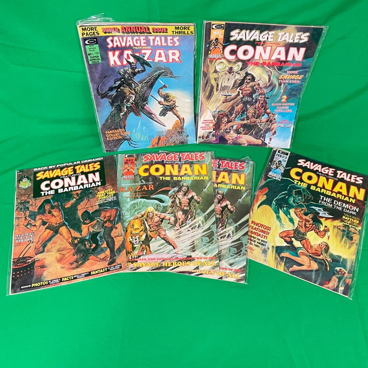 1973 Savage Tales featuring Conan the Barbarian and vol 1 #3. 1974’s volume 1 issues #4 and 5 (two copies of #5). Lot also features 1975’s No.1 Super Annual Issue of Savage Tales featuring Ka-Zar vol 1 #12. See images. Items are sold as-is. No returns or refunds. Please bid accordingly.