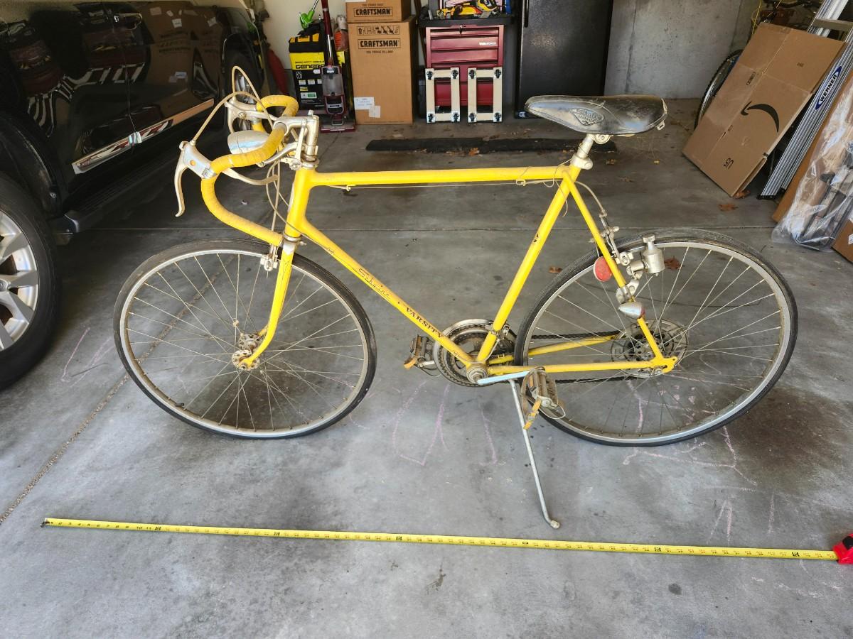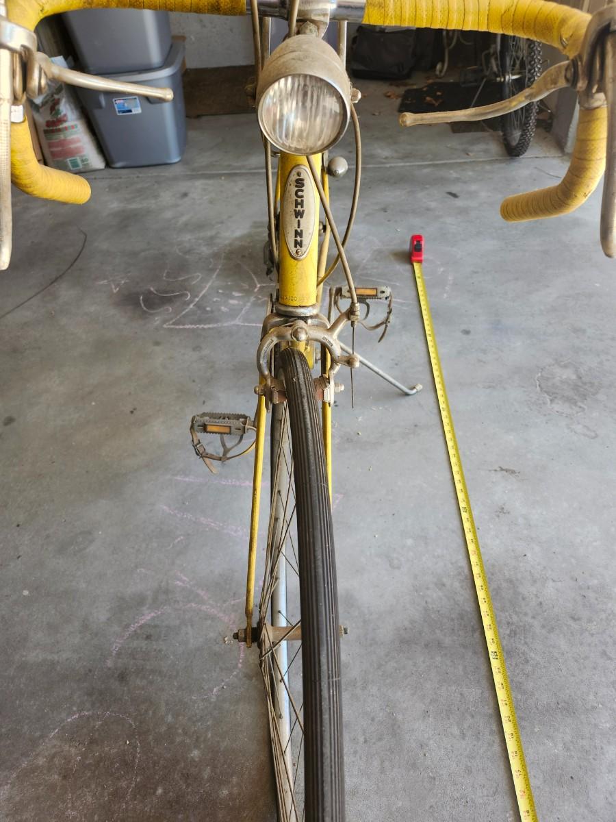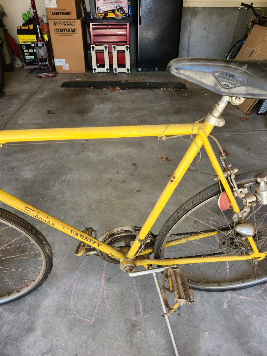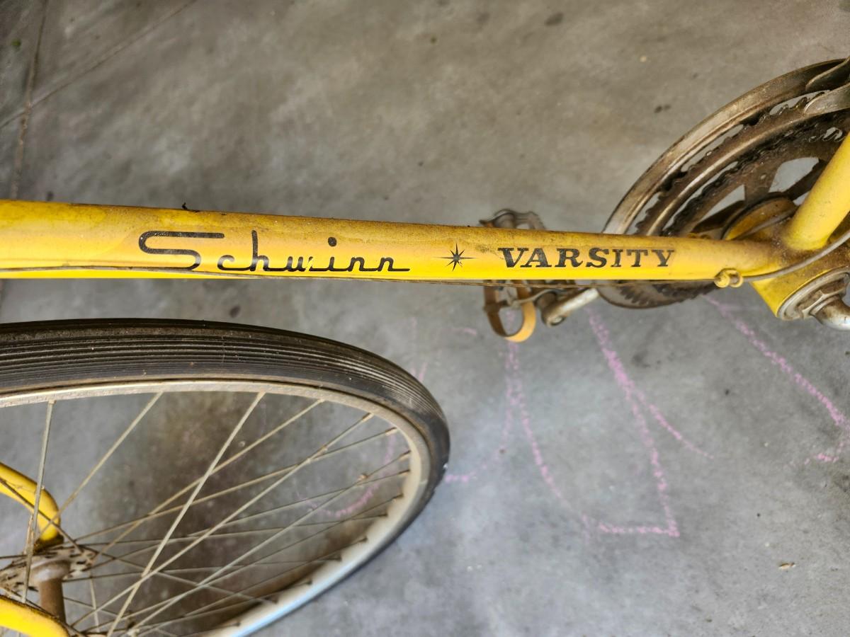 Schwinn Varsity 10 speed bike. The top tube is 26.5 from the ground on flat tires. This bike has been stored well and doesn't have the usual rust on all the parts. The tires do not hold air, and the cables are loose. The bike is all original