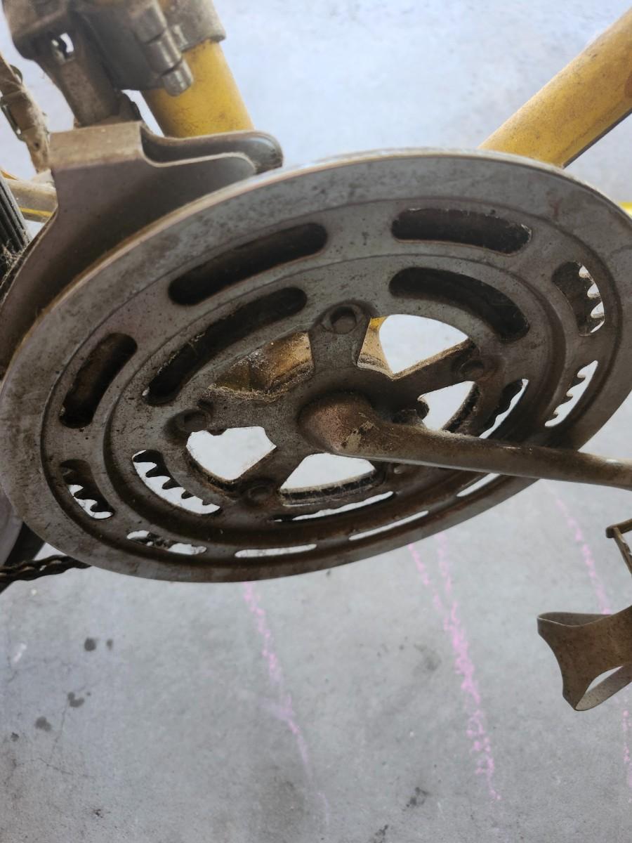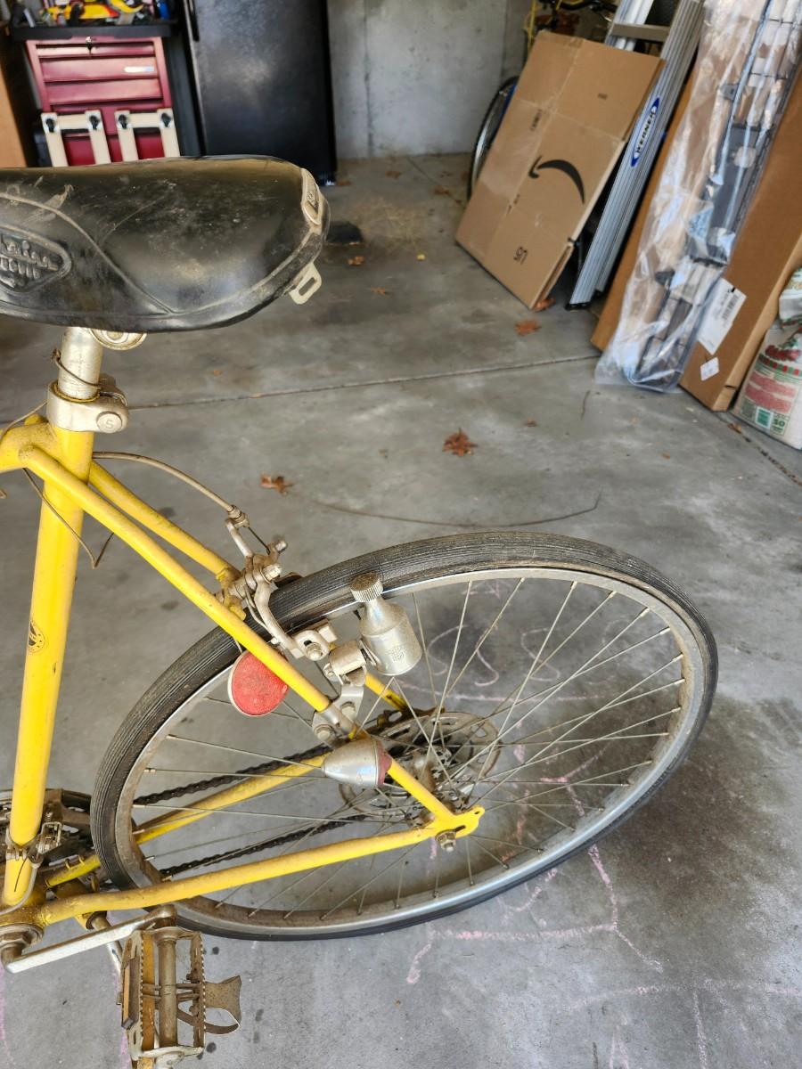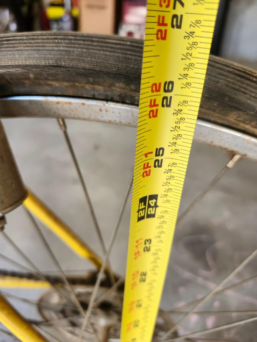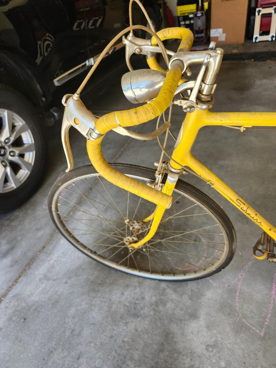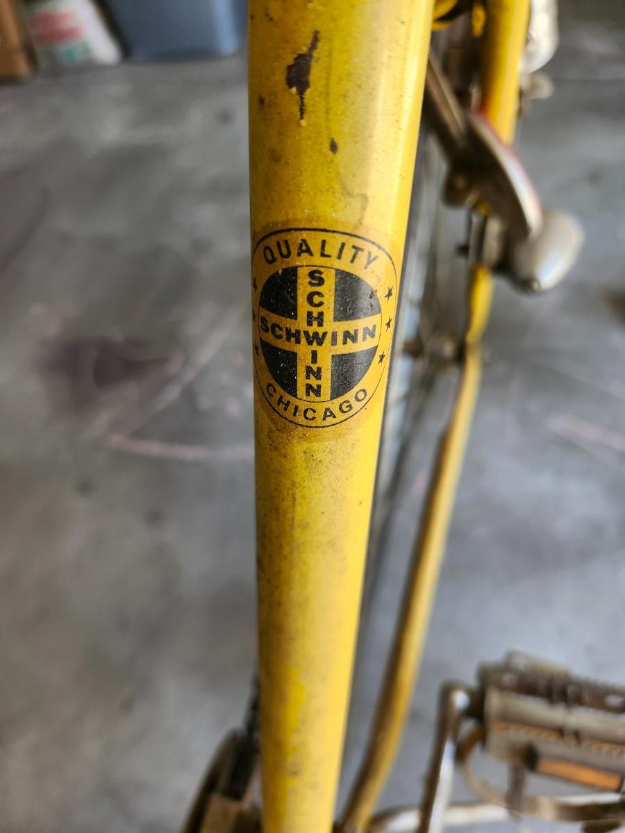 Schwinn Varsity 10 speed bike. The top tube is 26.5 from the ground on flat tires. This bike has been stored well and doesn't have the usual rust on all the parts. The tires do not hold air, and the cables are loose. The bike is all original