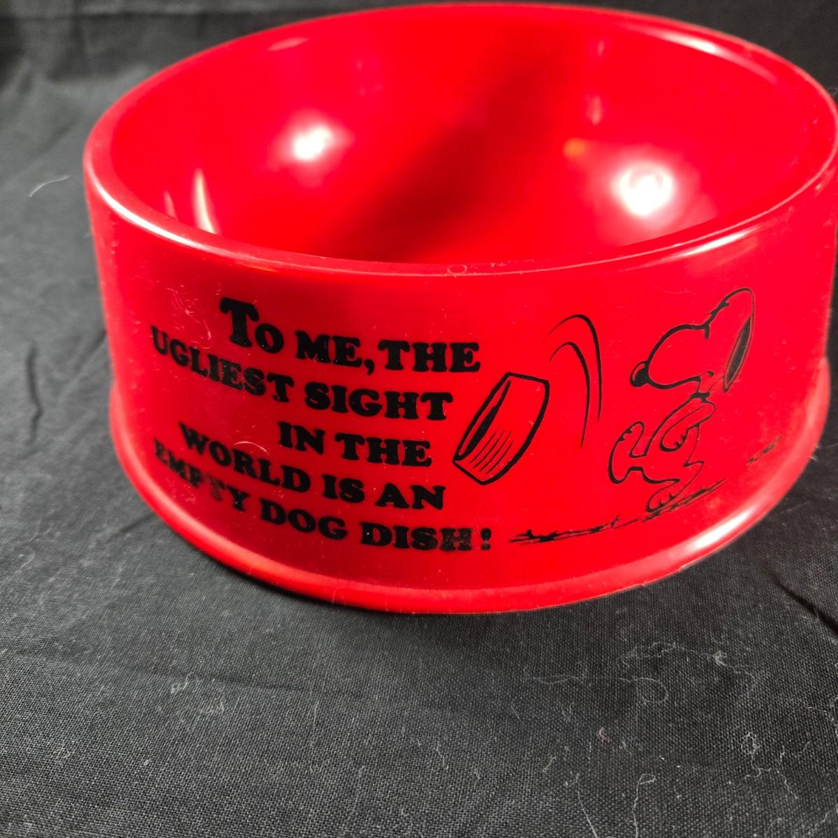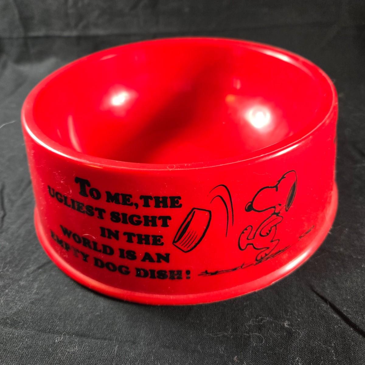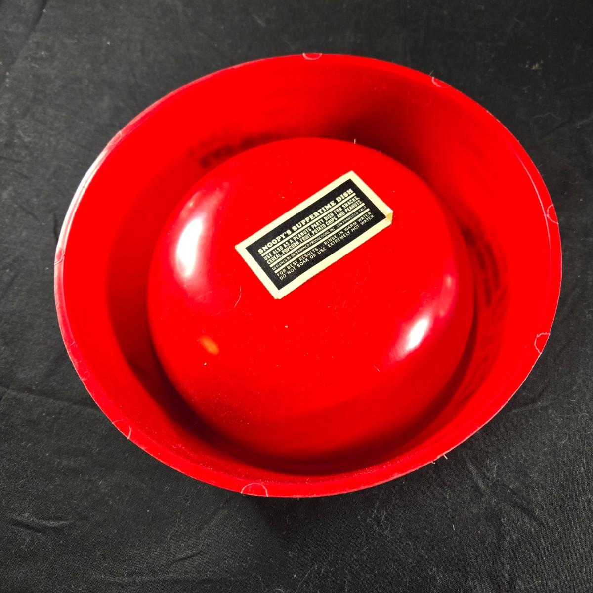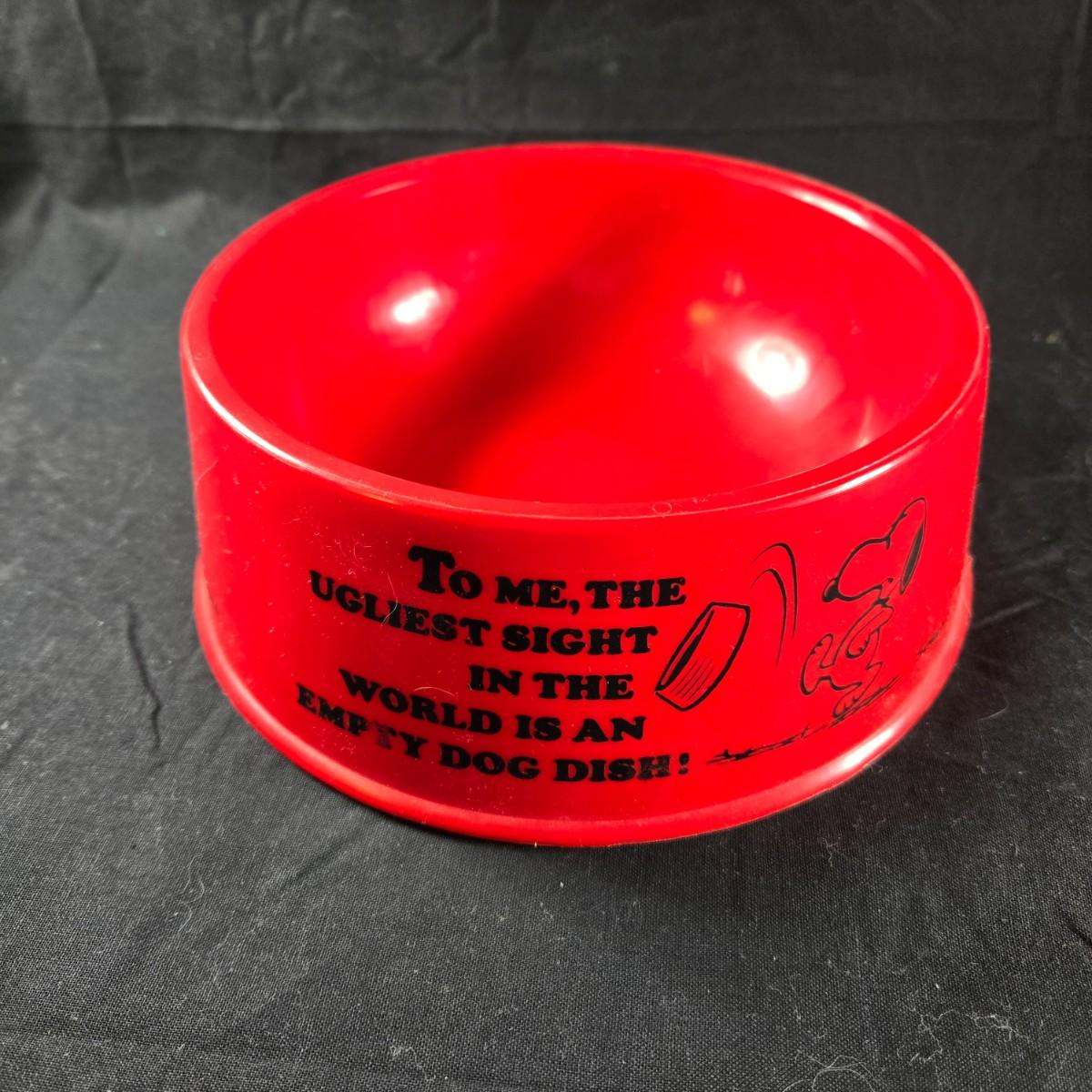 This auction lot is for a 1970's Snoopy Collector Dog Bowl. This is a full-sized red plastic dog bowl. It has graphics and wording on all sides of the red, round bowl that is in as new condition. The bowl appears to be unused. It is about 8-inches in diameter x 3-inches tall. It is dated 1970.