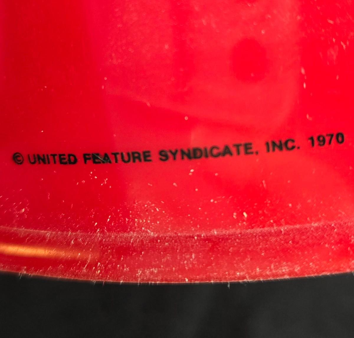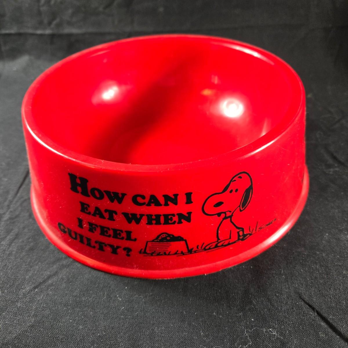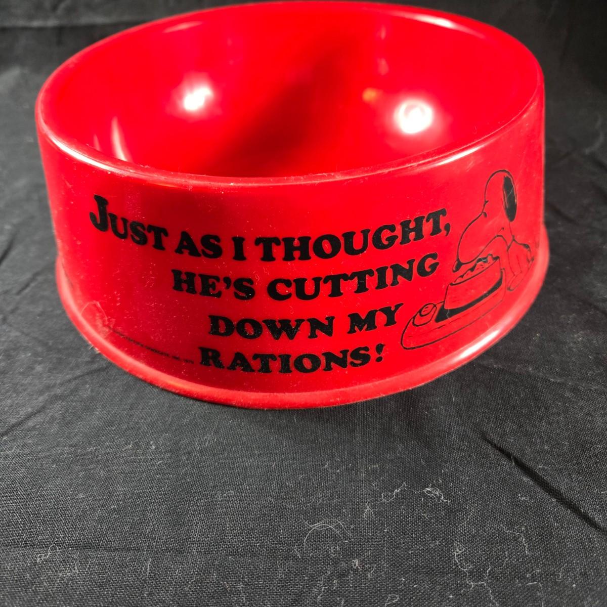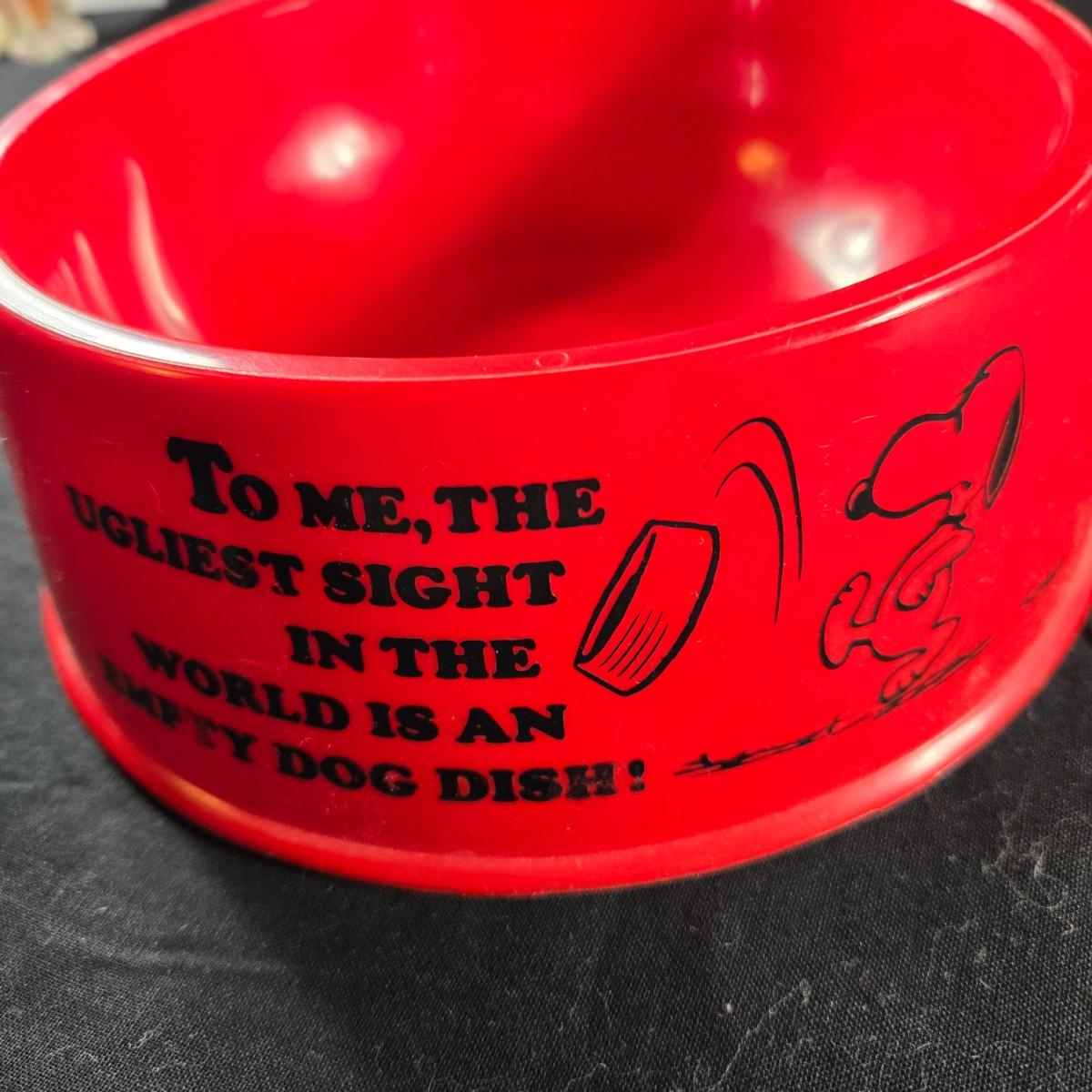 This auction lot is for a 1970's Snoopy Collector Dog Bowl. This is a full-sized red plastic dog bowl. It has graphics and wording on all sides of the red, round bowl that is in as new condition. The bowl appears to be unused. It is about 8-inches in diameter x 3-inches tall. It is dated 1970.