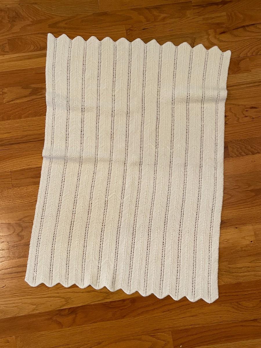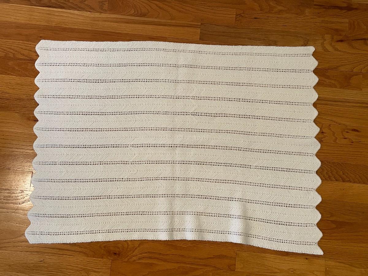 This afghan is 36 inches long and 25.5 inches wide with a scalloped edge. It is in excellent condition.