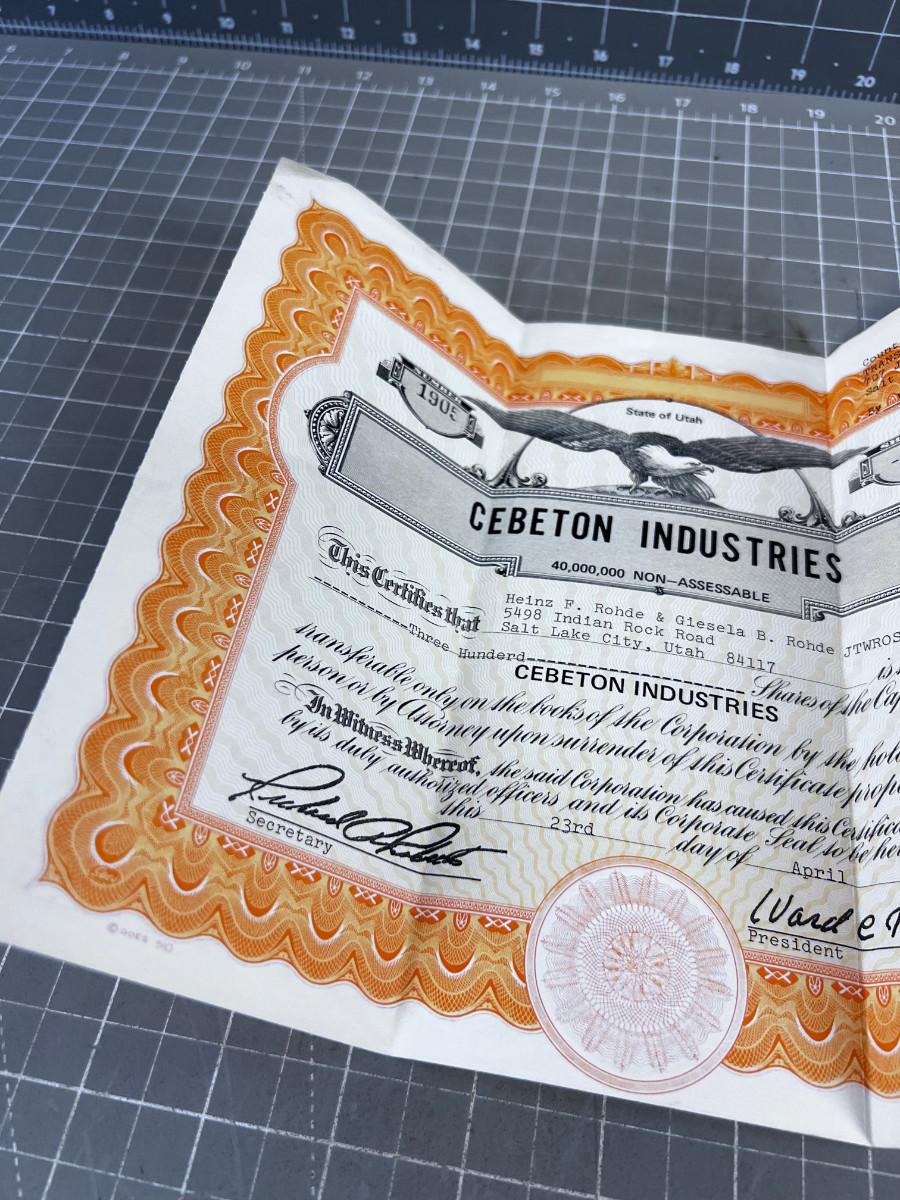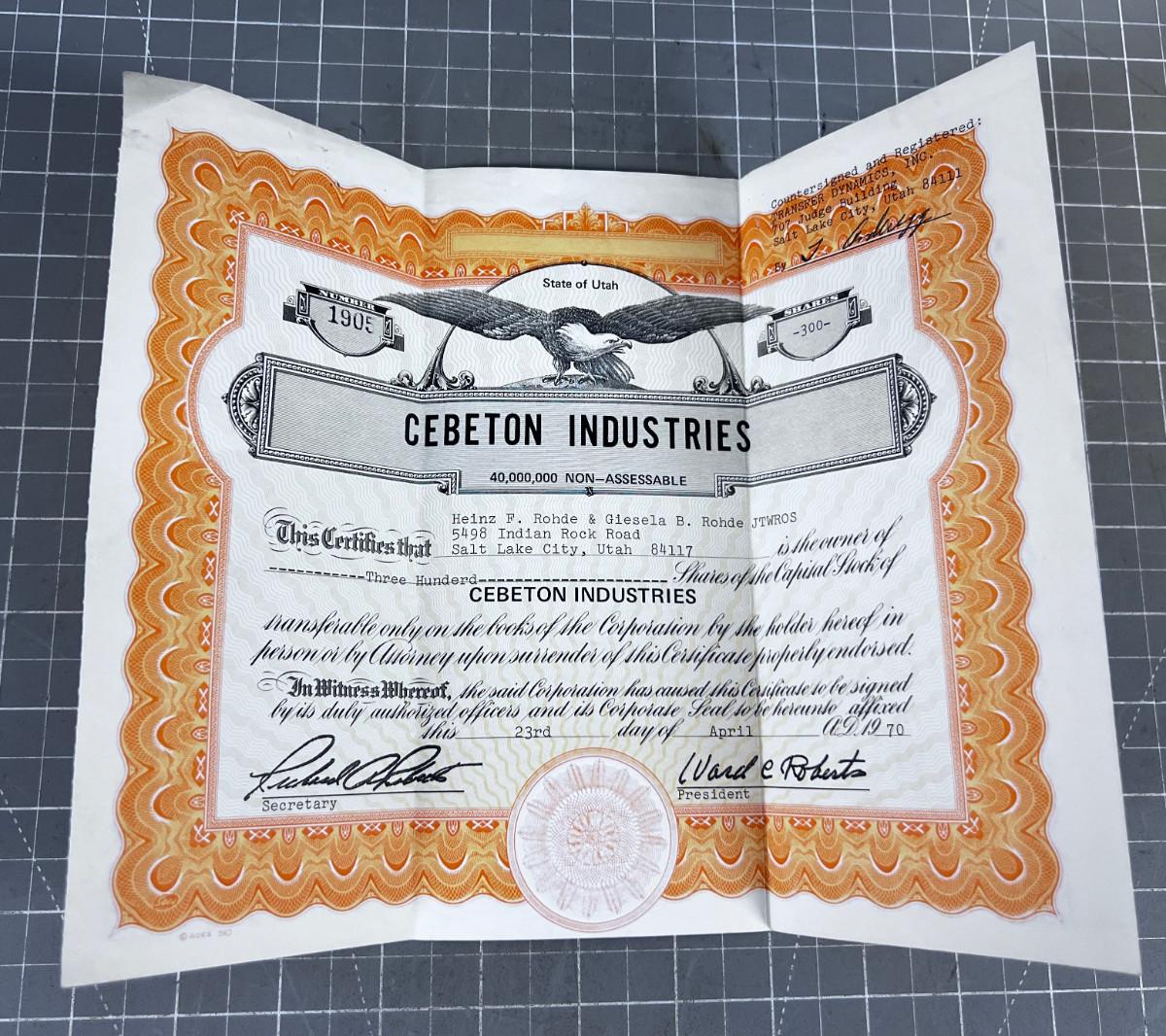 1970's Stock Certificate CEBETON Industries
